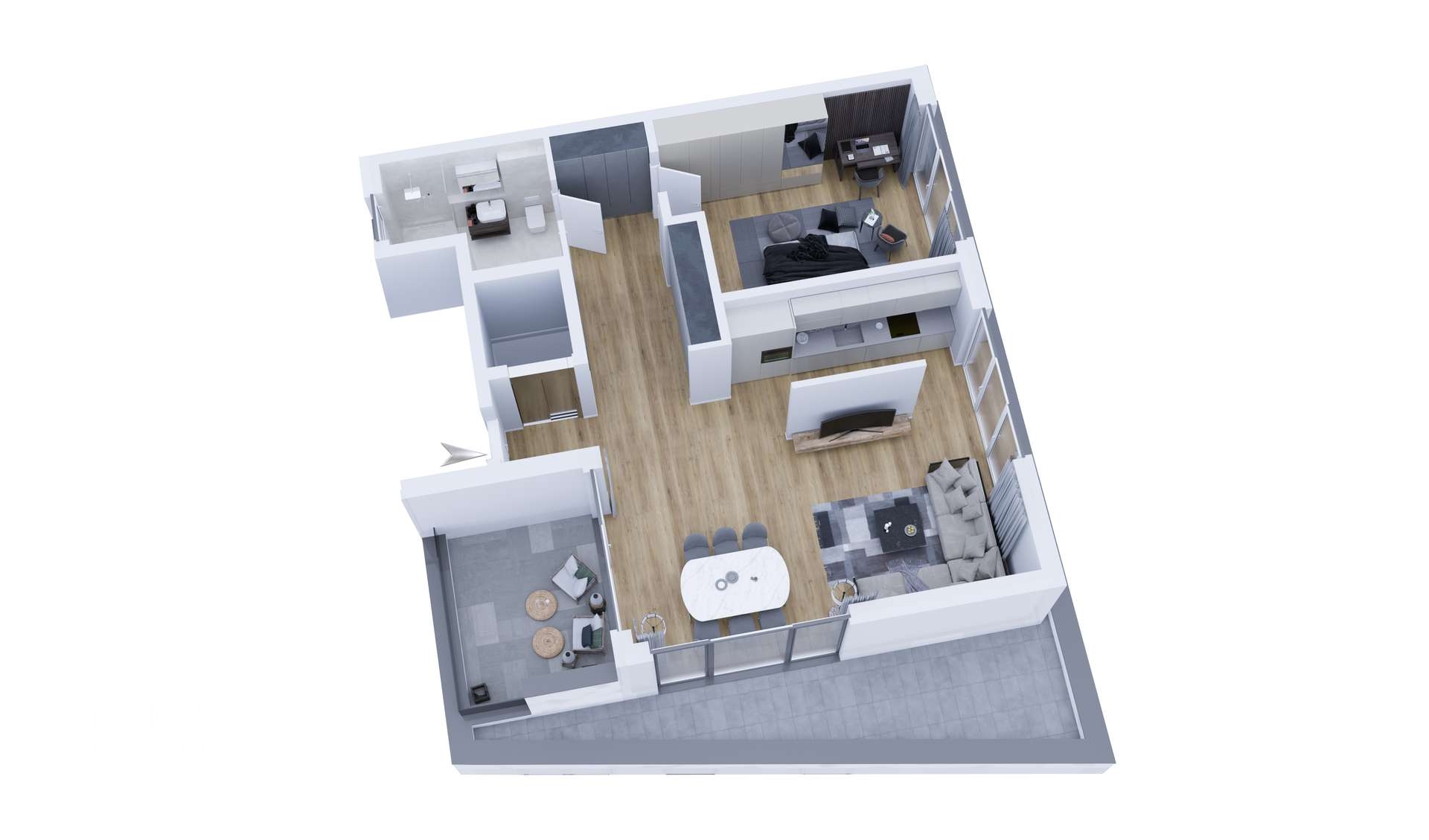 Über die Diele gelangen Sie in das Schlafzimmer sowie in das Masterbad. Die Bäder sind mit hochwertigen Design-Objekten - ganz im Trend der Zeit – ausgestattet.