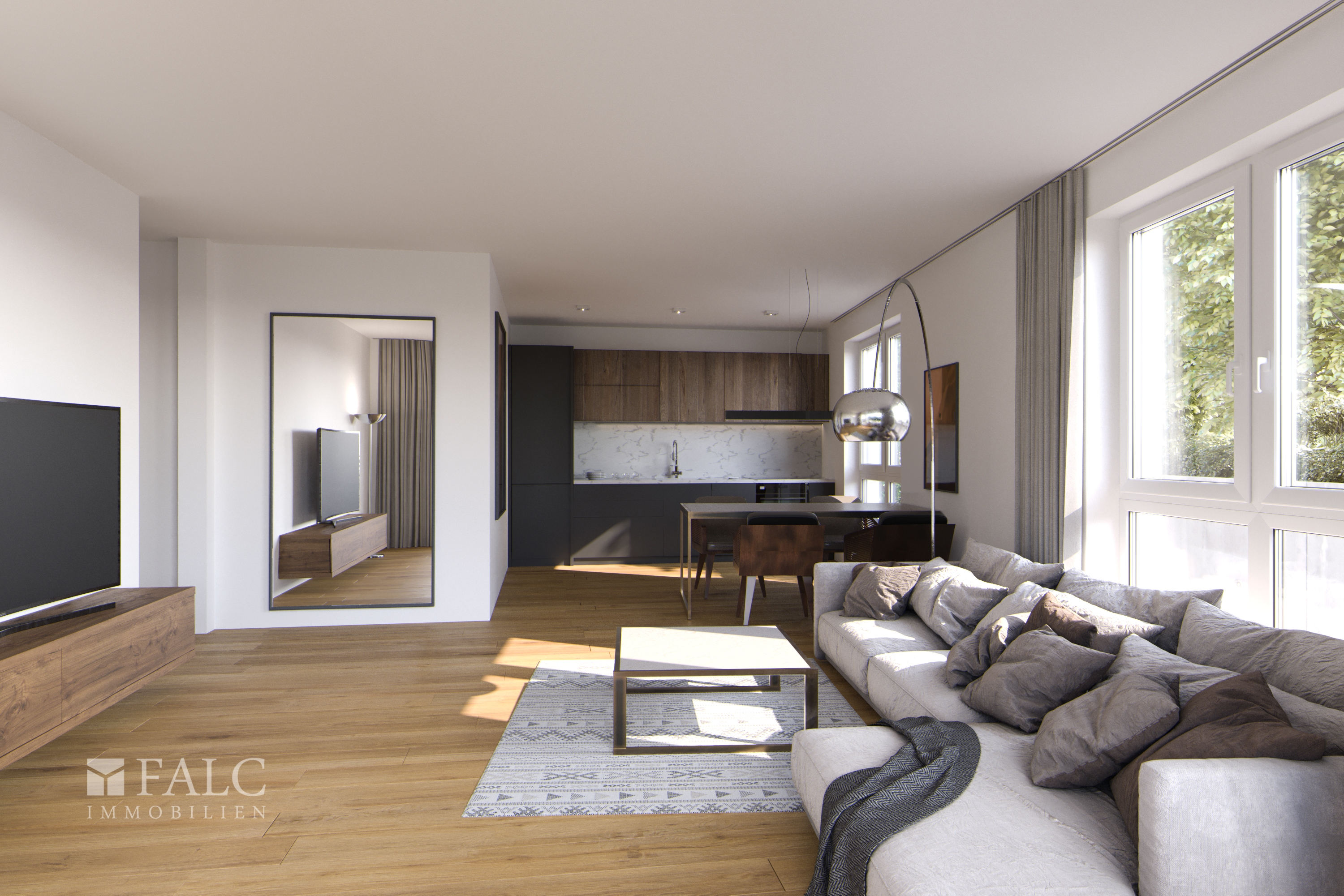 Die ca. 91 m² große 2-Zimmer-Wohnung befindet sich im 1. Obergeschoss. Über das einladende Entrée gelangen Sie zum offenen Wohn-Essbereich sowie der Küche. Alle Räume präsentieren sich großzügig und bieten ein angenehmes Wohngefühl. Dem Wohn-Essbereich angrenzend befindet sich ein ca. 12 m² großer Balkon.