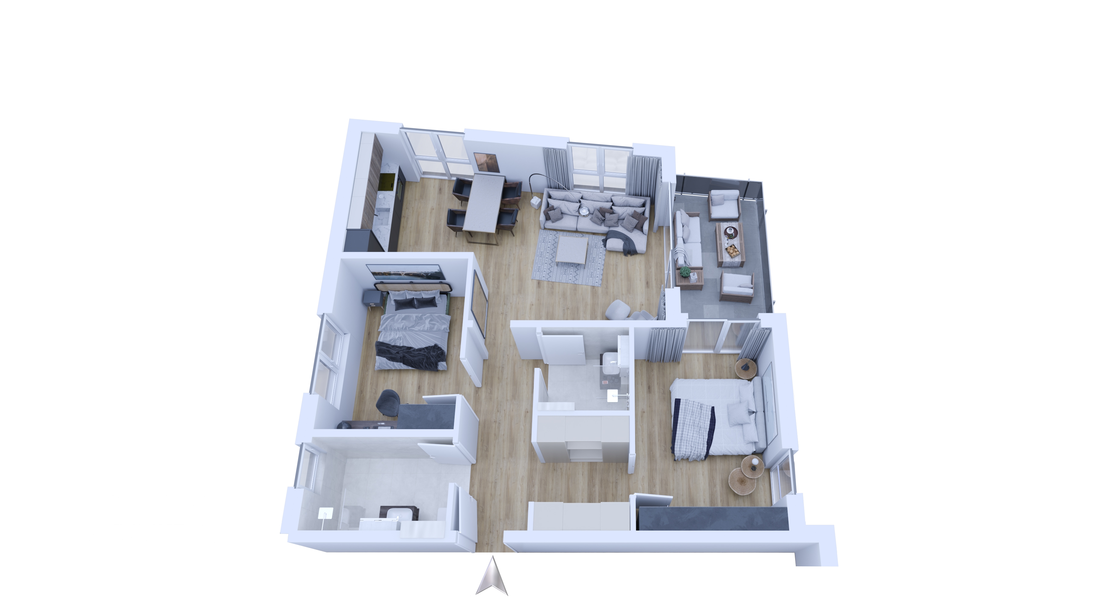 Über die Diele gelangen Sie zum Schlafzimmer, ein individuell nutzbares Zimmer, Gästebad sowie Masterbad. Die Bäder sind mit hochwertigen Design-Objekten - ganz im Trend der Zeit – ausgestattet.