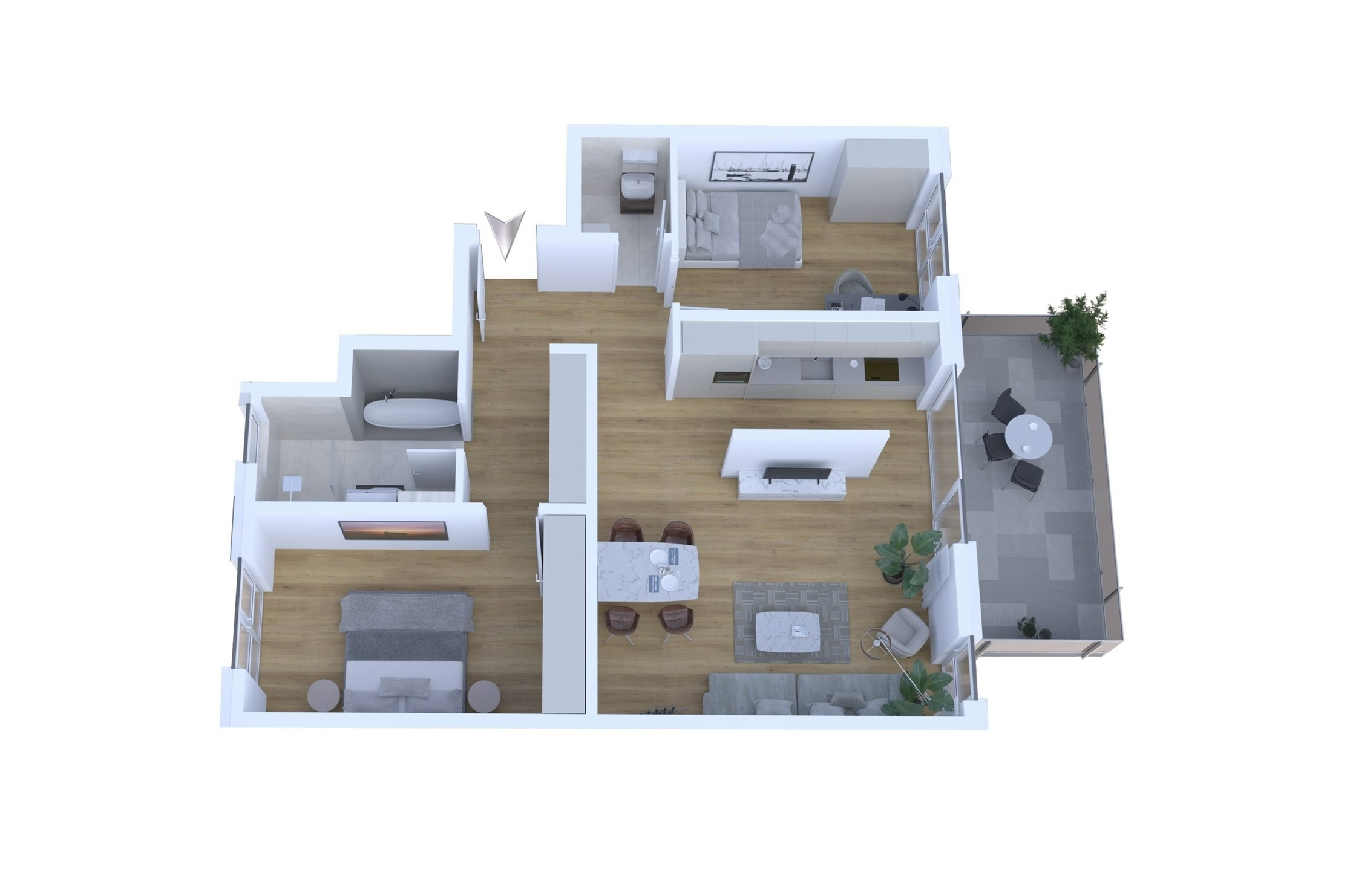 Über die Diele gelangen Sie zum Schlafzimmer, ein individuell nutzbares Zimmer, Gästebad sowie Masterbad. Die Bäder sind mit hochwertigen Design-Objekten - ganz im Trend der Zeit – ausgestattet.