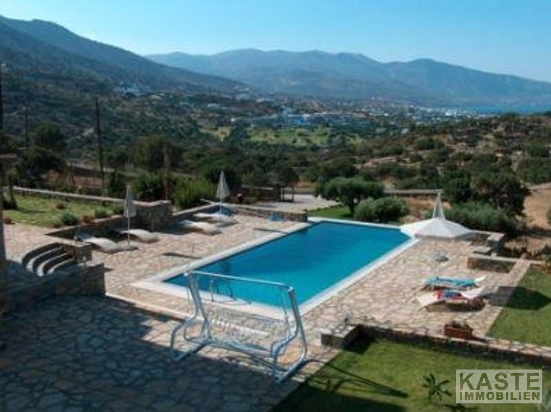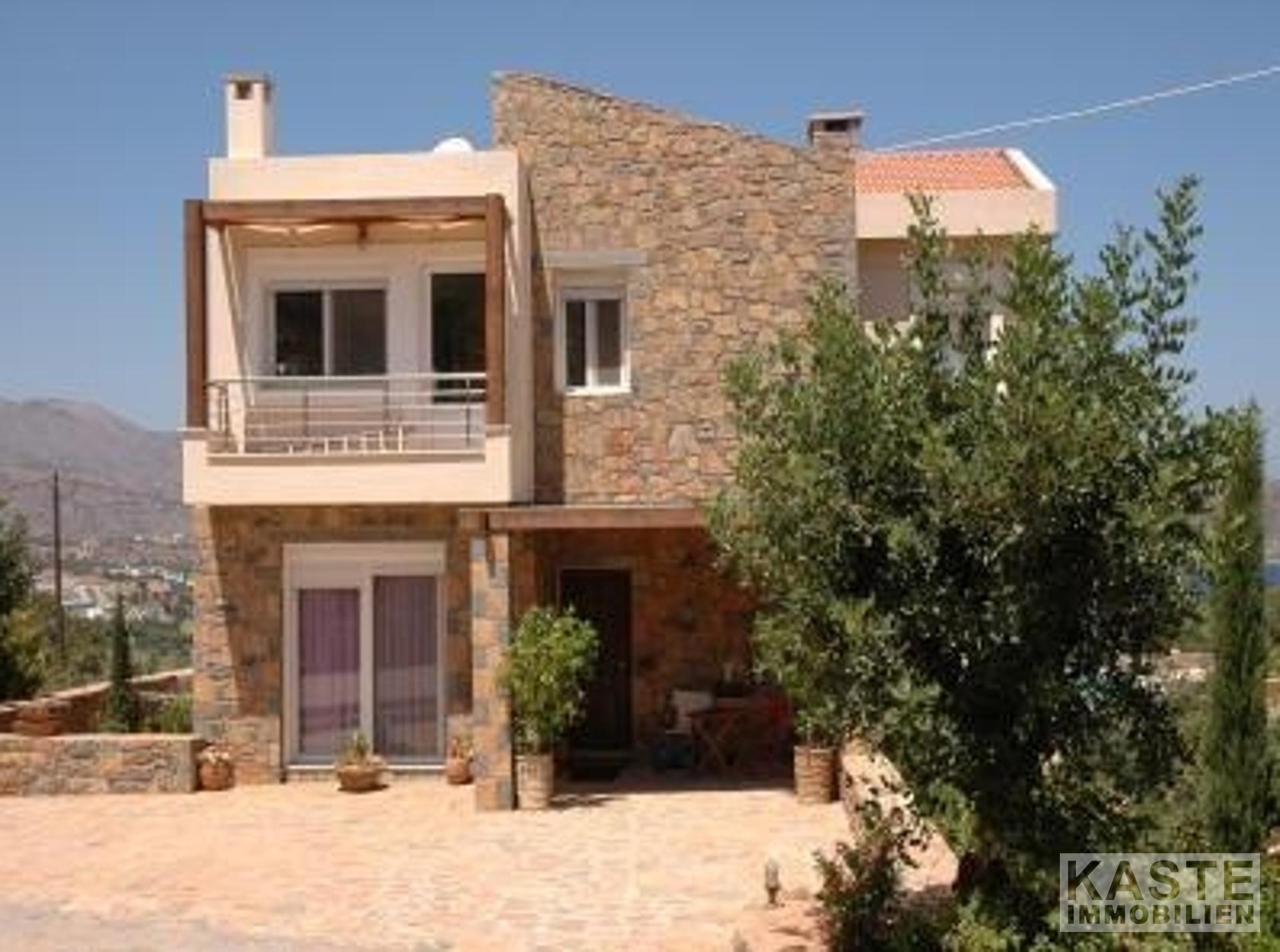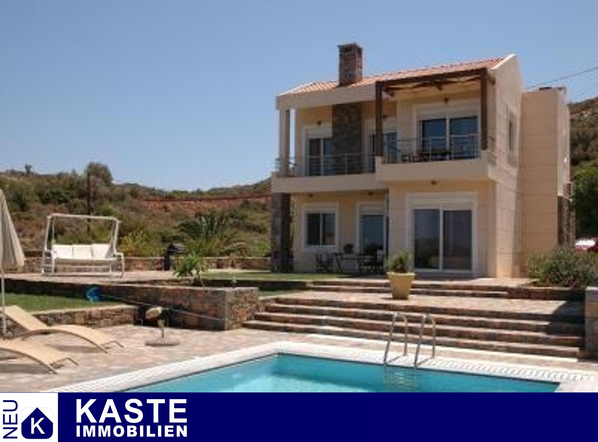 Diese moderne Villa liegt auf einem sanft abfallenden Hügel über dem Strand von Elounda und bietet daher einen atemberaubenden Blick auf den Golf von Mirabello sowie die umliegende Landschaft Nordkretas. Das Grundstück ist umgeben von wunderschönen Gärten, weitläufigen gepflasterten Bereichen, Terrassen und gepflegten Rasenflächen. Das Grundstück ist komplett eingeschlossen von natürlich gehaltenen Steinwänden, sowie einem Eisengatter zur Einfahrt. Die Villa verfügt über insgesamt 3 Schlafzimmer und 3 Badezimmer auf 2 Ebenen. Im oberen Stockwerk liegen alle drei Schlafzimmer mit eingebauten Kleiderschränken und hochwertigen Parkettböden. Ein Balkon zur Meerseite liegend, bietet einen herrlichen Blick auf die Küste. Auf dem Erdgeschoss liegt der Wohn- und Essbereich mit Kamin und großen, weiten Fenstertüren, die zur Terrasse hin öffnen. Auch die voll ausgestattete Küche liegt auf dieser Ebene. Auf der Terrasse finden sie den 60 qm großen und 4 m tiefen Pool. Die Villa wird voll möbliert verkauft und ist sofort bezugsfertig.