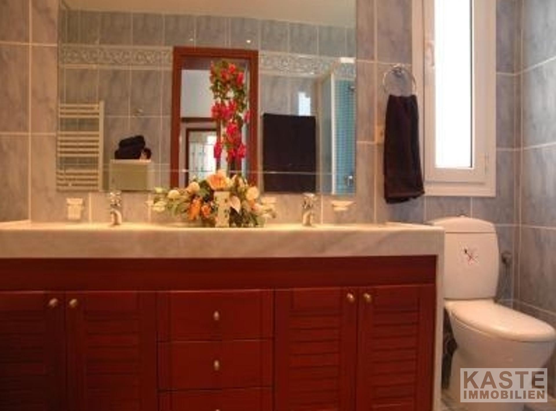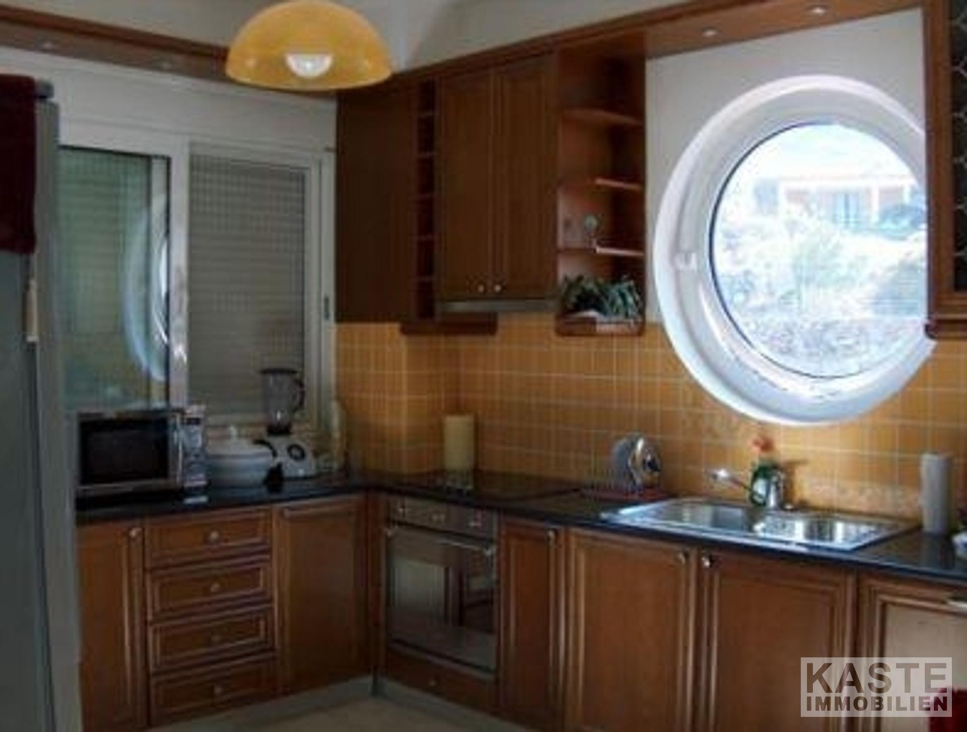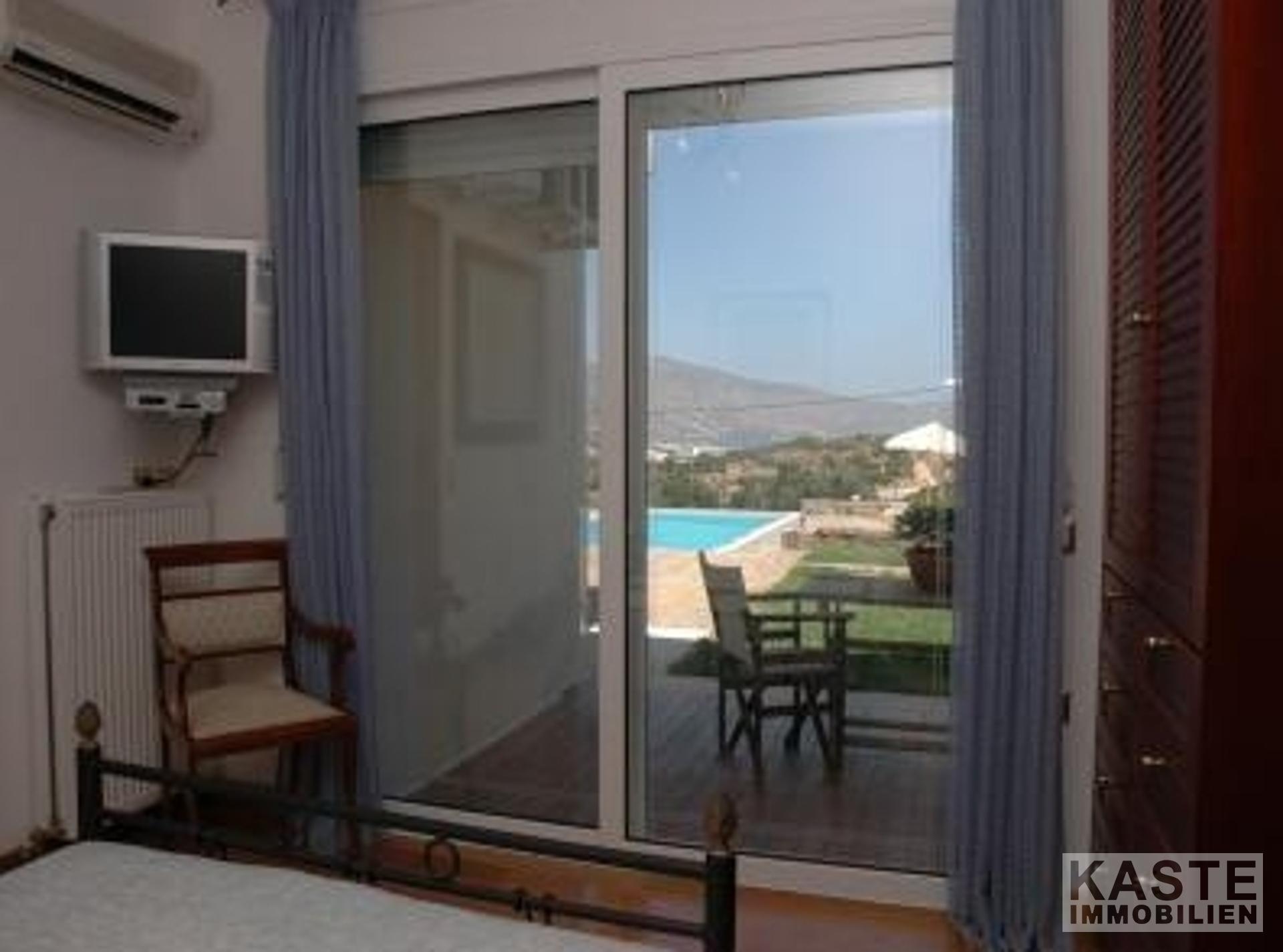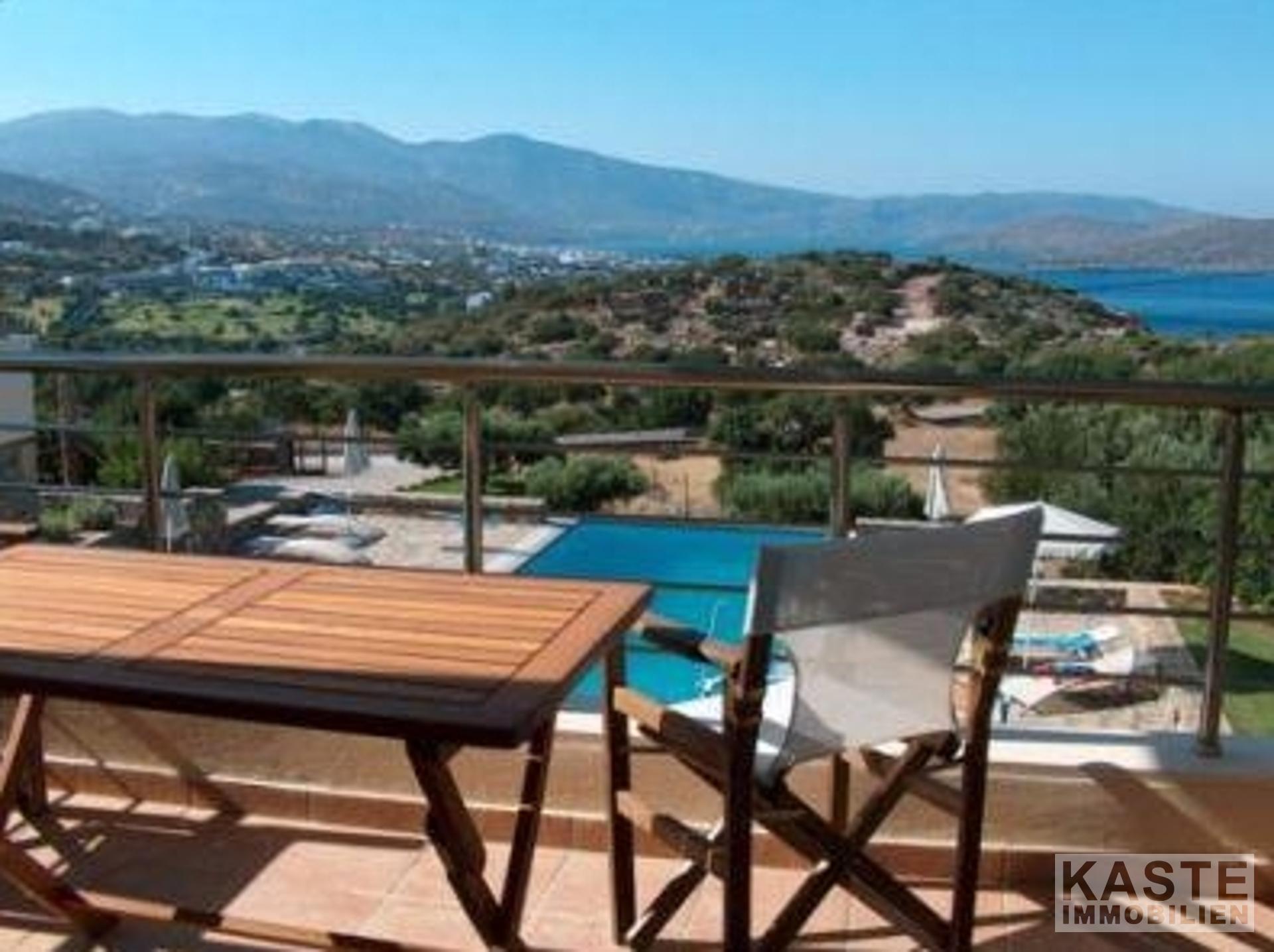 Diese moderne Villa liegt auf einem sanft abfallenden Hügel über dem Strand von Elounda und bietet daher einen atemberaubenden Blick auf den Golf von Mirabello sowie die umliegende Landschaft Nordkretas. Das Grundstück ist umgeben von wunderschönen Gärten, weitläufigen gepflasterten Bereichen, Terrassen und gepflegten Rasenflächen. Das Grundstück ist komplett eingeschlossen von natürlich gehaltenen Steinwänden, sowie einem Eisengatter zur Einfahrt. Die Villa verfügt über insgesamt 3 Schlafzimmer und 3 Badezimmer auf 2 Ebenen. Im oberen Stockwerk liegen alle drei Schlafzimmer mit eingebauten Kleiderschränken und hochwertigen Parkettböden. Ein Balkon zur Meerseite liegend, bietet einen herrlichen Blick auf die Küste. Auf dem Erdgeschoss liegt der Wohn- und Essbereich mit Kamin und großen, weiten Fenstertüren, die zur Terrasse hin öffnen. Auch die voll ausgestattete Küche liegt auf dieser Ebene. Auf der Terrasse finden sie den 60 qm großen und 4 m tiefen Pool. Die Villa wird voll möbliert verkauft und ist sofort bezugsfertig.