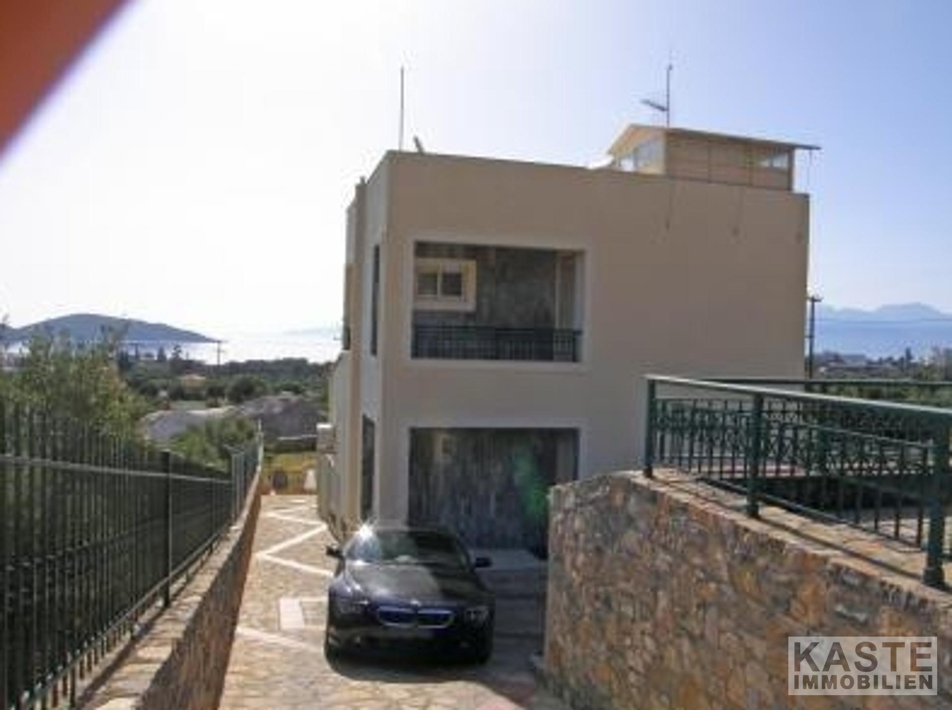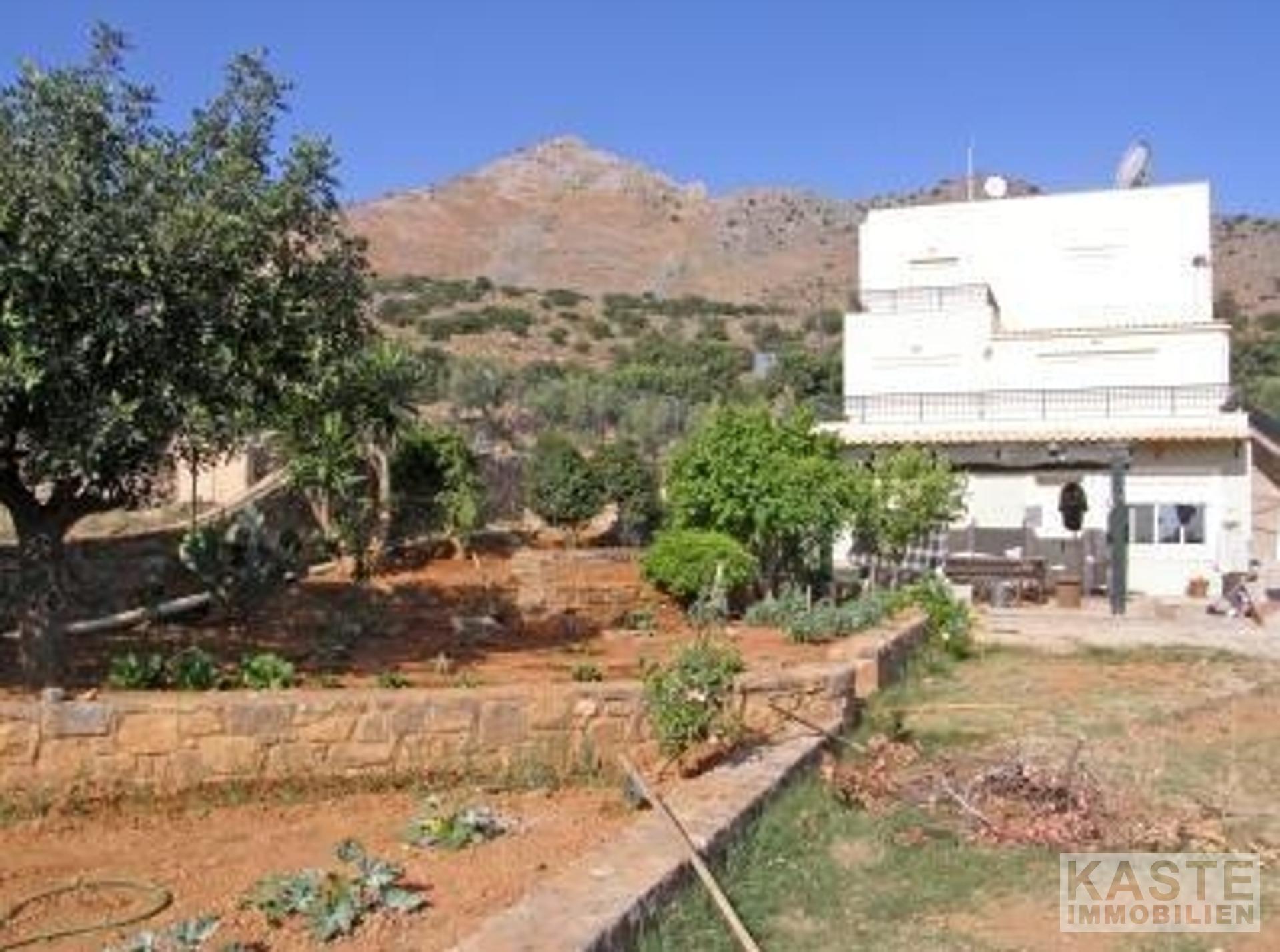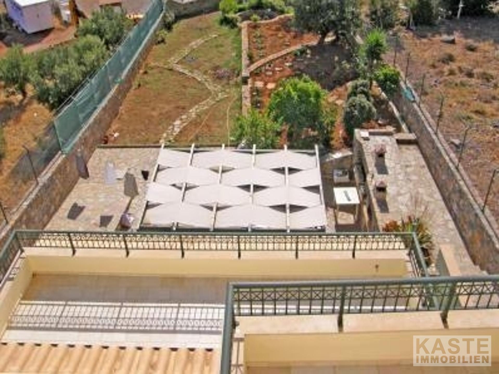 Dieses Grundstück ist auf einem 911 Quadratmeter großen Grundstück auf einem ansteigenden Gelände nahe der Hauptstraße nach Elounda gebaut. Das Grundstück ist eingezäunt und hat durch zwei ferngesteuerte Tore Zugang zur Hauptstraße. Beim Betreten des Grundstücks gibt es einen Parkplatz auf der rechten Seite und eine kleine Straße auf der linken Seite, die zu einer Garage und einigen weiteren Parkplätzen vor dem Haupthaus führt.