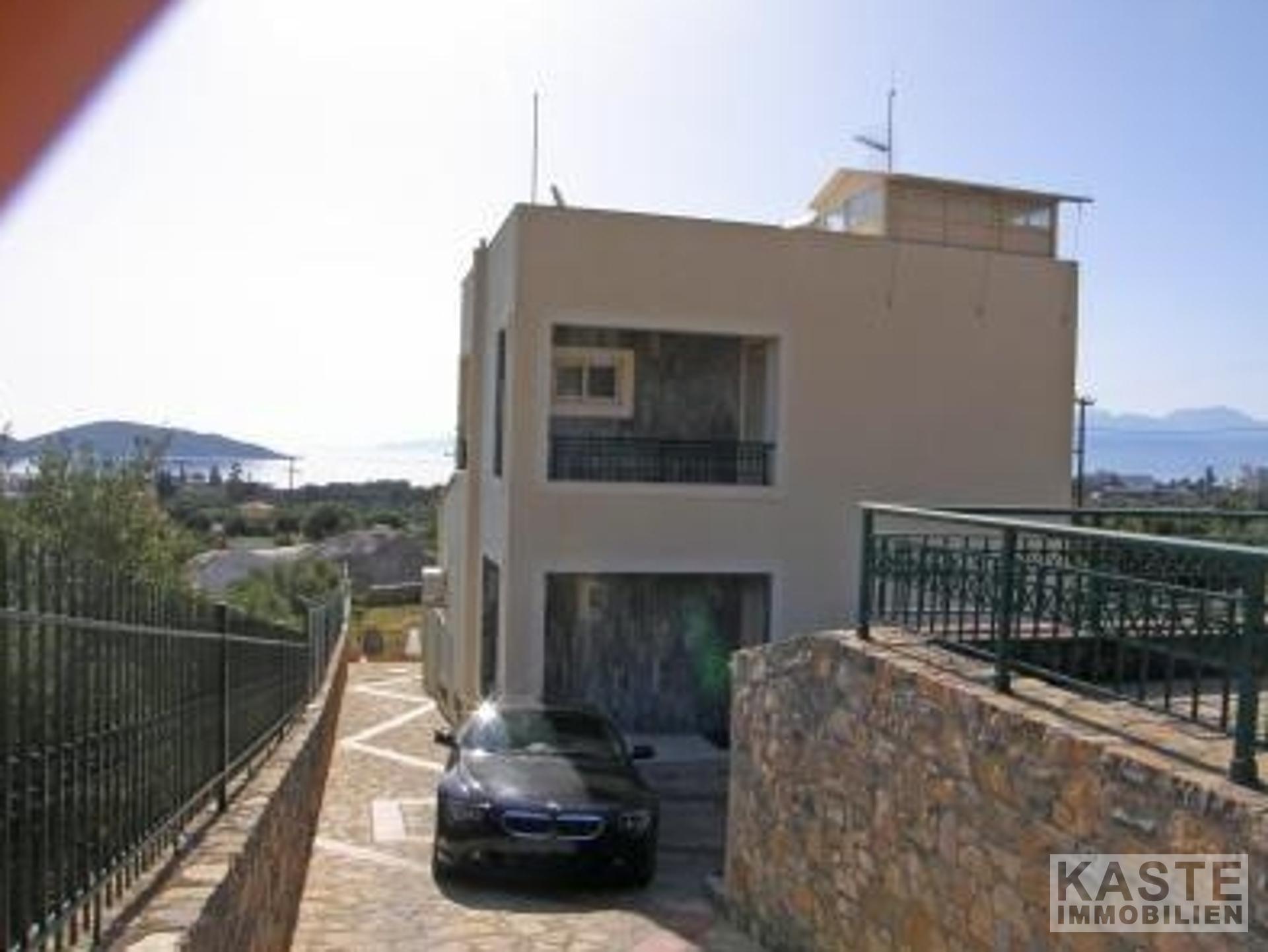Dieses Grundstück ist auf einem 911 Quadratmeter großen Grundstück auf einem ansteigenden Gelände nahe der Hauptstraße nach Elounda gebaut. Das Grundstück ist eingezäunt und hat durch zwei ferngesteuerte Tore Zugang zur Hauptstraße. Beim Betreten des Grundstücks gibt es einen Parkplatz auf der rechten Seite und eine kleine Straße auf der linken Seite, die zu einer Garage und einigen weiteren Parkplätzen vor dem Haupthaus führt.