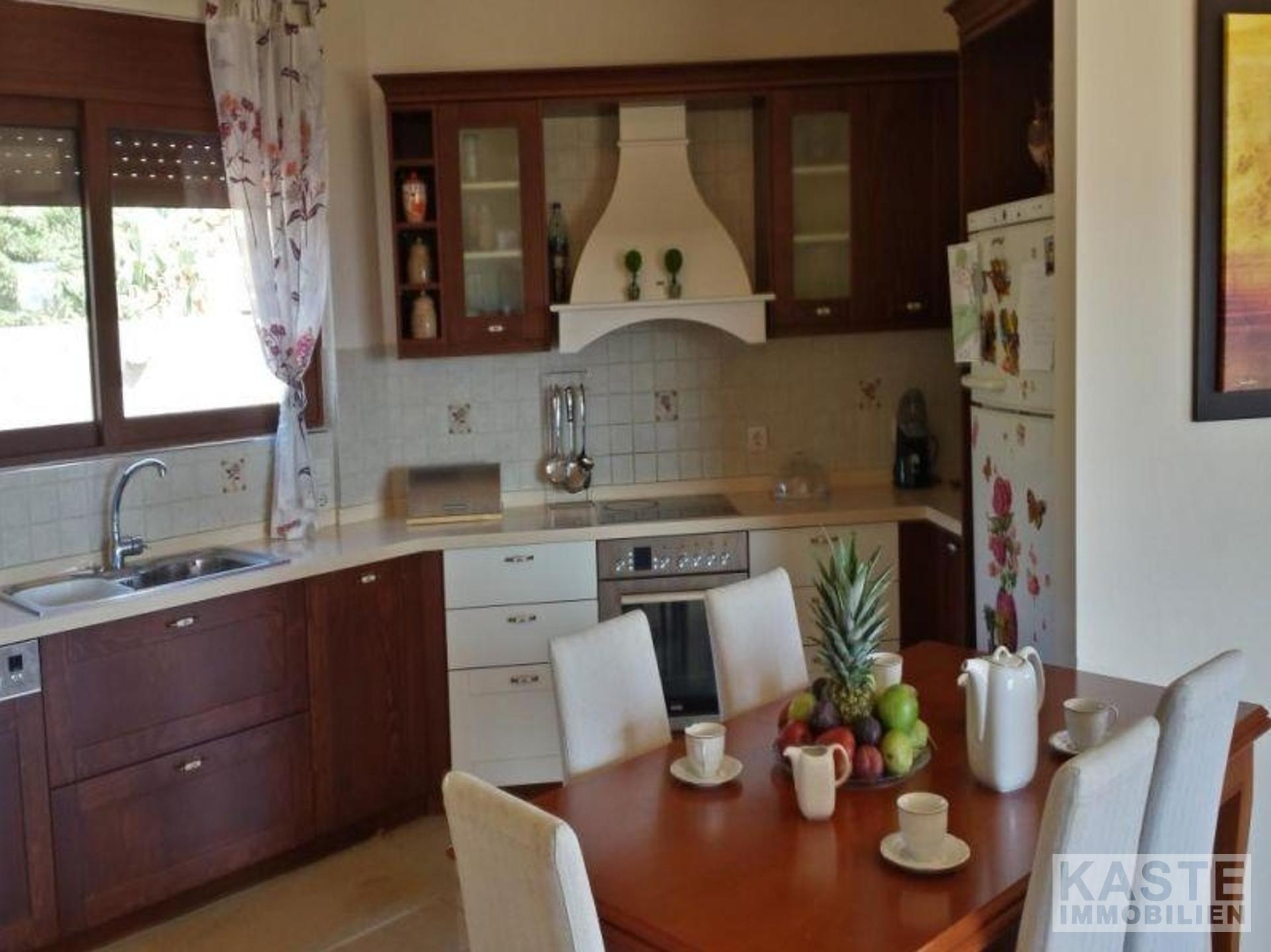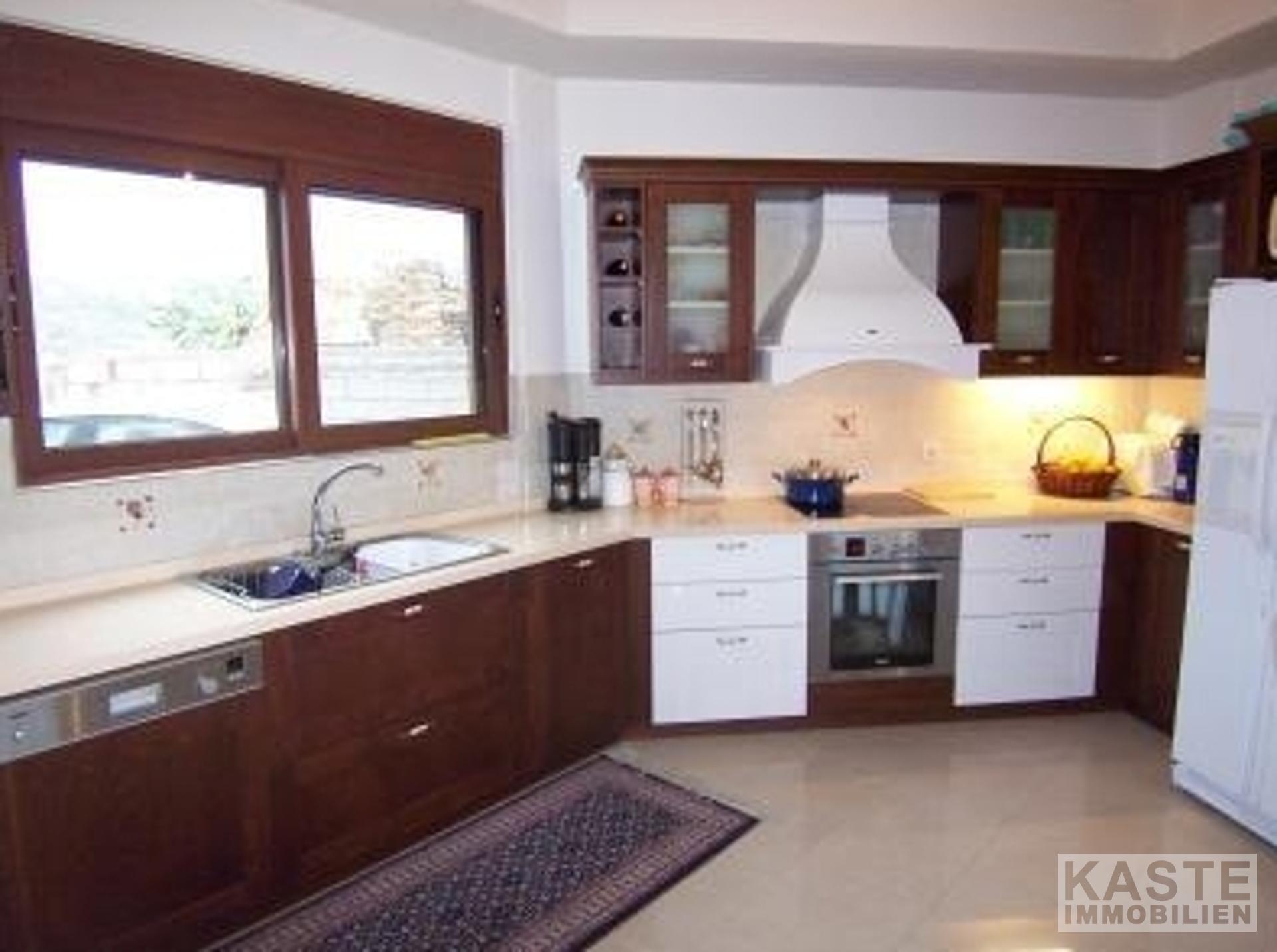 Auf dem Dach gibt es einen zusätzlichen Waschraum sowie den Heizungsraum. Die große Dachterrasse hat einen BBQ-Bereich. Das Untergeschoss (Erdgeschoss auf der einen Seite) 150qm kann zu einer separaten Wohnung ausgebaut werden. Die Qualität der Ausstattung entspricht höchsten Standards. Die Fenster sind im ersten Stock doppelt verglast und im Erdgeschoss dreifach verglast. Alle Balkontür- und Fensterrahmen sind aus Aluminium mit natürlicher dunkler Holzfärbung. Die Fußböden in den Empfangsräumen und Badezimmern sind aus Granitfliesen und in den Schlafzimmern aus afrikanischer Kiefer. Es gibt Heizkörper in allen Räumen des Hauses. Auf dem Grundstück ist genug Platz für den Bau eines Swimmingpools. Es ist auch möglich, ein freistehendes Gästehaus auf diesem Grundstück zu bauen.