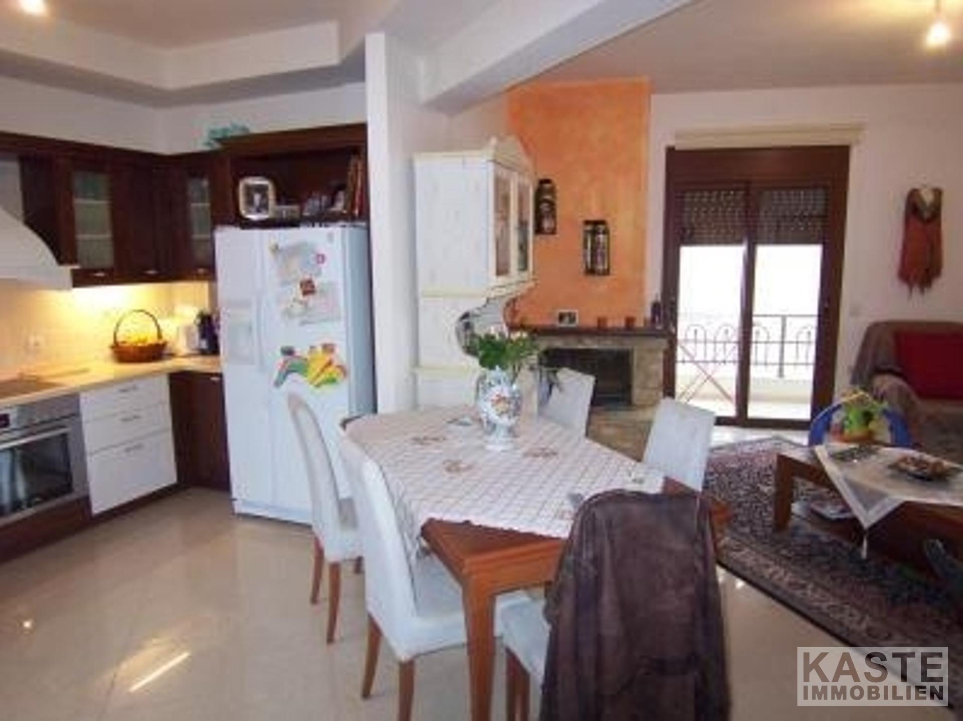 Im Erdgeschoss gibt es zwei Wohnbereiche, eine große, voll ausgestattete Wohnküche mit dunklen Holzflächen und Schränken und einem Kamin und ein größerer Wohnbereich mit Esszimmer (Split-Level) mit einem Steinkamin und großen Fenstern, die einen spektakulären Blick auf die Halbinsel bieten. Auf dieser Etage gibt es einen Abstellraum, ein Gäste-Doppelzimmer und ein Duschbad. Ein sehr großer Balkon erstreckt sich über die gesamte Etage, zu dem alle Wohn- und Schlafzimmer auf dieser Etage Zugang haben.