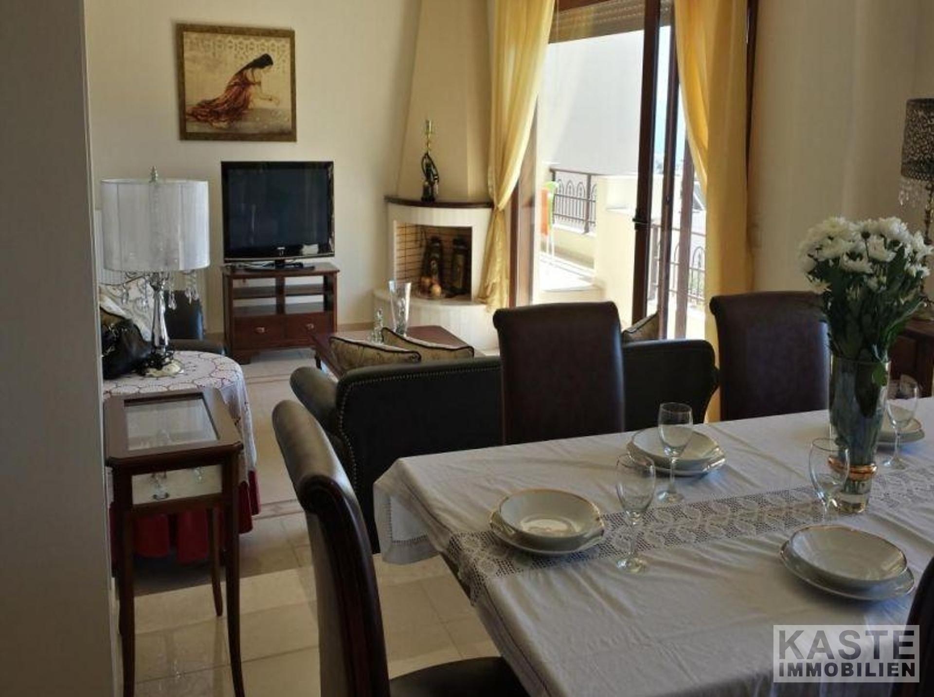 Im Erdgeschoss gibt es zwei Wohnbereiche, eine große, voll ausgestattete Wohnküche mit dunklen Holzflächen und Schränken und einem Kamin und ein größerer Wohnbereich mit Esszimmer (Split-Level) mit einem Steinkamin und großen Fenstern, die einen spektakulären Blick auf die Halbinsel bieten. Auf dieser Etage gibt es einen Abstellraum, ein Gäste-Doppelzimmer und ein Duschbad. Ein sehr großer Balkon erstreckt sich über die gesamte Etage, zu dem alle Wohn- und Schlafzimmer auf dieser Etage Zugang haben.