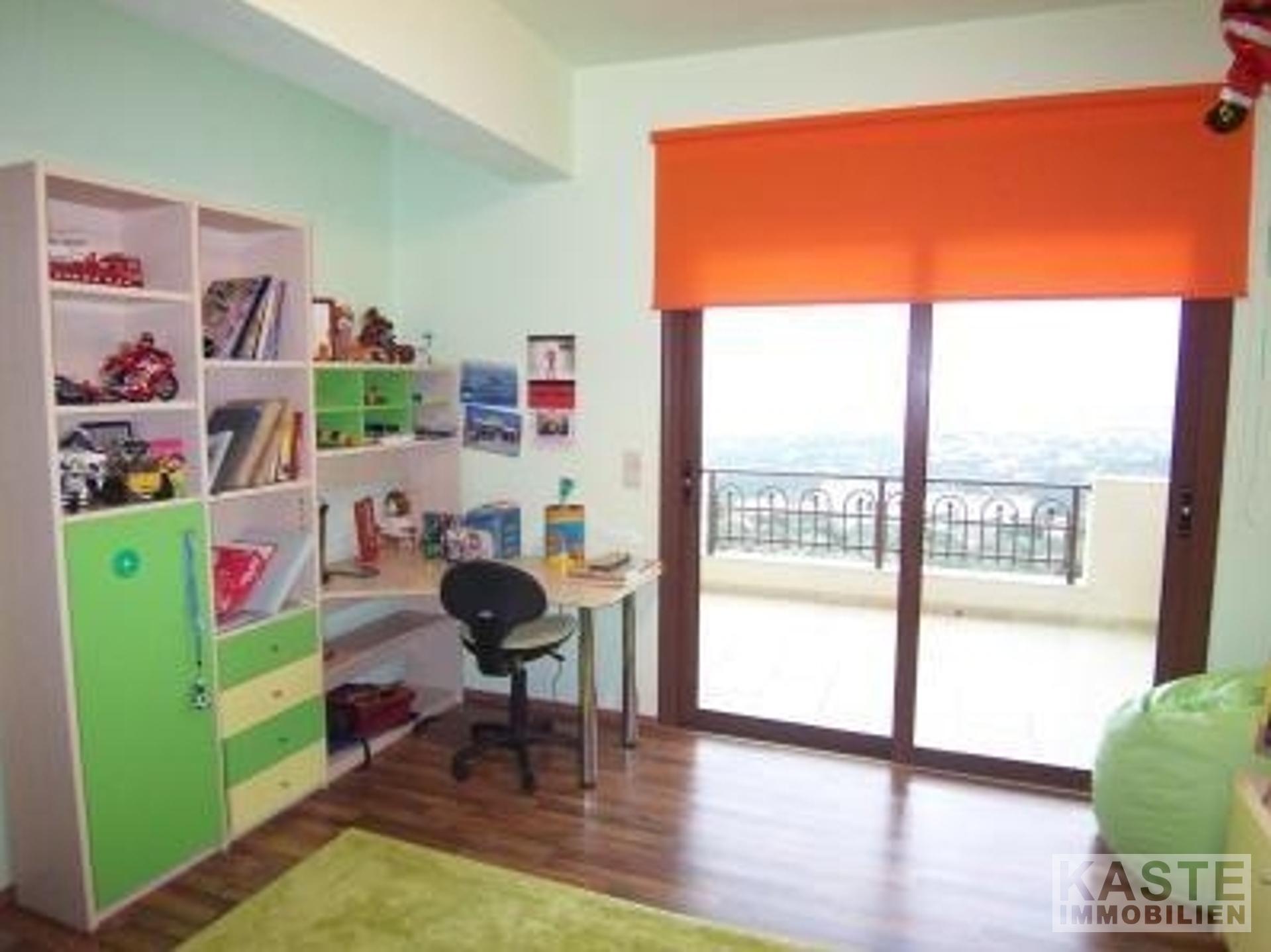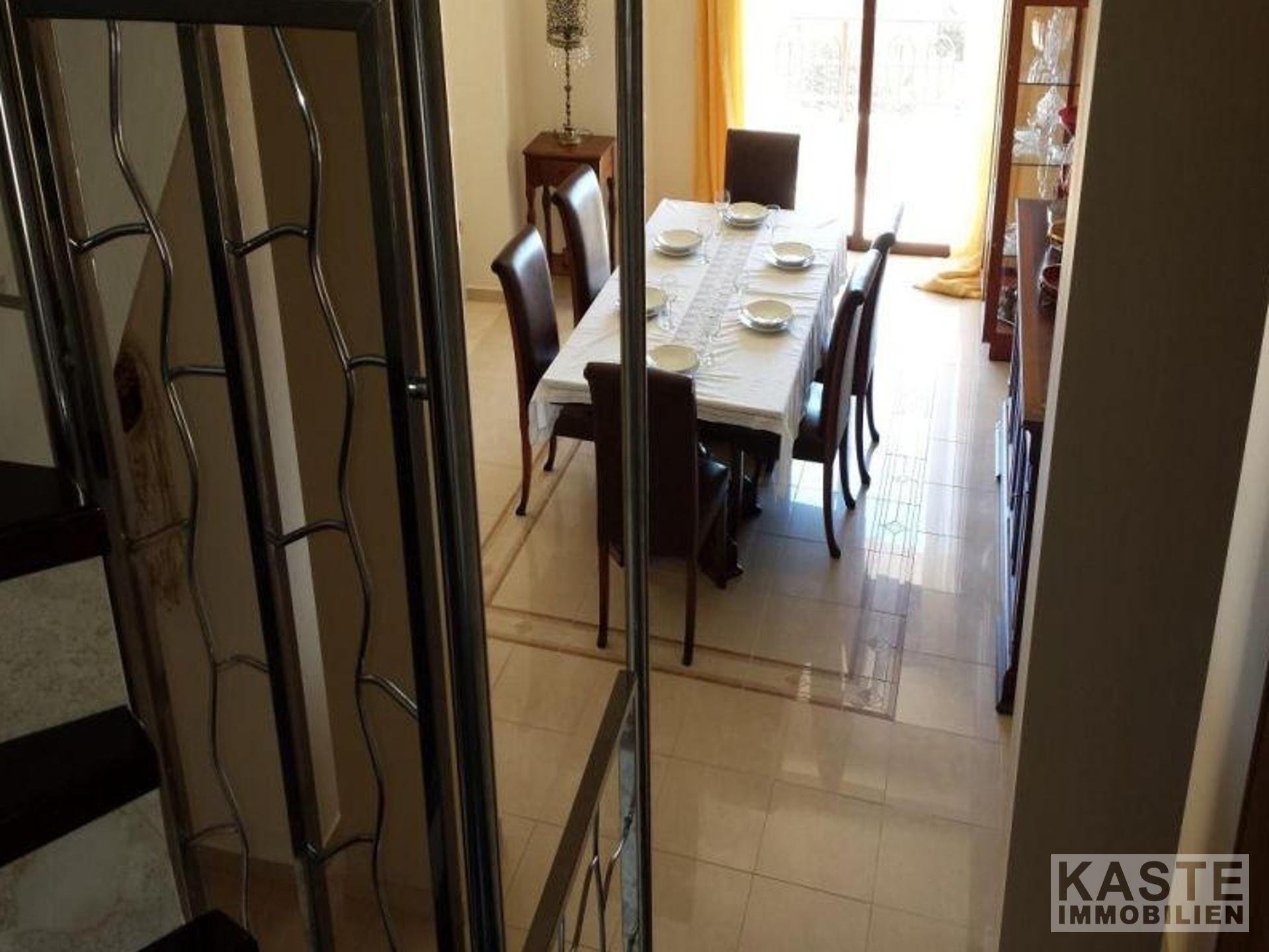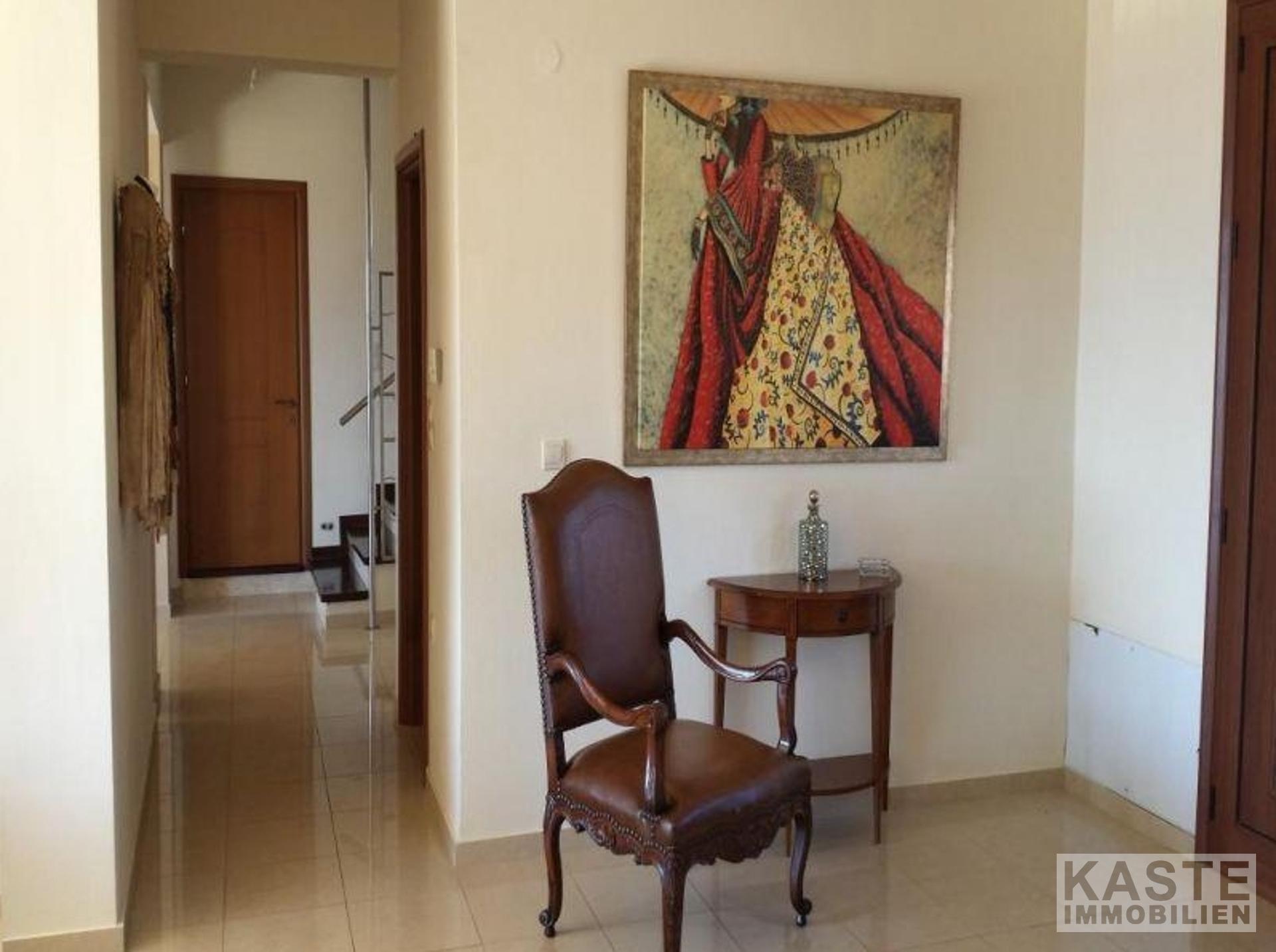 Auf dem Dach gibt es einen zusätzlichen Waschraum sowie den Heizungsraum. Die große Dachterrasse hat einen BBQ-Bereich. Das Untergeschoss (Erdgeschoss auf der einen Seite) 150qm kann zu einer separaten Wohnung ausgebaut werden. Die Qualität der Ausstattung entspricht höchsten Standards. Die Fenster sind im ersten Stock doppelt verglast und im Erdgeschoss dreifach verglast. Alle Balkontür- und Fensterrahmen sind aus Aluminium mit natürlicher dunkler Holzfärbung. Die Fußböden in den Empfangsräumen und Badezimmern sind aus Granitfliesen und in den Schlafzimmern aus afrikanischer Kiefer. Es gibt Heizkörper in allen Räumen des Hauses. Auf dem Grundstück ist genug Platz für den Bau eines Swimmingpools. Es ist auch möglich, ein freistehendes Gästehaus auf diesem Grundstück zu bauen.