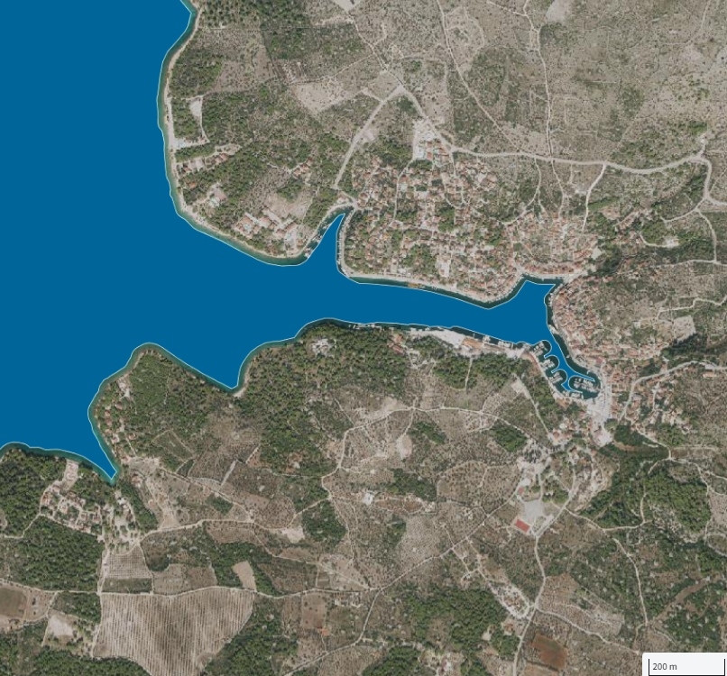 Es befindet sich zwischen 20-40m an der Marina-Bucht von Milna in 2. Reihe und hat eine Ausdehnung von ca. 100*60 m.