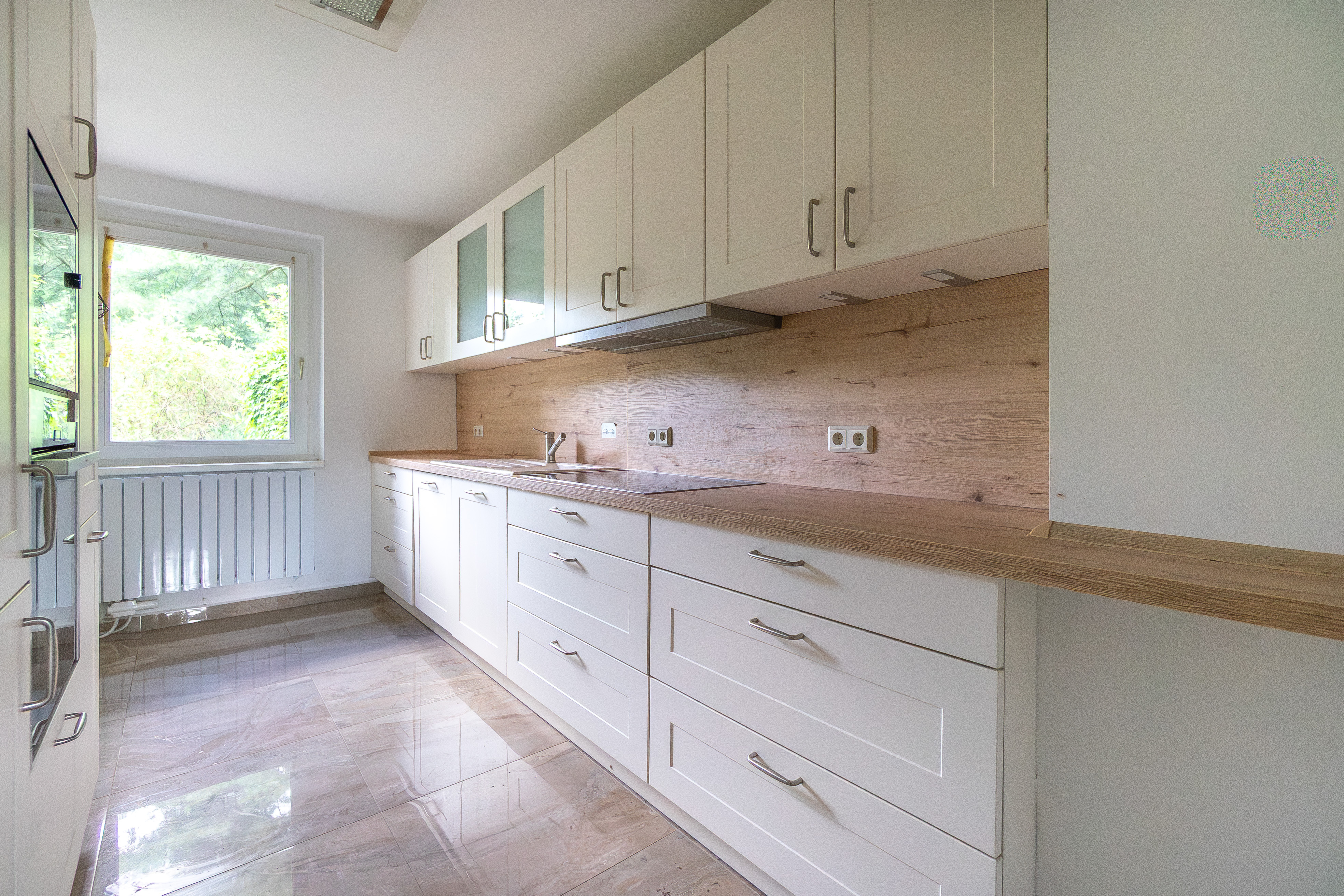 Ausstattung: • Küche: moderne Einbauküche in Weiß, viel Stauraum, Holzoptik-Arbeitsplatten