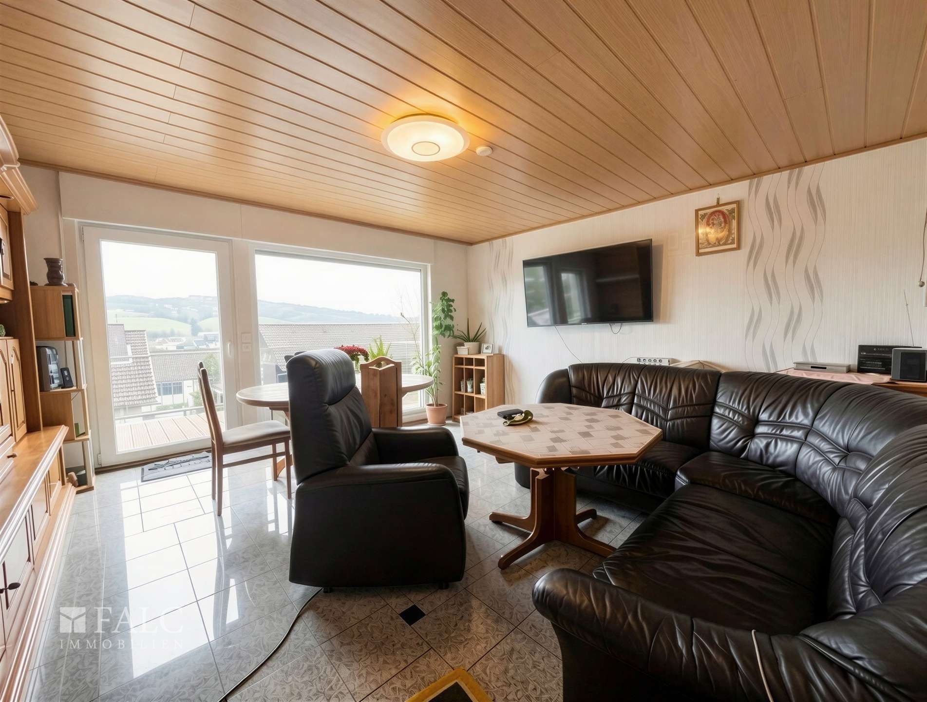 Von der Diele gelangen Sie in das helle Wohnzimmer mit großen Fensterfronten, die den Raum in warmes Tageslicht tauchen. Hier entsteht ein idealer Ort für entspannte Stunden mit der Familie. Der direkte Zugang zum großzügigen Balkon eröffnet einen herrlichen Blick in den liebevoll angelegten Garten.