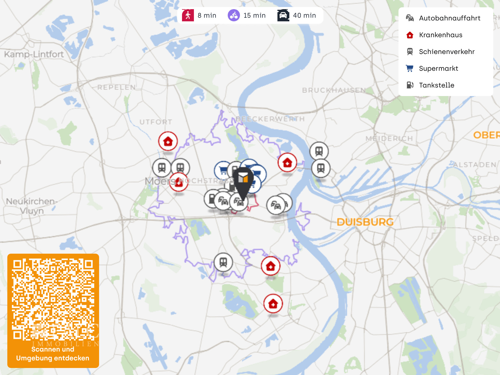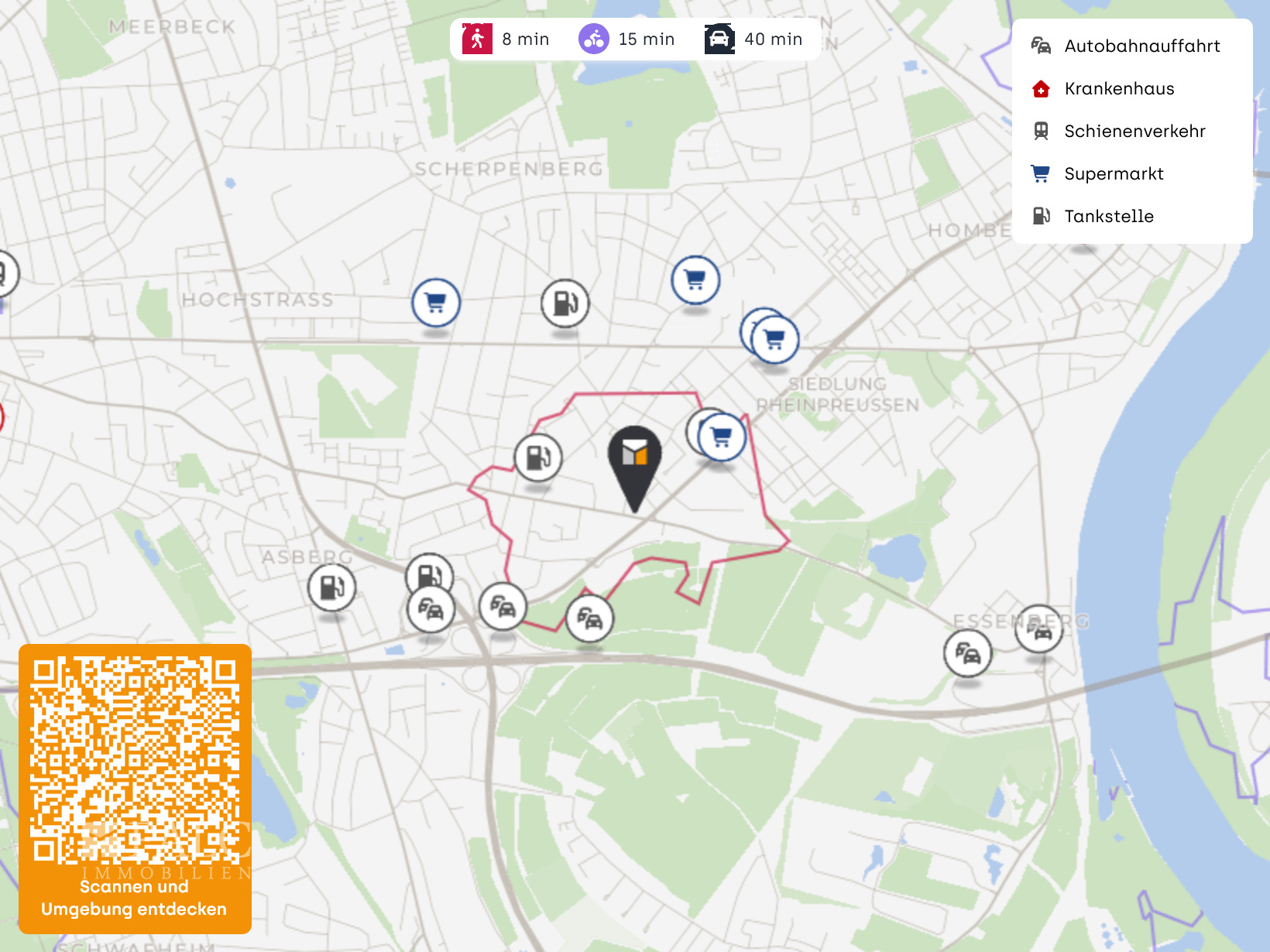 Verkehrsanbindung Die Anbindung an den öffentlichen Nahverkehr ist sehr komfortabel: Mehrere Bushaltestellen wie Asberger Straße und Kirchstraße sind fußläufig erreichbar. Auch für Autofahrer ist die Lage praktisch, da eine Autobahnauffahrt in der Nähe liegt und damit schnelle Verbindungen in die umliegenden Stadtteile und die Region ermöglicht.