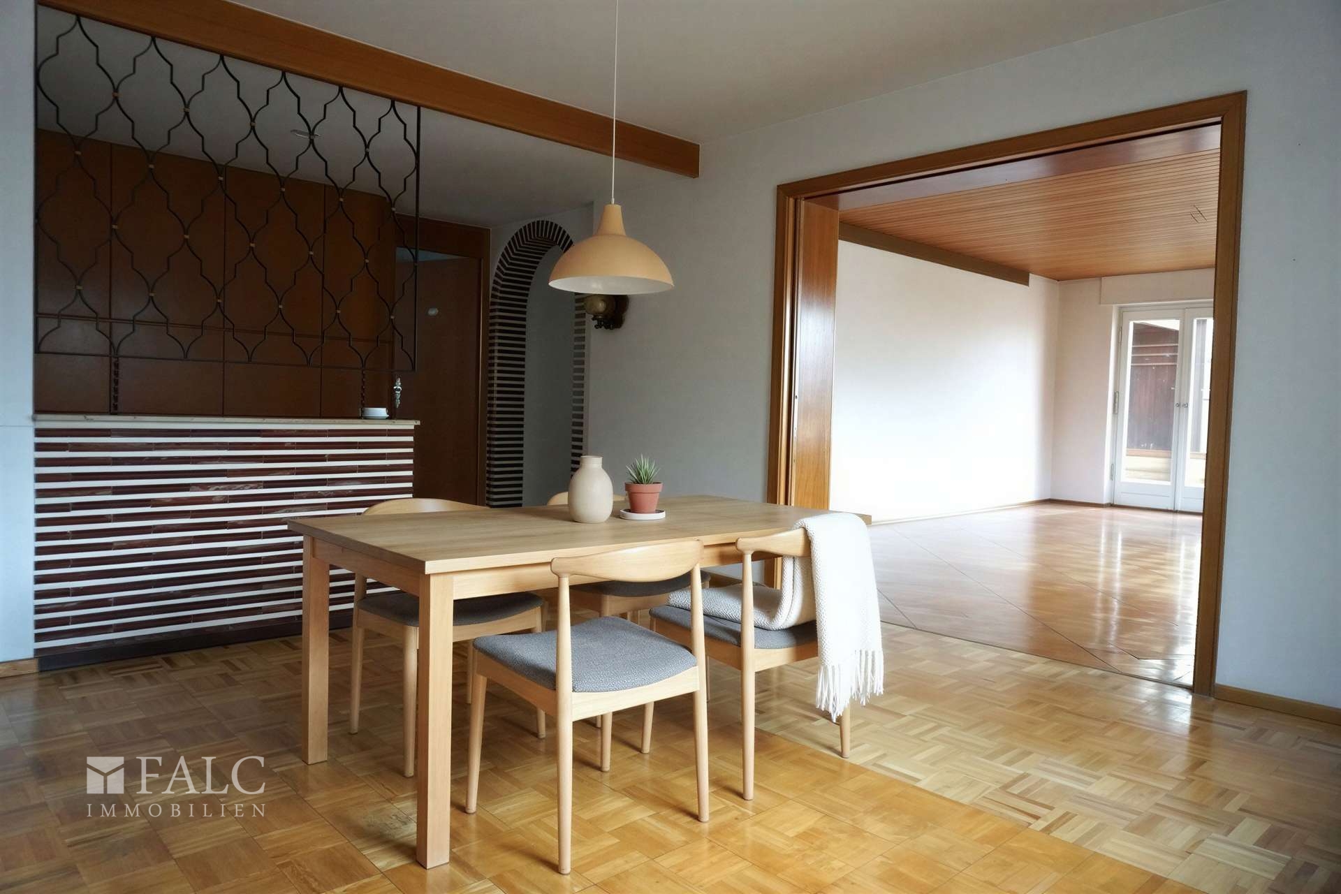 Das Wohnhaus umfasst zwei abgeschlossene Wohneinheiten mit einer gesamten Wohnfläche von ca. 277 m². Die Erdgeschosswohnung verfügt über eine Wohnfläche von ca. 162,24 m² und ist als großzügige 5-Zimmer-Wohnung konzipiert. Sie bietet drei Schlafzimmer, ein Wohnzimmer, ein separates Esszimmer, eine Küche, ein Badezimmer, ein Gäste-WC sowie eine geräumige Eingangsdiele. Besonders hervorzuheben sind die zwei miteinander verbundenen Terrassen, die einen direkten Zugang in den Garten ermöglichen, sowie der vorhandene Kachelofen, der für eine angenehme Wohnatmosphäre sorgt.