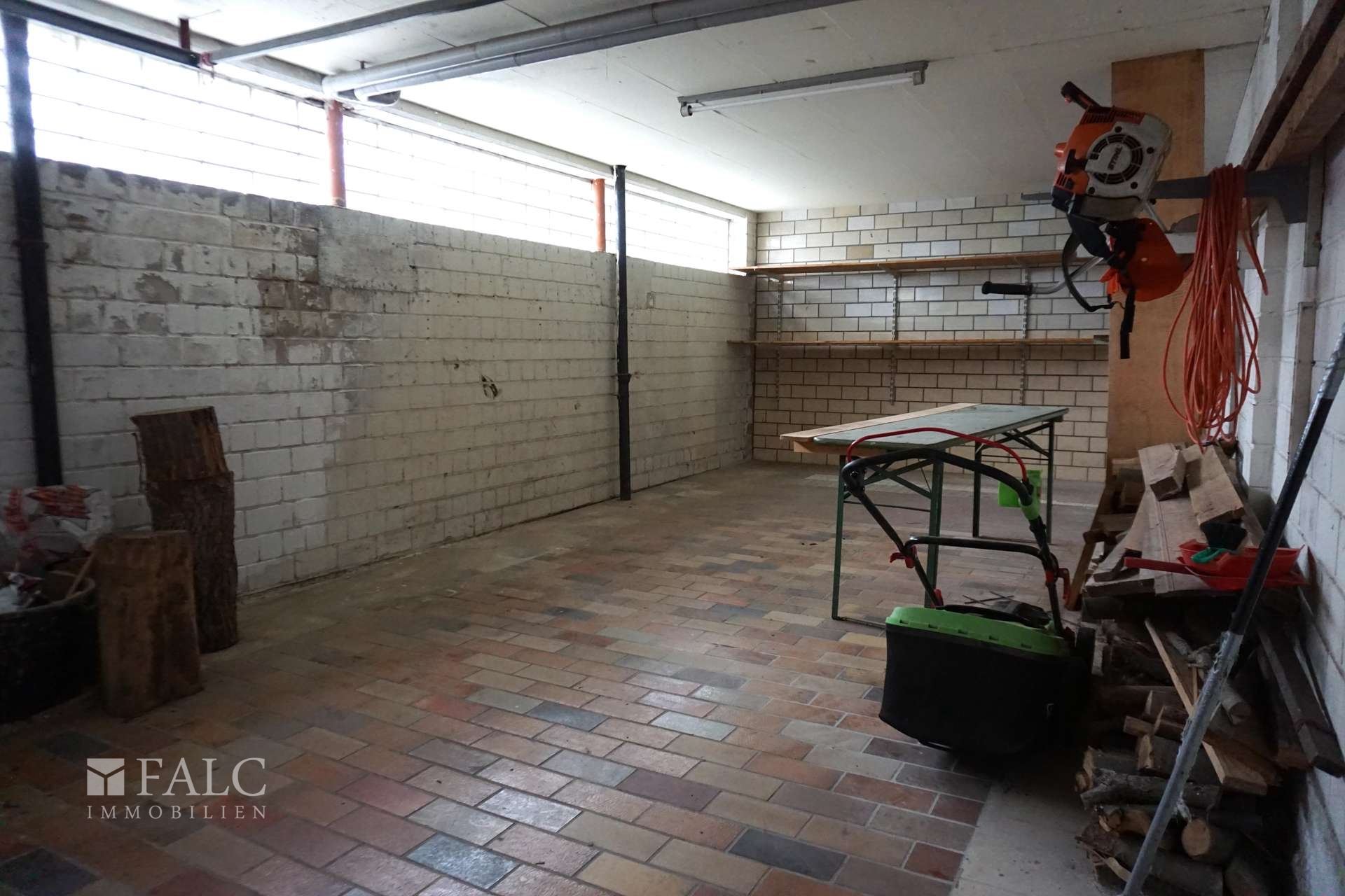 Die Bodenbeläge in beiden Wohnungen bestehen aus einer Kombination von teilweise Echtholzparkett, Fliesen, Laminat und Teppich. Das Haus ist voll unterkellert und bietet umfangreiche Nutzflächen. Im Kellergeschoss befinden sich insgesamt vier Garagen, ein Saunaraum mit Dusche, eine Waschküche, zwei Kellerräume, ein Heizraum sowie ein separater Raum für den Öltank. Beheizt wird die Immobilie über eine Ölzentralheizung. Das Dach ist gedämmt.