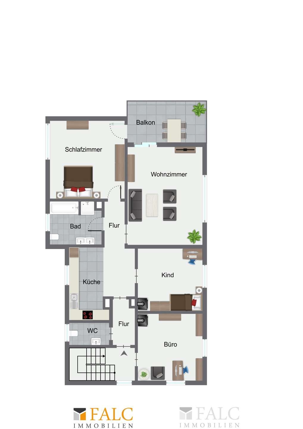 Die Wohnung im Obergeschoss hat eine Wohnfläche von ca. 114,82 m² und besteht aus vier Zimmern. Sie umfasst zwei Schlafzimmer, eine Büro, ein Wohnzimmer, Küche mit Essbereich, ein Badezimmer sowie ein Gäste-WC. Ein Balkon, der sowohl vom Wohnzimmer als auch vom Schlafzimmer aus zugänglich ist, erweitert den Wohnraum nach außen und bietet einen schönen Blick auf das Grundstück.