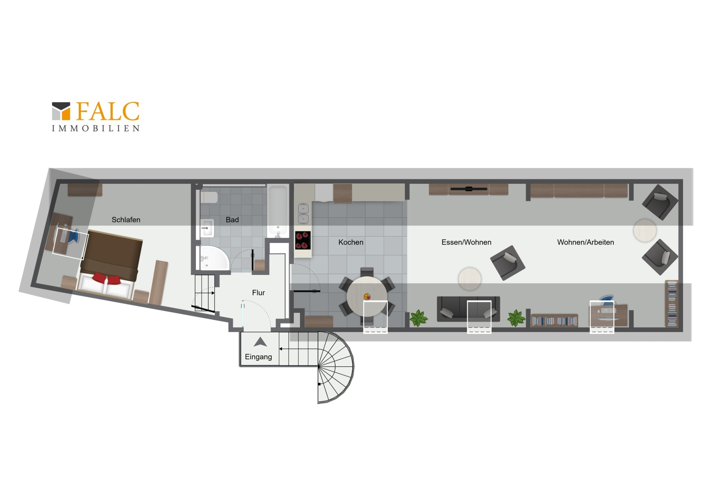 Betreten Sie das charmante Apartment über die elegante außenliegende Wendeltreppe, die Sie in eine helle und einladende Wohnfläche von 86m² führt. Der sehr großzügige Wohnbereich besticht durch seine offene Gestaltung und bietet viel Platz für individuelle Einrichtungsideen. Die sichtbaren Holzbalken verleihen dem Raum einen rustikalen Charme und schaffen eine gemütliche Atmosphäre.