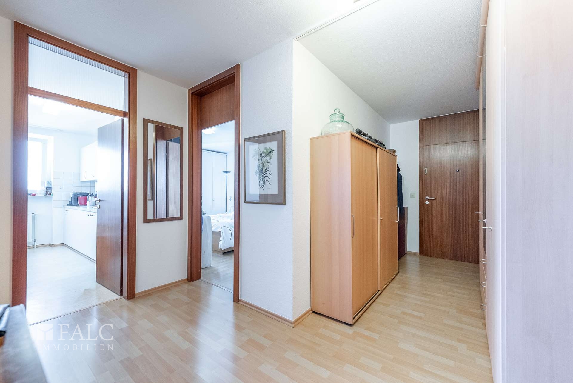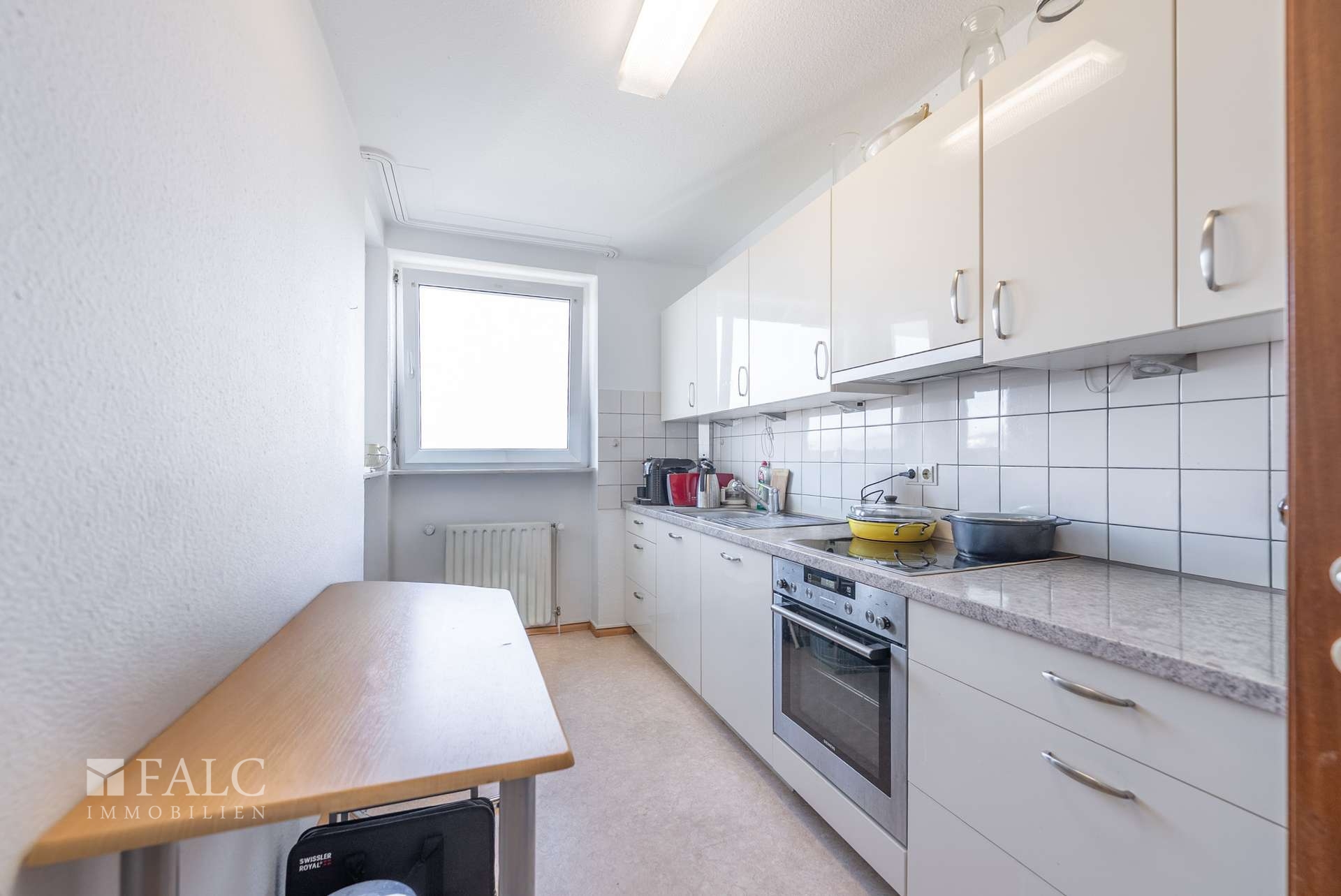 Die Wohnung ist mit einer praktischen Einbauküche ausgestattet, die genügend Stauraum und Arbeitsfläche für den täglichen Bedarf bietet. Das innenliegende Badezimmer verfügt über eine Badewanne und bietet eine gepflegte, funktionale Ausstattung.