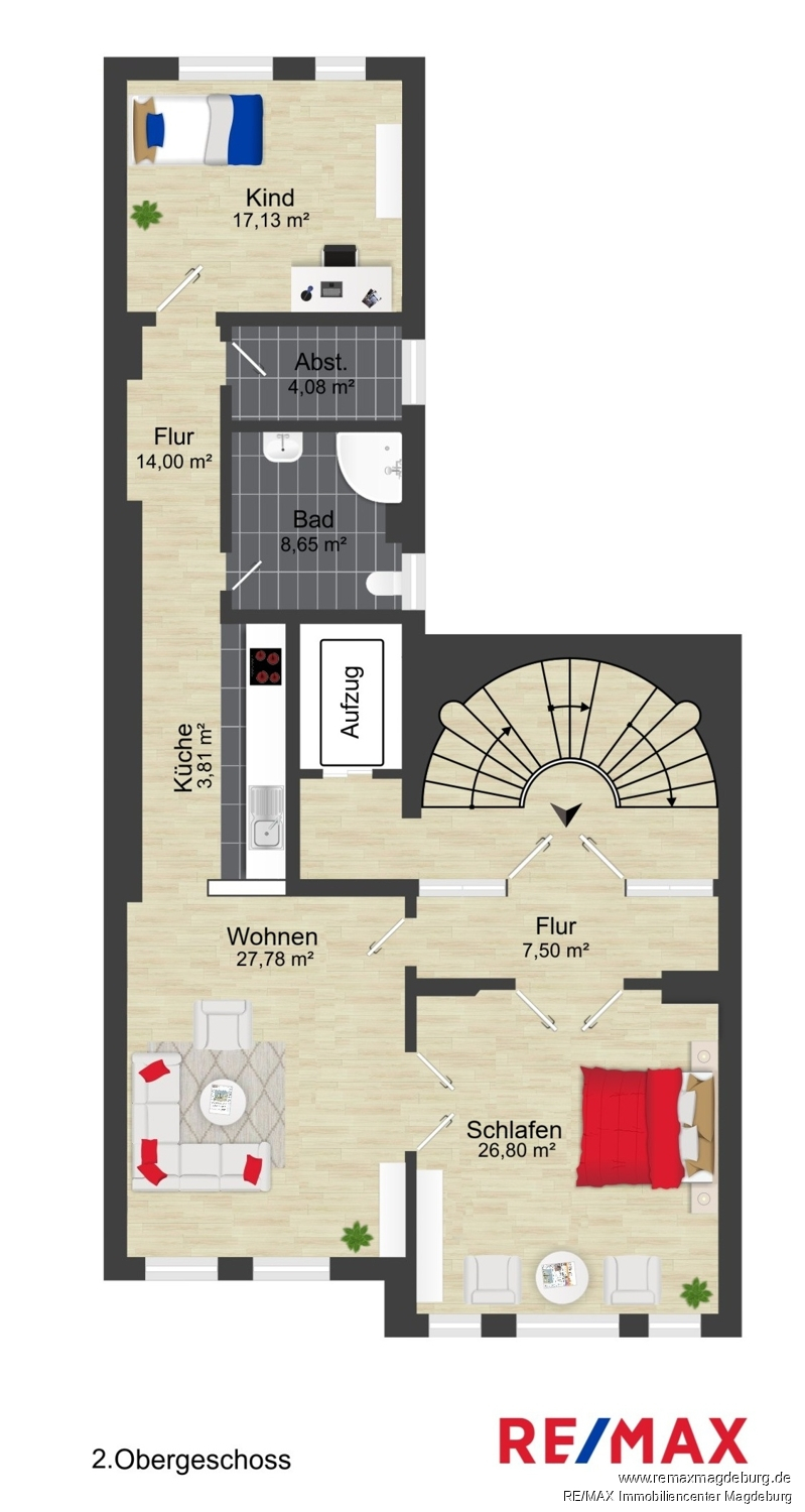 Die Wohneinheit im 2.Obergeschoss ist wie folgt aufgeteilt: - Flur, - Schlafen, - Wohnen, - Flur, - Küche, - Tageslichtbad mit Badewann, - Abstellraum, - Kind,