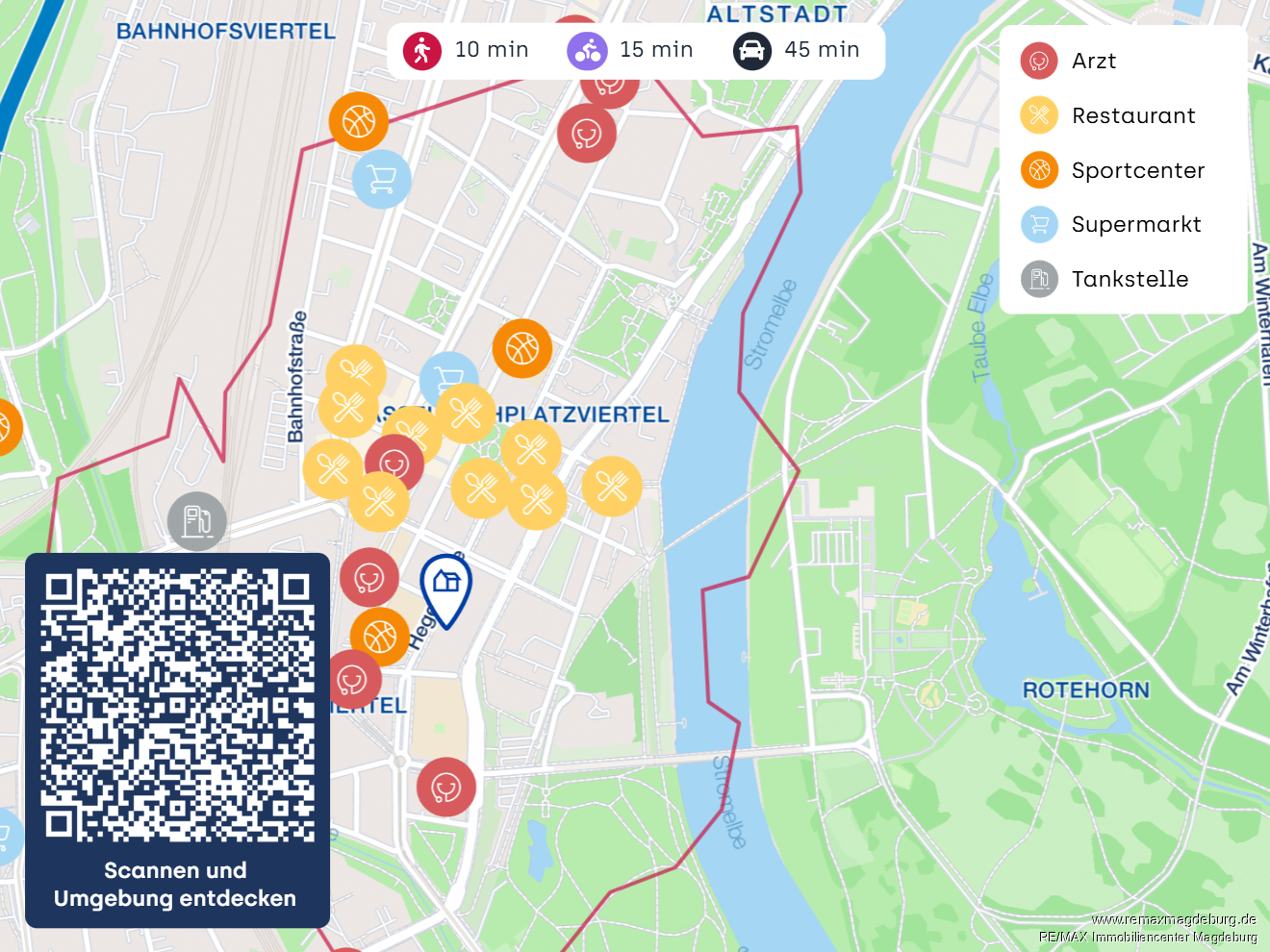 Die Gewerbeeinheit befindet sich in einer der begehrtesten Lagen Magdeburgs, mitten in der historischen Altstadt. Die Umgebung verbindet traditionelle Architektur mit urbanem Flair, zahlreiche denkmalgeschützte Gebäude prägen das Stadtbild und schaffen ein einzigartiges Wohnambiente.