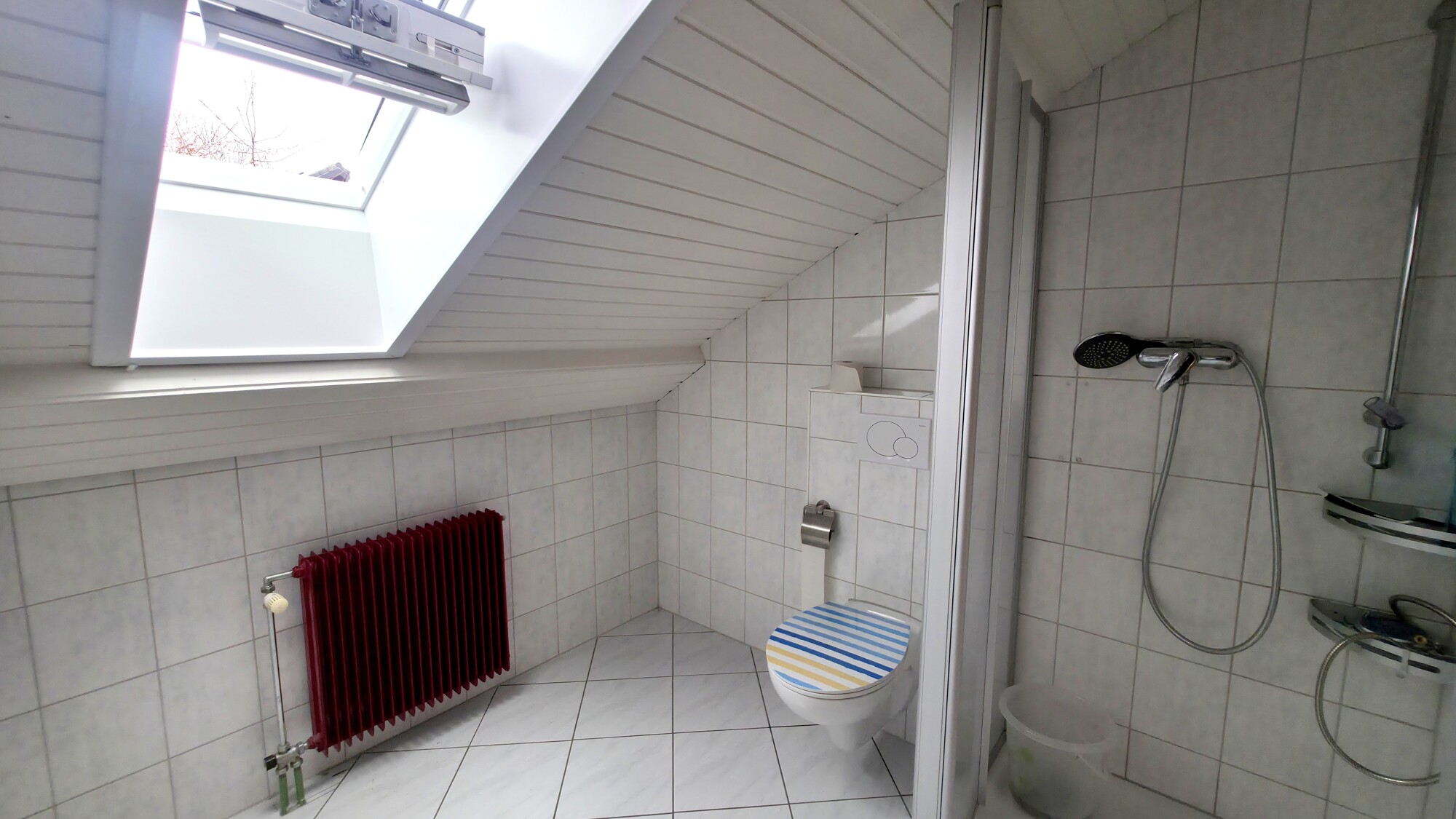 Die ausgestattete Küche umfasst ein Glaskeramik-Kochfeld, einen Kühlschrank sowie eine Spüle. Das angrenzende Badezimmer ist mit einer modernen Eckdusche und einem Dachschrägenfenster versehen, welches für reichlich Tageslicht sorgt.