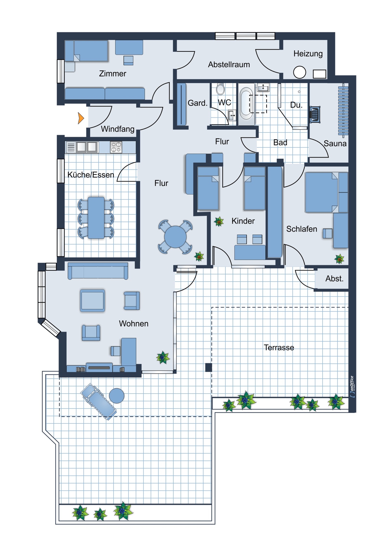 Ansicht WohnungEingangFlurFlurWohnenWohnenWohnenFlurSchlafenSchlafenBad mit SaunaBadSaunaBadKinderzimmerZimmer / BüroKüche mit EssbereichAusblickTerrasseTerrasseTerrasseTerrasseGarageGrundrissAusblick Terrasse
