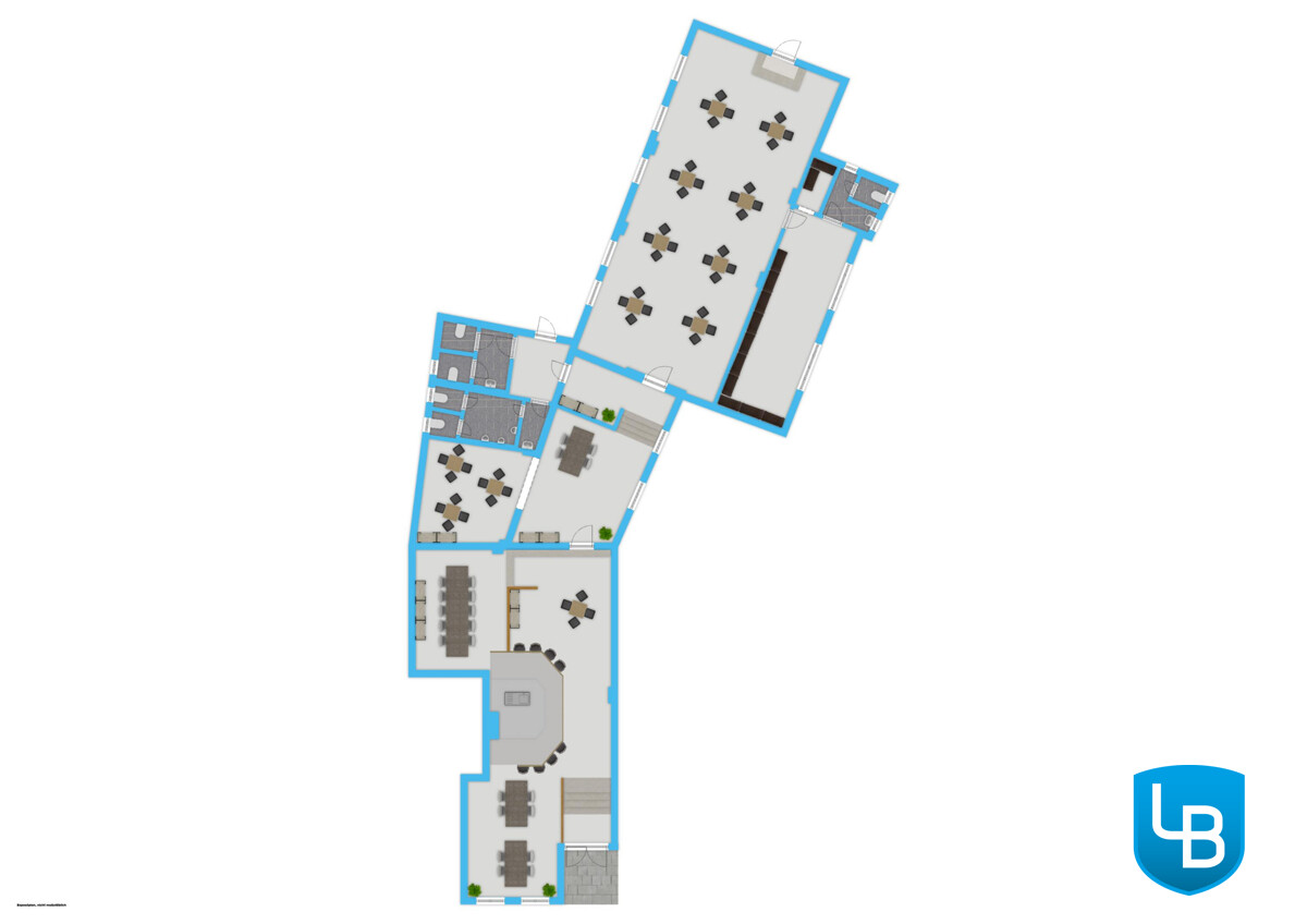 Im Erdgeschoss beziehungsweise Hochparterre eines Mehrfamilienhauses aus der Jahrhundertwende mit insgesamt sechs Wohneinheiten befindet sich diese großzügige Gewerbeeinheit von ca. 268 m² Nutzfläche, die sich ideal für vielfältige Nutzungskonzepte anbietet. Bereits beim Betreten der Einheit empfängt ein einladender Eingangsbereich die Besucher, in dem ein repräsentativer Tresen zentral positioniert ist und als erste Anlaufstelle dient. Die Räumlichkeiten erstrecken sich über die gesamte Länge der angebotenen Fläche – von der Straßenseite bis in den hinteren Bereich des Hauses – und bieten somit eine großzügige Raumwirkung mit flexiblen Gestaltungsmöglichkeiten.