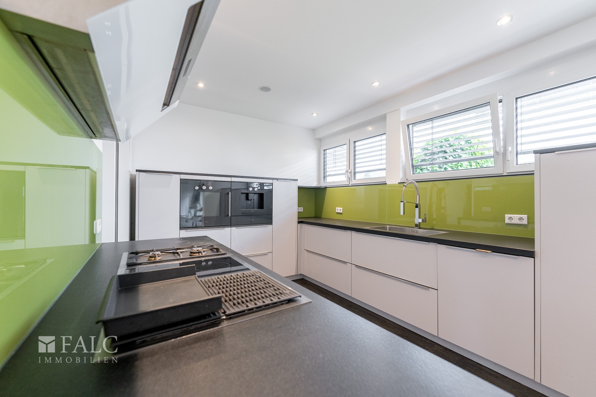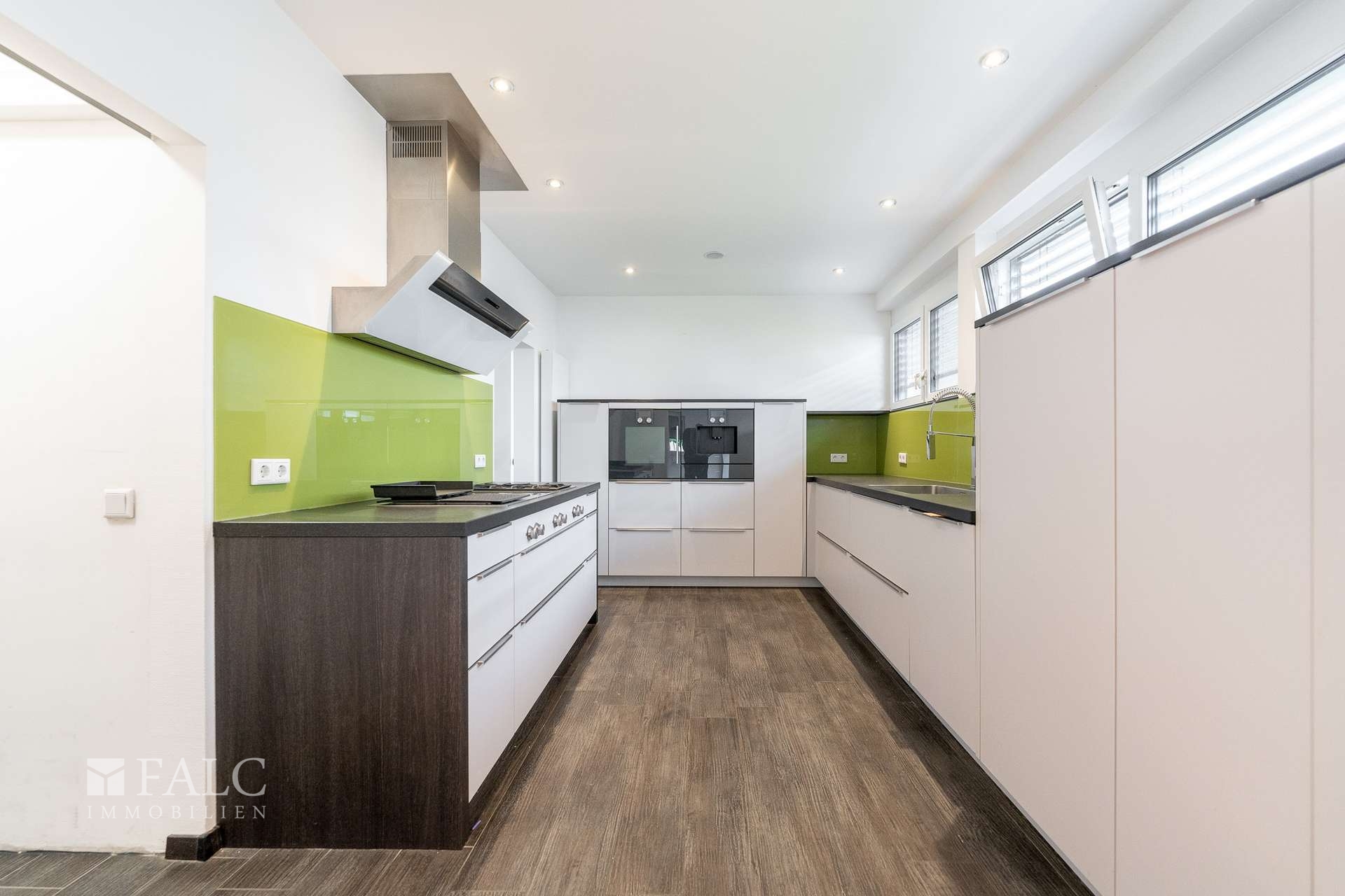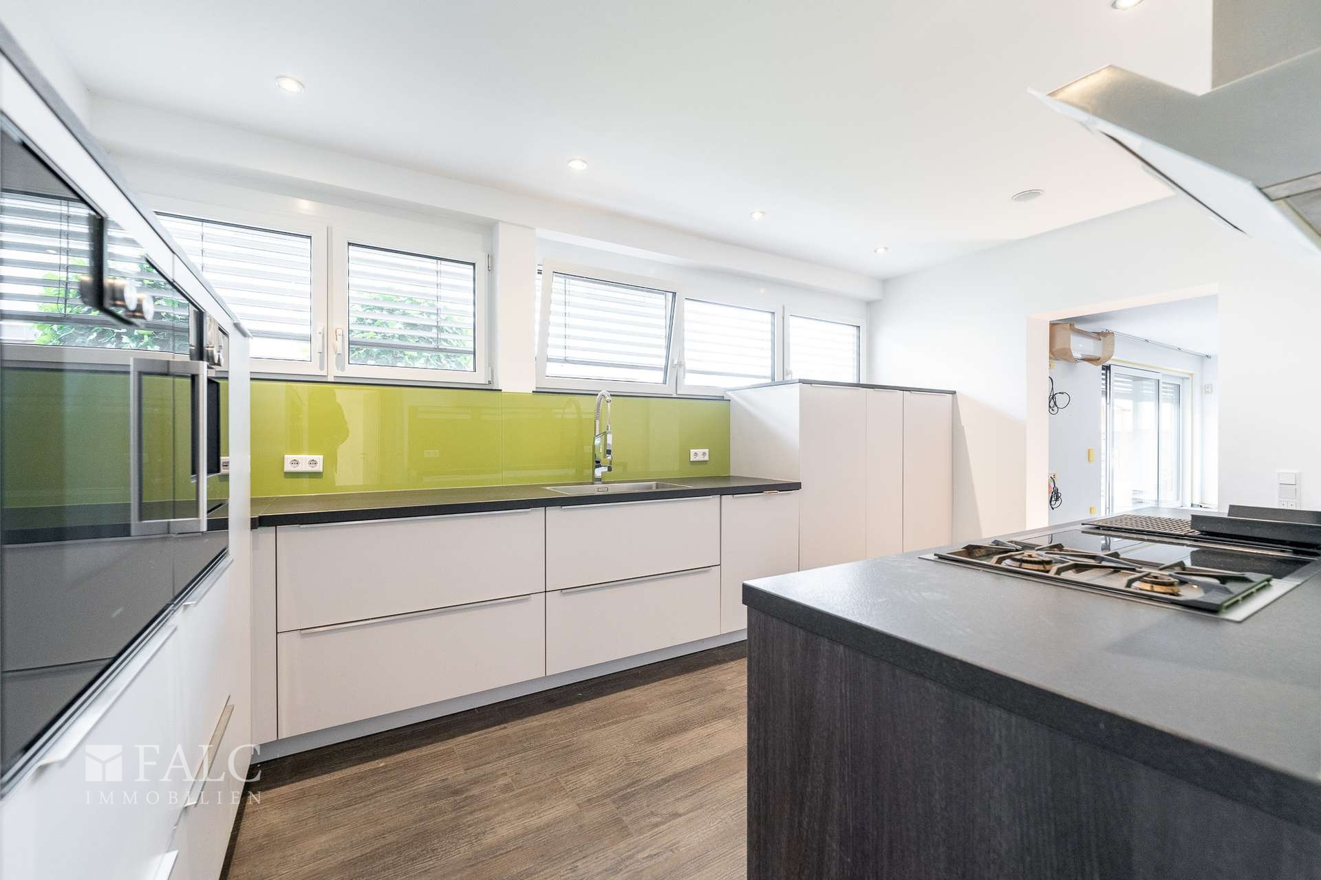 Die Küche ist modern gestaltet und bietet viel Platz für kulinarische Aktivitäten. Sie ist mit hochwertigen Geräten ausgestattet und bietet ausreichend Stauraum. Angrenzend befindet sich das helle Wohn- und Esszimmer, das durch große Fenster viel Tageslicht erhält. Von hier aus haben Sie Zugang zur Terrasse, der einen schönen Blick ins Grüne bietet und zum Entspannen einlädt.