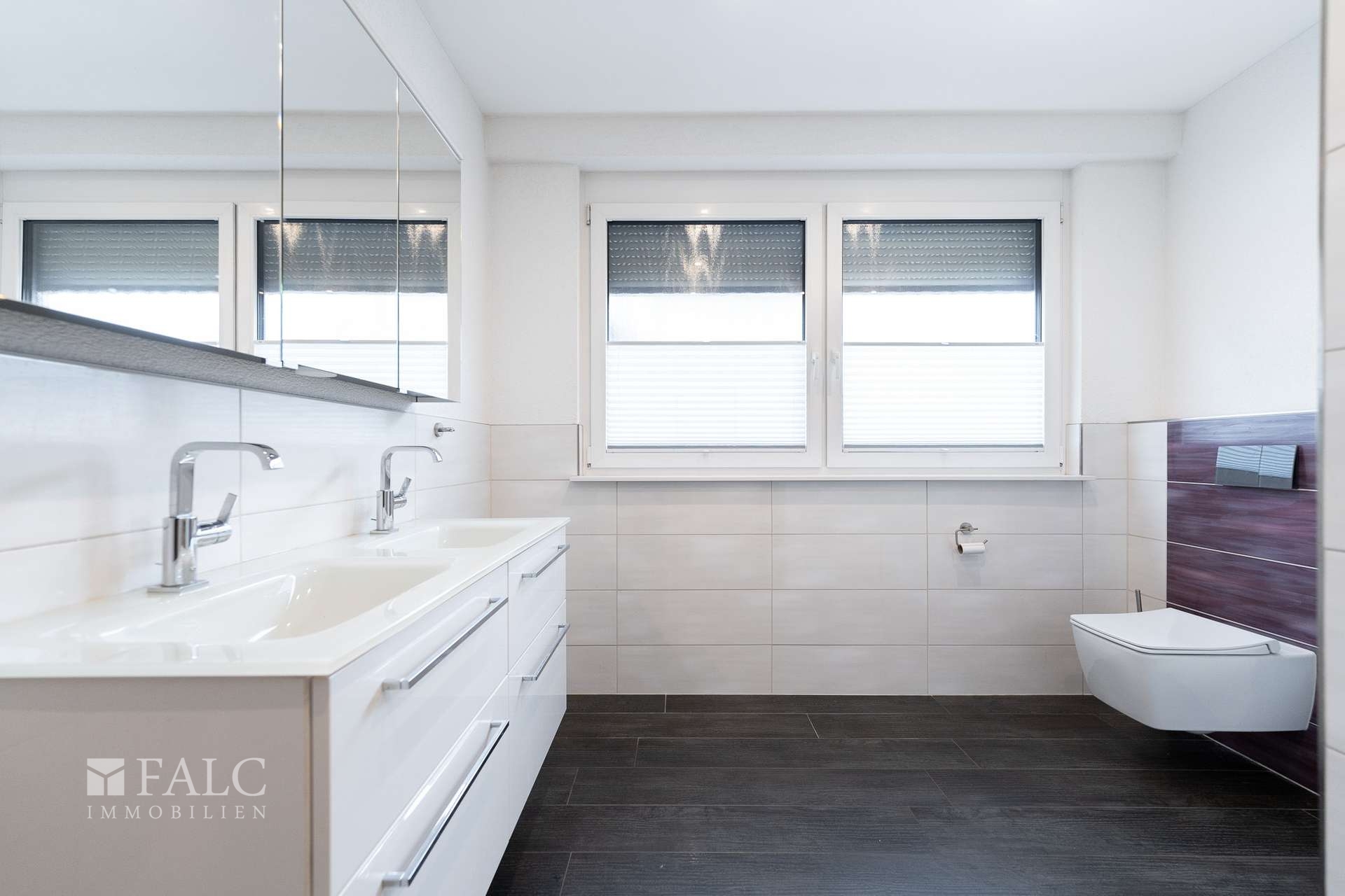 Das Badezimmer ist modern gefliest und mit einer Dusche sowie einem Doppelwaschbecken ausgestattet. Zusätzlich gibt es ein praktisches Gäste-WC, das den Komfort für Besucher erhöht.