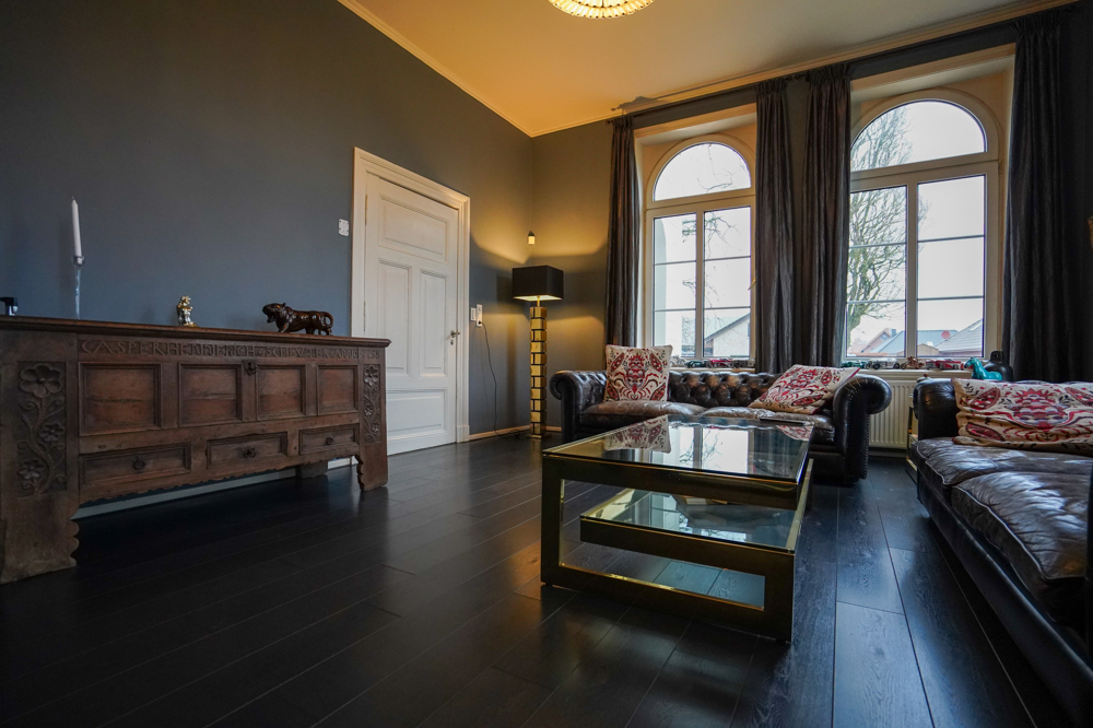 Die Wohnräume beeindrucken durch ihre Großzügigkeit, hohe Decken und lichtdurchflutete Raumwirkung. Große Fensterflächen sorgen für eine angenehme Atmosphäre und unterstreichen den besonderen Charakter des Hauses. Die Einrichtung ist geschmackvoll und hochwertig, mit einer gelungenen Kombination aus klassischen Elementen und modernen Akzenten.