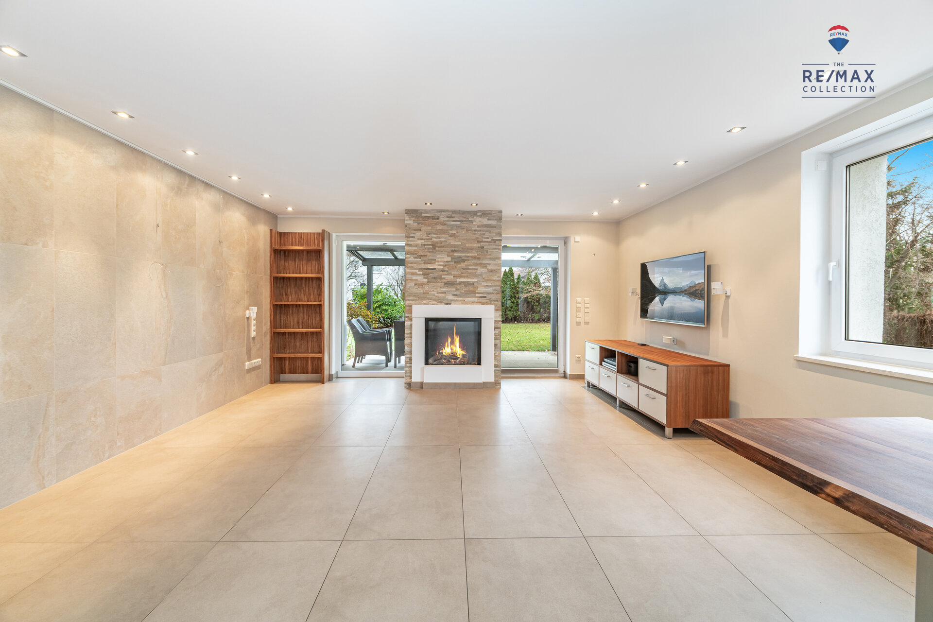 Das Haus verfügt über 6 Zimmer und 2 modernisierte Badezimmer. Im Erdgeschoss empfängt Sie ein großzügiger Flur mit ausreichend Platz für eine Garderobe. Links liegt ein helles Schlafzimmer, rechts ein Badezimmer mit Dusche und Badewanne sowie ein Gäste-WC und ein Büro oder Kinderzimmer. Das Herzstück des EG bildet das großzügige Wohnzimmer mit offen gestalteter, moderner Küche von Bulthaup mit großer Kochinsel – hier sorgt ein gemütlicher Kamin zusätzlich für ein besonderes Wohnambiente.