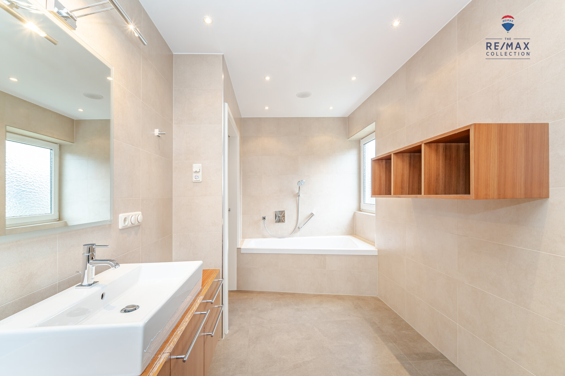 Im Obergeschoss ist die Raumaufteilung ähnlich: Schlafzimmer und Badezimmer sind wie im Erdgeschoss angeordnet. Daneben befindet sich ein separater Raum für die Küche, der flexibel genutzt werden kann. Das Kinderzimmer und ein weiteres Wohnzimmer mit ca. 35 m² bieten viel Platz, wobei letzteres Zugang zum Balkon hat und viel Tageslicht hereinlässt.