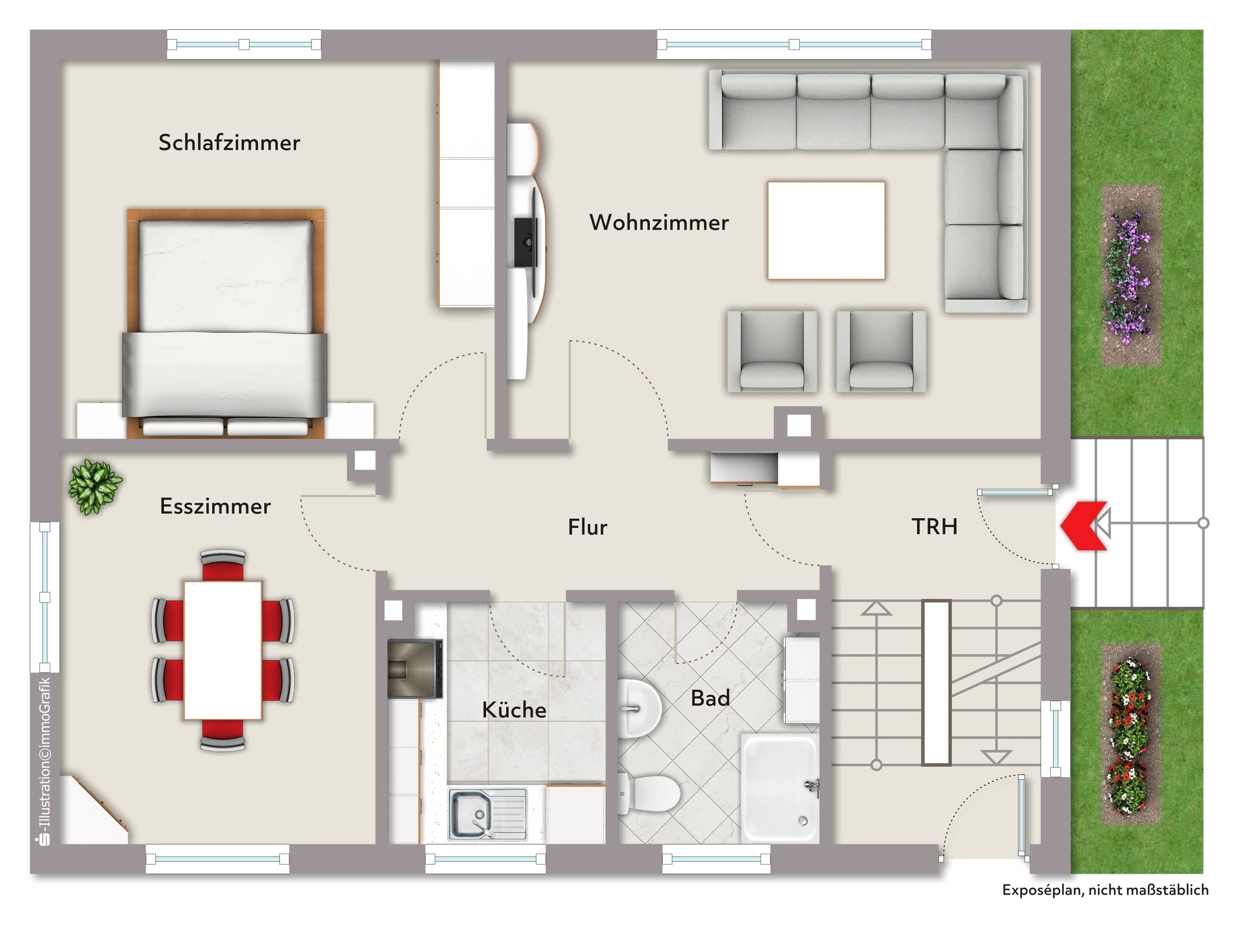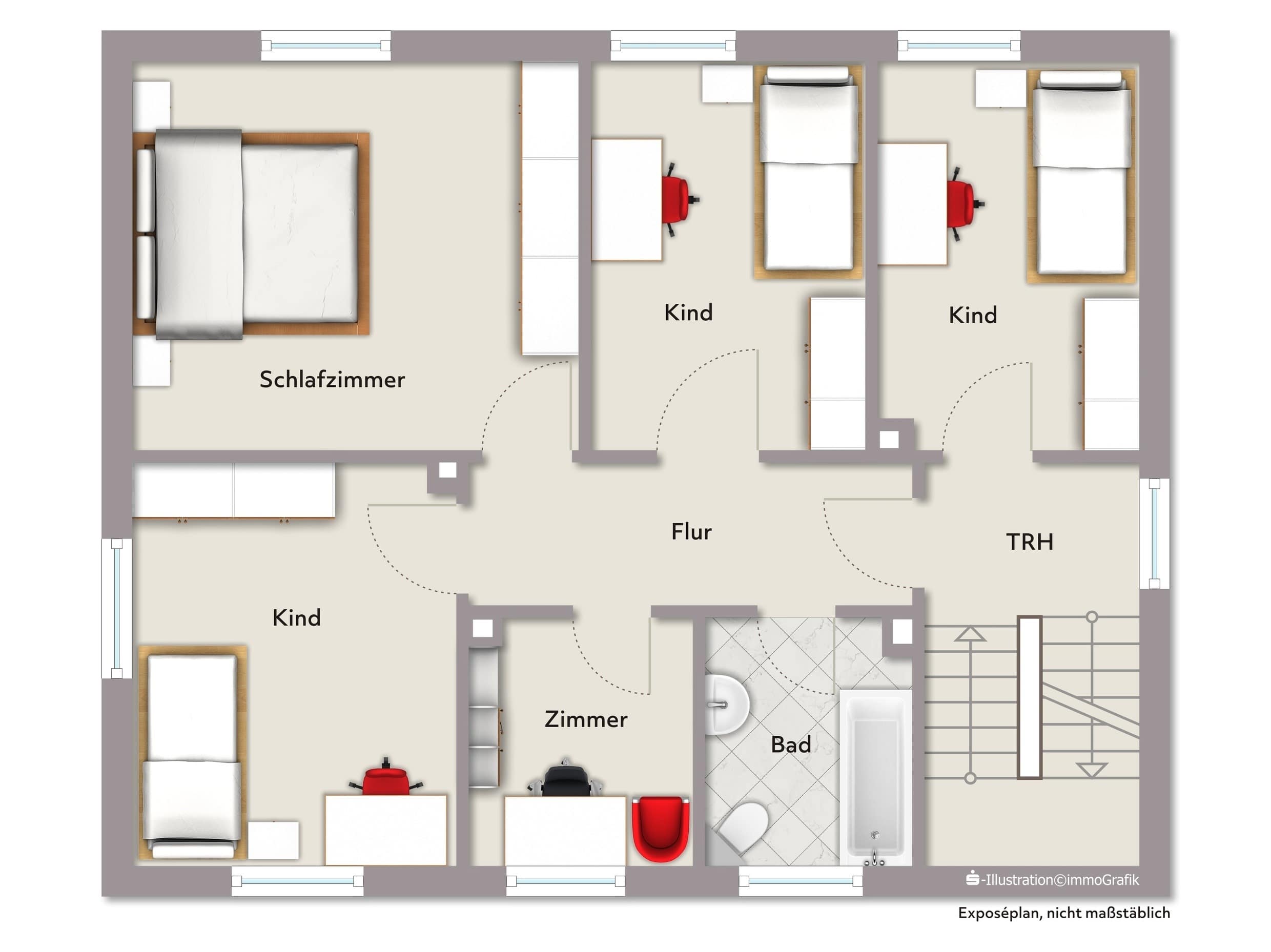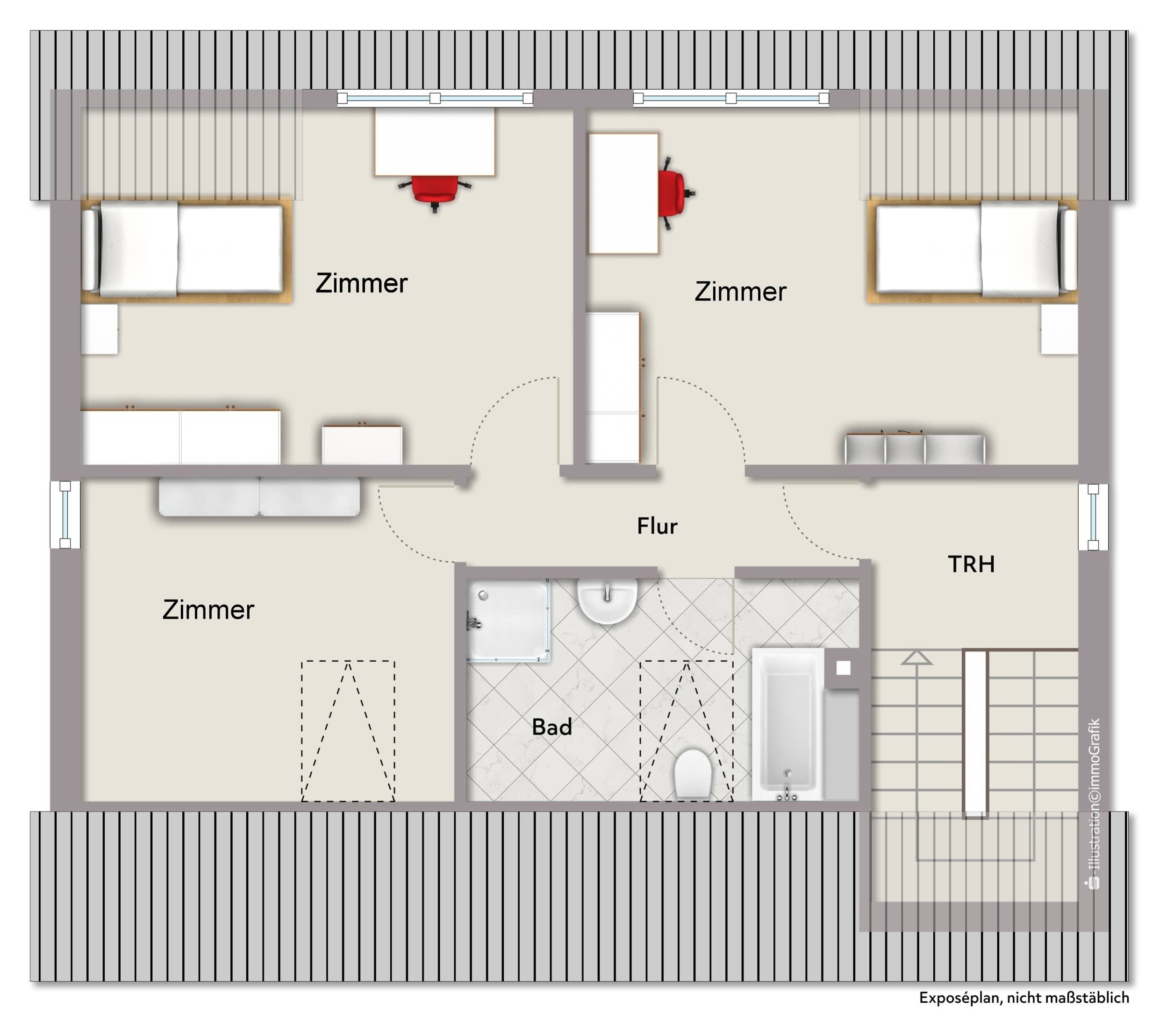 Das Dachgeschoss erweitert das Raumangebot und kann vorbehaltlich einer Genehmigung durch das Bauamt weiter ausgebaut werden. Ein Ausbauvorschlag finden Sie in den Grundrissen.