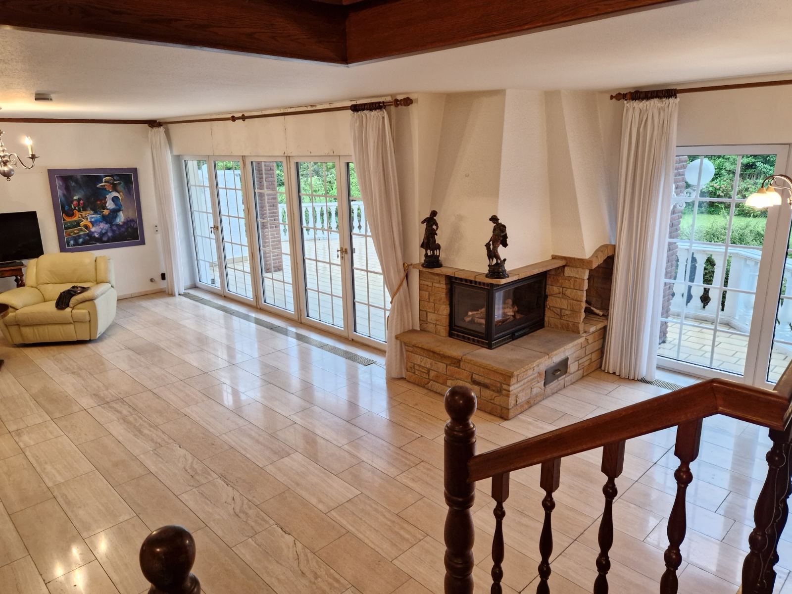 Die Wohnfläche von insgesamt 196 m² verteilt sich auf das Erd- und Dachgeschoss. Die einladende Eingangstür führt in den vertäfelten Windfang. Über eine Diele betritt man das Esszimmer und befindet sich danach im großzügigen offenen Wohnbereich mit Panoramafenstern und Kaminecke. Dieser lichtdurchflutete Wohnbereich ermöglicht Wohnen auf hohem Niveau. Panoramafenster leiten auf eine große Terrasse mit offenem Kamin. Von dort genießt man den phantastischen Blick in den schönen Garten. Über die exklusive, massive Holztreppe mit integriertem Bücherregal gelangt man ins Dachgeschoss, in dem sich zwei Schlafzimmer und ein Tageslichtbad mit Badewanne, Dusche, WC und zwei Waschbecken befinden.