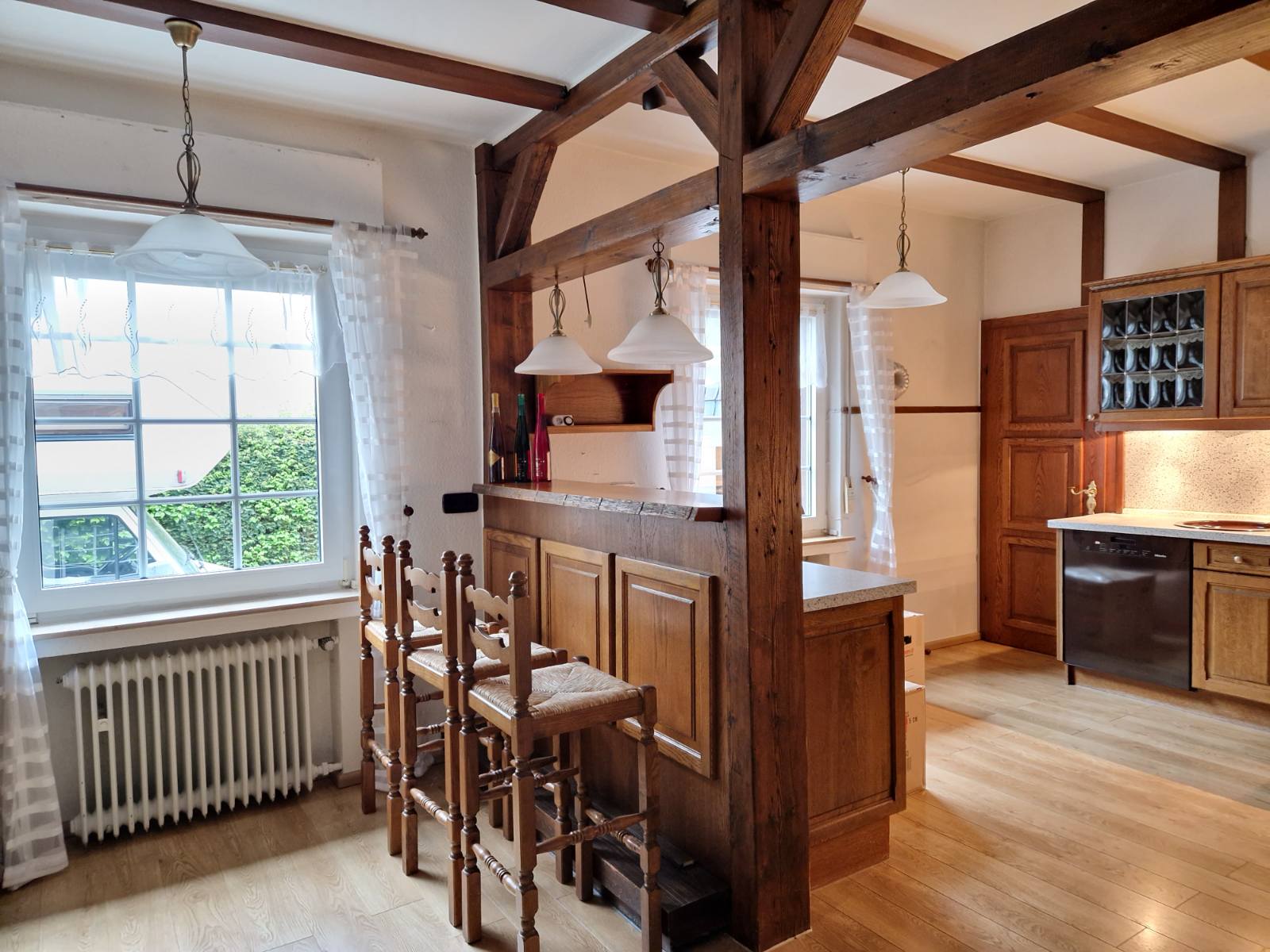 Die Einliegerwohnung mit separatem Eingang und einer Wohnfläche von ca. 67 m² kann ebenfalls bei Bedarf ins Haupthaus integriert werden. Sie besteht aus Wohnzimmer, Schlafzimmer, Küche, Tageslichtbad mit Badewanne, WC und zwei Waschbecken.