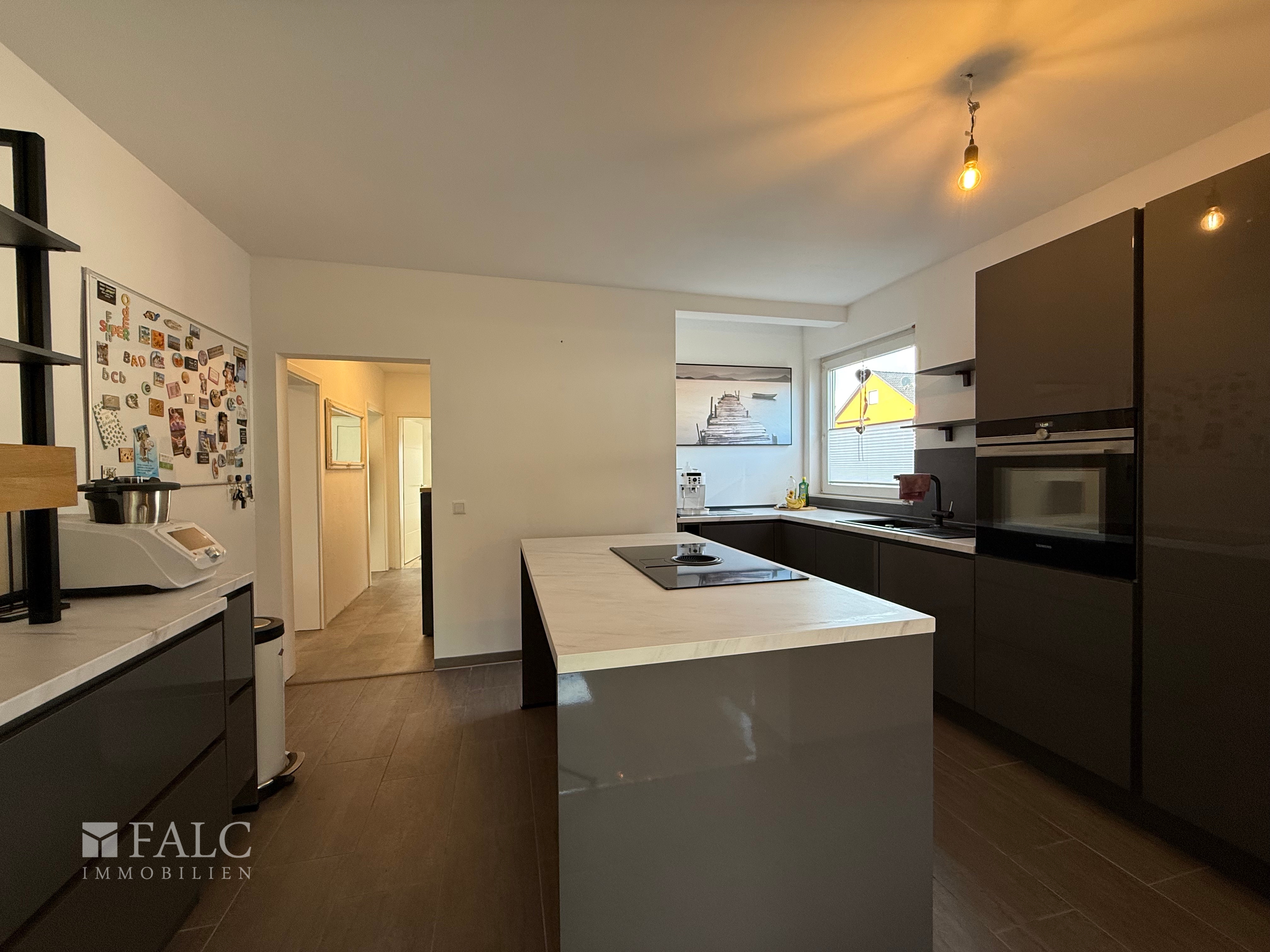 Die angrenzende Küche ist modern und funktional ausgestattet – mit hochwertigen Elektrogeräten, viel Stauraum und einer klaren Linienführung, die Kochen zum Vergnügen macht. Direkt daneben liegt das offen gestaltete Esszimmer, das ideal für gesellige Abende oder gemeinsame Mahlzeiten geeignet ist.