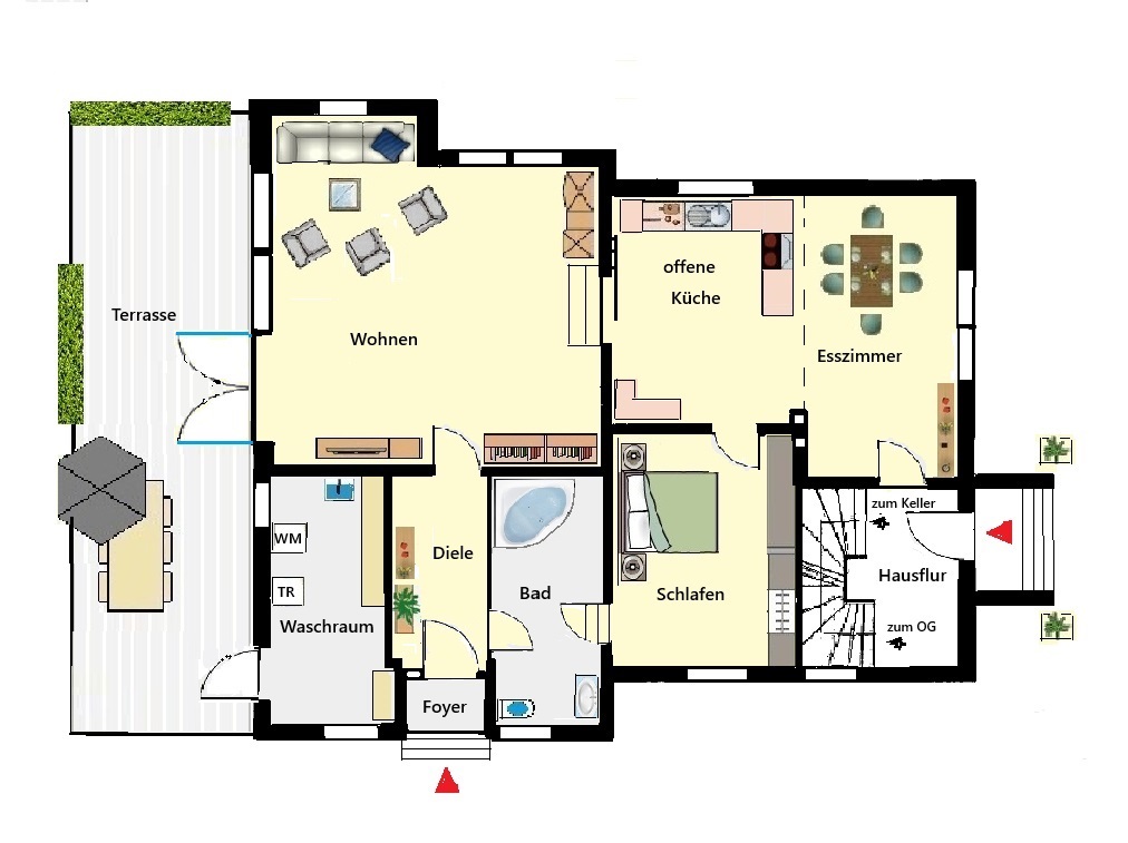 Vorderansicht mit Eingang OGHinteransicht mit Terrassegepflegter Gartenbereichca. 40 m² Terrasseheller Wohnraum EGWohnraum EGoffene Küche mit EsszimmerSchlafraumgroßzügiger Flur EGhelles Badezimmermoderne BadewanneTreppengang zum OGgroßräumiges WohnenRaumplanung möglich! Wohnung OG mit viel PlatzBad mit Dusche OGBad mit Fenster OGGemeinschaftswaschküche Zufahrtsweg zur ImmobilieGrundriss ErdgeschossGrundriss ObergeschossGrundriss KellerLageplan Immobilie und GartenWir beraten Sie gerne!Eingang zur EG - Wohnung