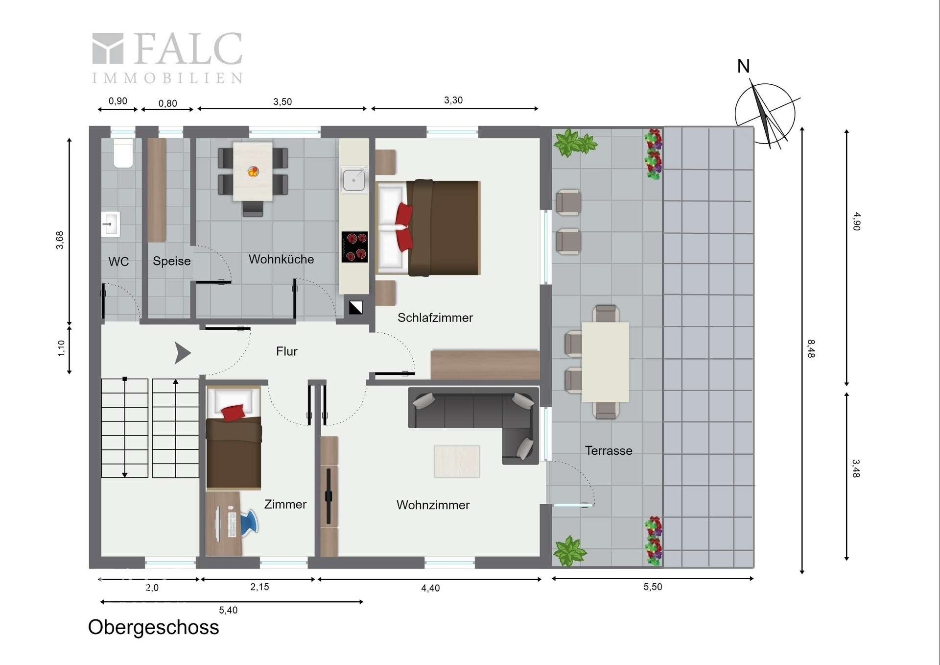 Durchlaufen Sie das 1. Stockwerk nach Oben gelangen Sie in das 1. Obergeschoss des Einfamilienhauses. Hier erwartet sie eine Wohnküche, dass ebenfalls über einen Speiseraum verfügt, 2 Zimmer die als Schlafzimmer verwirklicht werden können und ein weiteres Zimmer, dass als Wohnzimmer gestaltet werden kann. Highlight im 1. Obergeschoss ist Ihre XXL-Terrasse, der Ihnen direkten Zugang vom Wohnzimmer aus bietet. Das WC befindet sich im Treppenhaus auf der Obergeschoss-Etage und kann sep. betreten werden. Dieser eignet sich praktischerweise als Gäste-WC.
