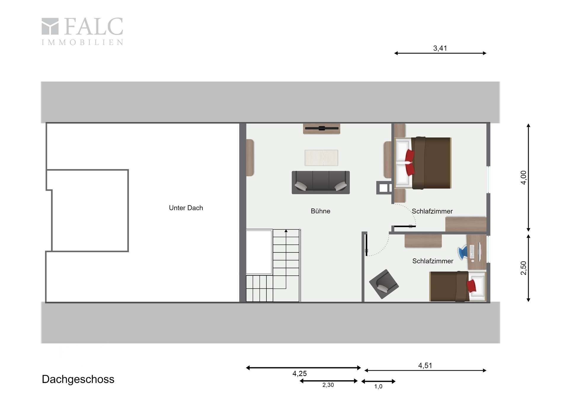 Das ausgebaute Dachgeschoss stellt Ihnen ebenfalls genügend Räumlichkeiten zur Verfügung. 2 Schlafzimmer sowie ein Dachstudio finden hier seinen Platz. Hier eignet sich das Dachgeschoss ideal dafür um eine komplette Gäste-Etage oder ein Hobbystudio mit einem Büro und einem Fitnessraum zu verwirklichen.