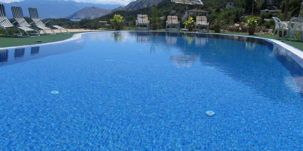 Im Außenbereich ist der große Garten mit Liegefläche und großem Pool, von wo aus man einen traumhaften Blick auf die Umgebung und das Meer hat.