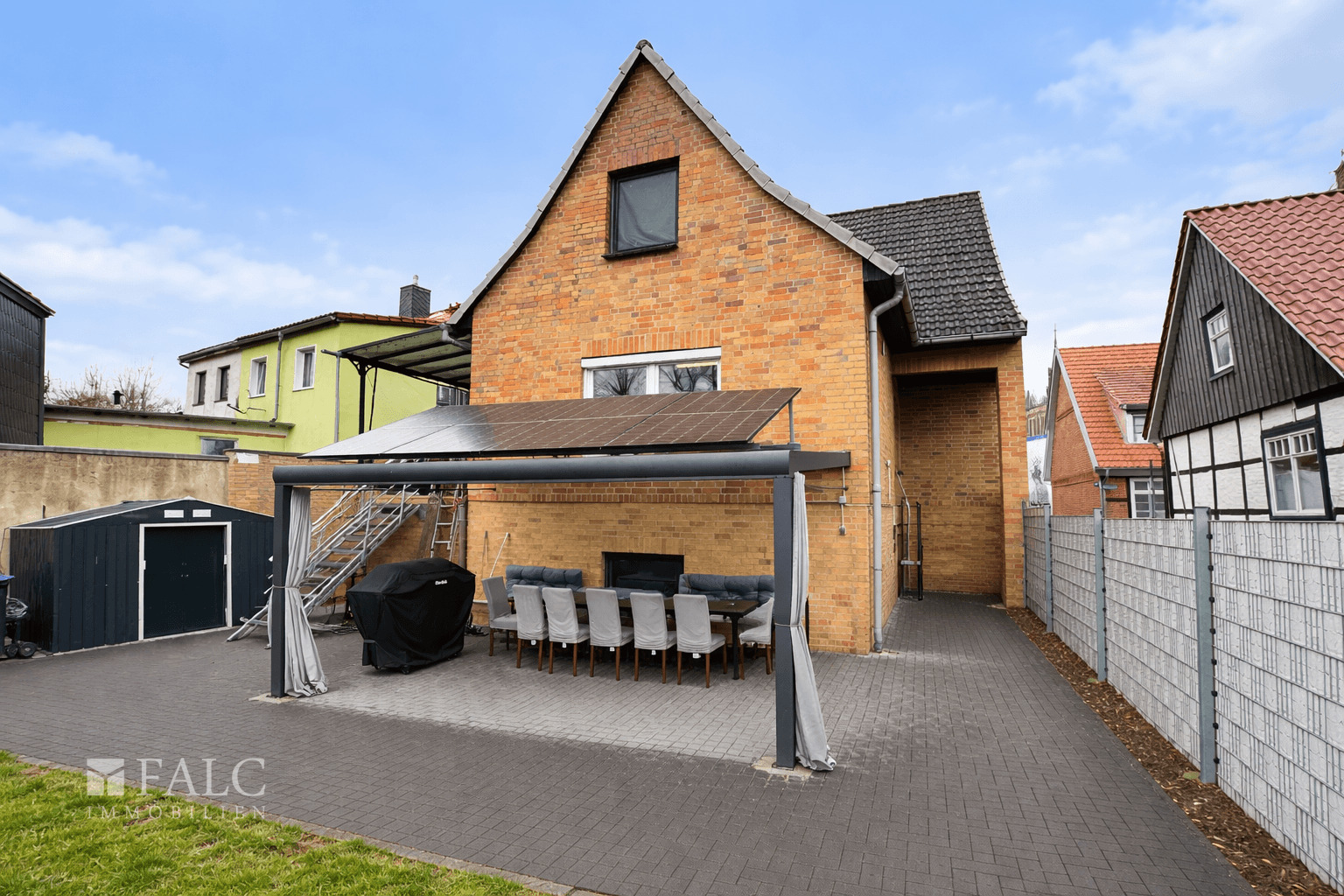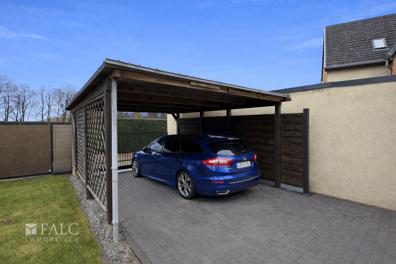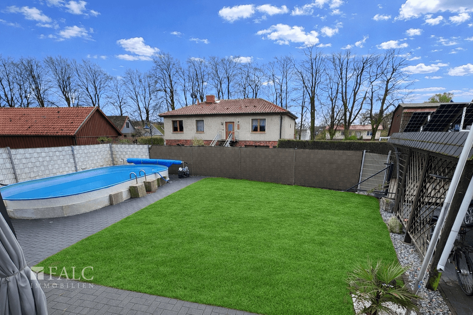 Außenbereich: - überdachte Terrasse im Garten mit Photovoltaikanlage - Carport als PKW-Stellplatz