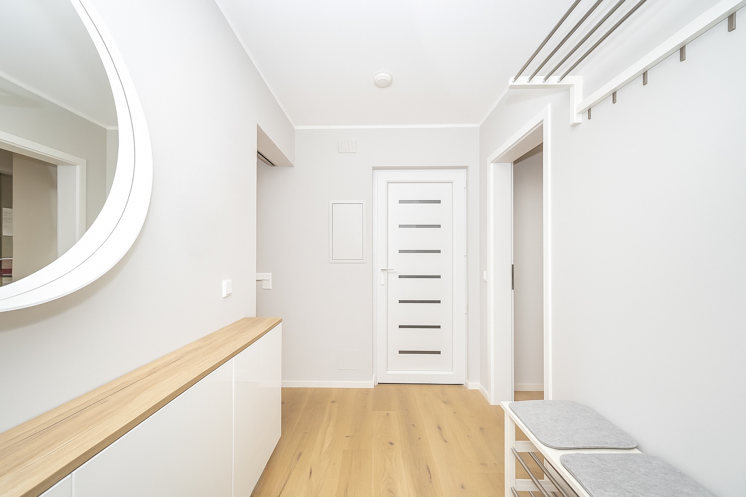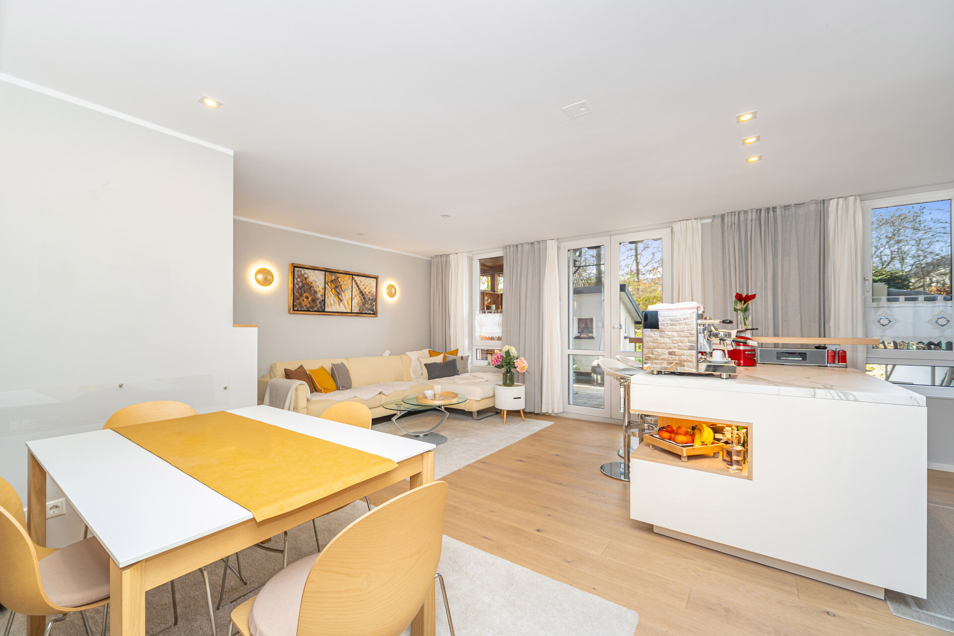 Über den einladenden Flur gelangen Sie in alle Räume – hier findet sich ausreichend Platz für eine praktische Garderobe. Der helle Wohnbereich mit hochwertigem Parkettboden öffnet sich zur modernen, großzügig gestalteten Küche, die mit Markengeräten ausgestattet ist und zusammen mit der beleuchteten Kücheninsel mit integrierter Bar für ein gemütliches Wohnambiente sorgt. Eine elegante Glasschiebetür trennt Wohn-/Essbereich und Flur und ermöglicht auf Wunsch eine offene oder geschlossene Raumgestaltung.