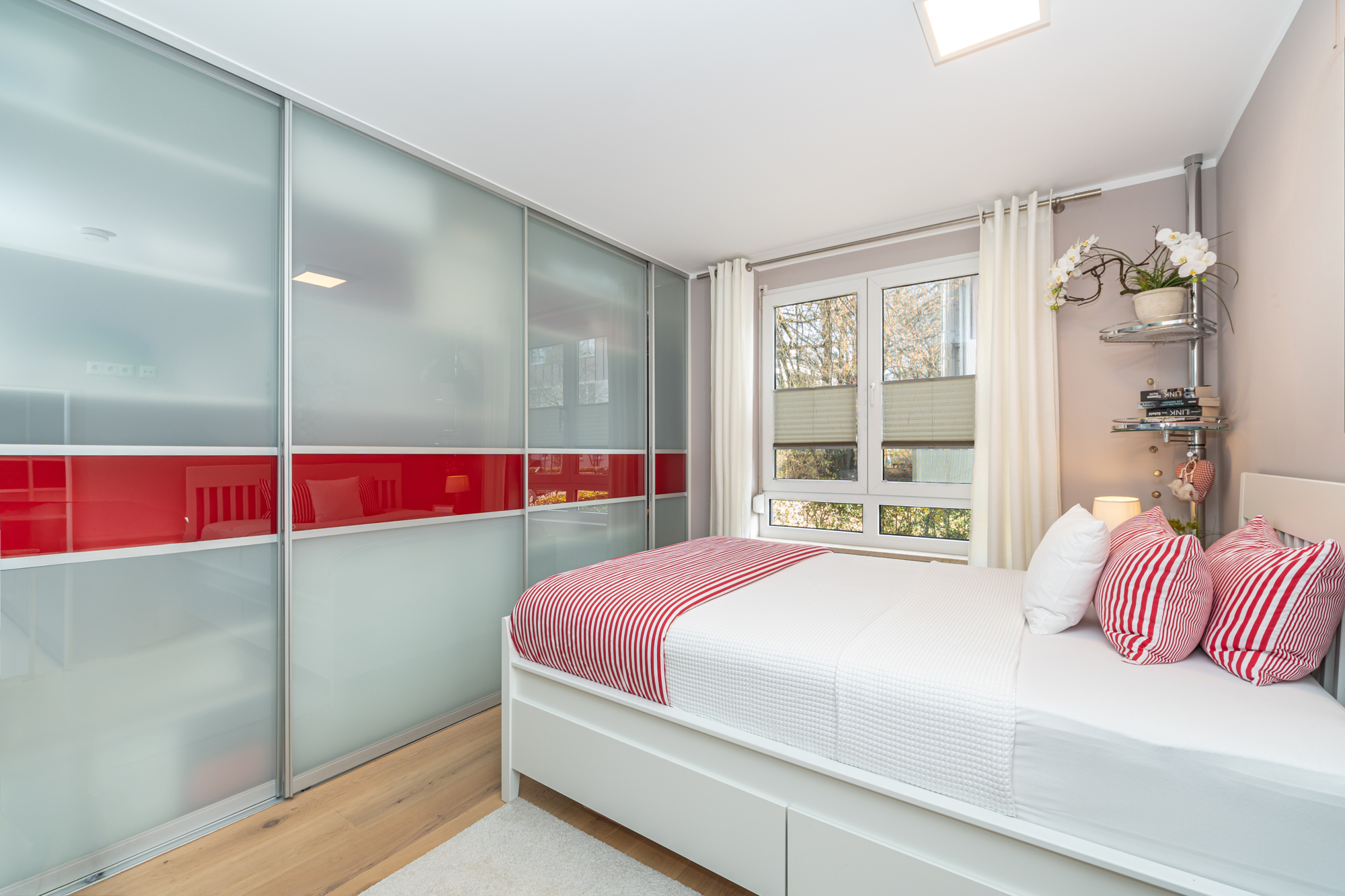 Das Schlafzimmer überzeugt durch seine Großzügigkeit, einen praktischen Einbauschrank sowie ein großes Fenster, das viel Tageslicht bietet. Ein weiteres Zimmer mit ca. 8 m² eignet sich flexibel als Arbeitszimmer, Gästezimmer oder Ankleide. Das moderne Badezimmer ist in warmen Beigetönen gestaltet und verfügt über eine geräumige Regendusche mit zwei beleuchteten Wandablageflächen, ein Waschbecken und ein WC. Einen Handtuchheizkörper und eine elektrische Fußbodenheizung bieten zusätzlichen Komfort.