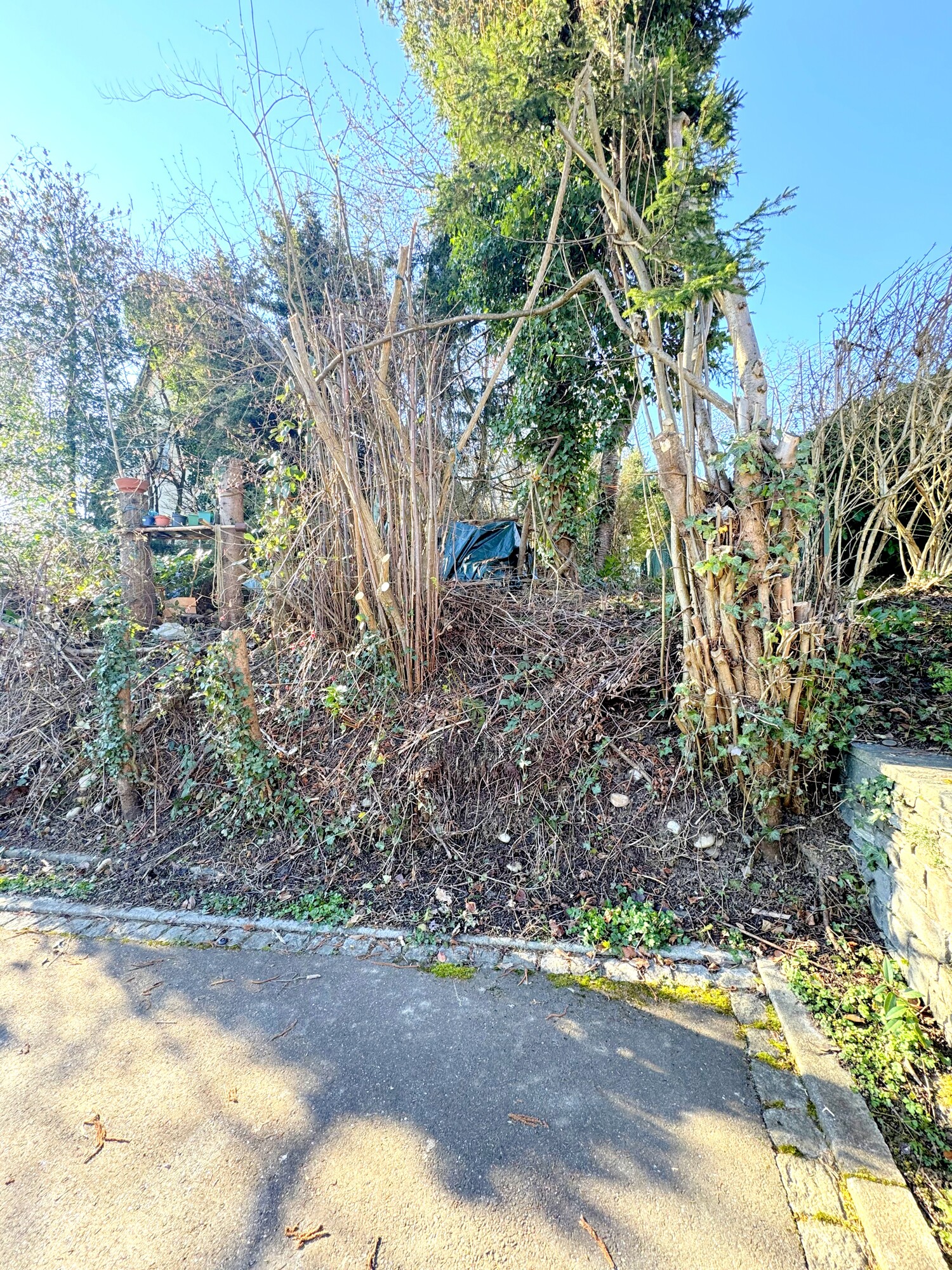 - Grundstück für Wohnen mit 1047 m² Grundstücksfläche - Grundstücksgrenzen im Lagebild markiert - Zufahrt über befestigte Asphaltfläche e - Teilweise eingefasste Grundstückskante mit Bordstein und niedriger Stützkante