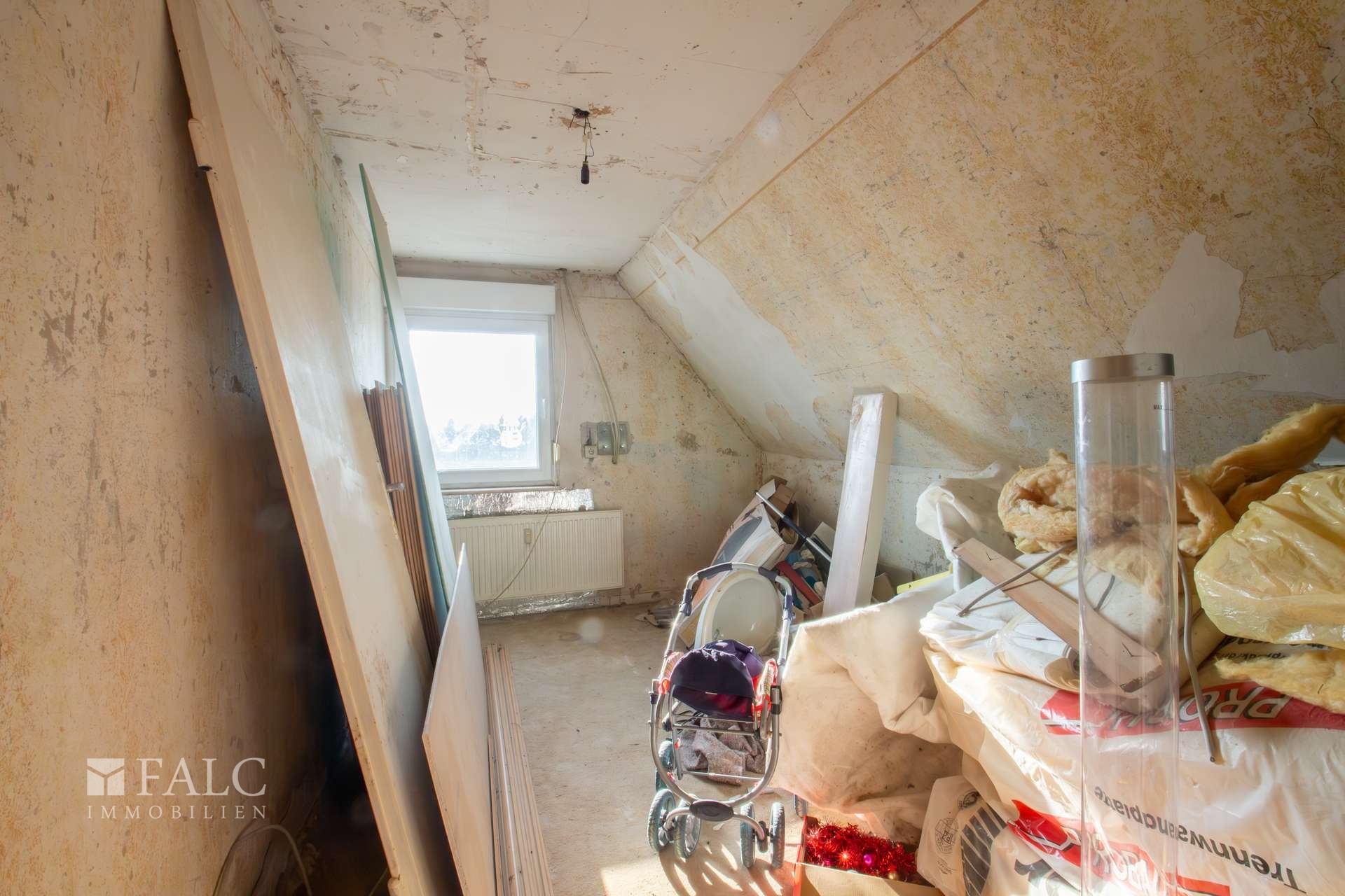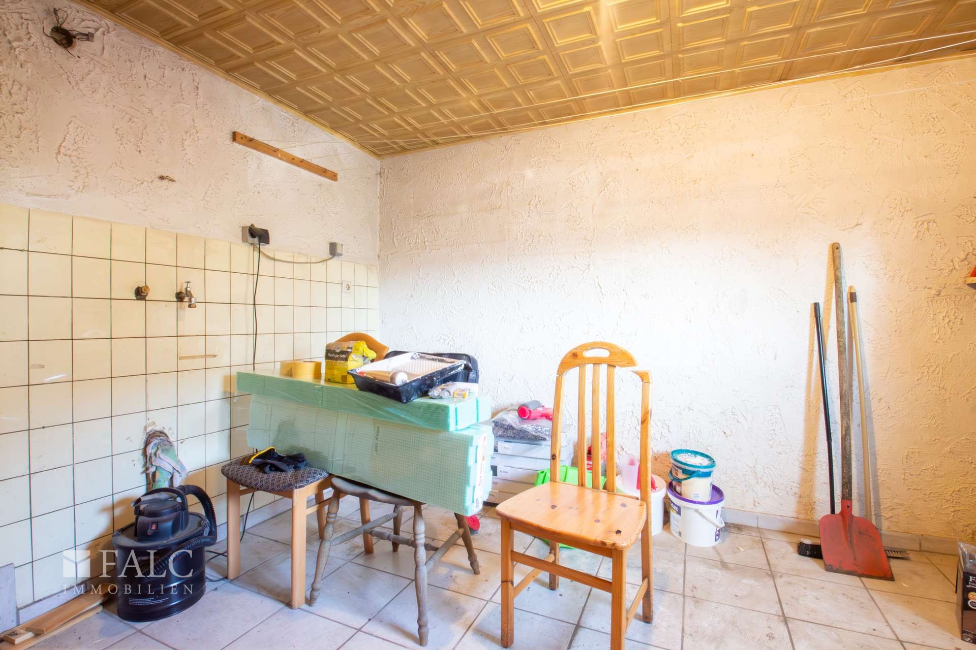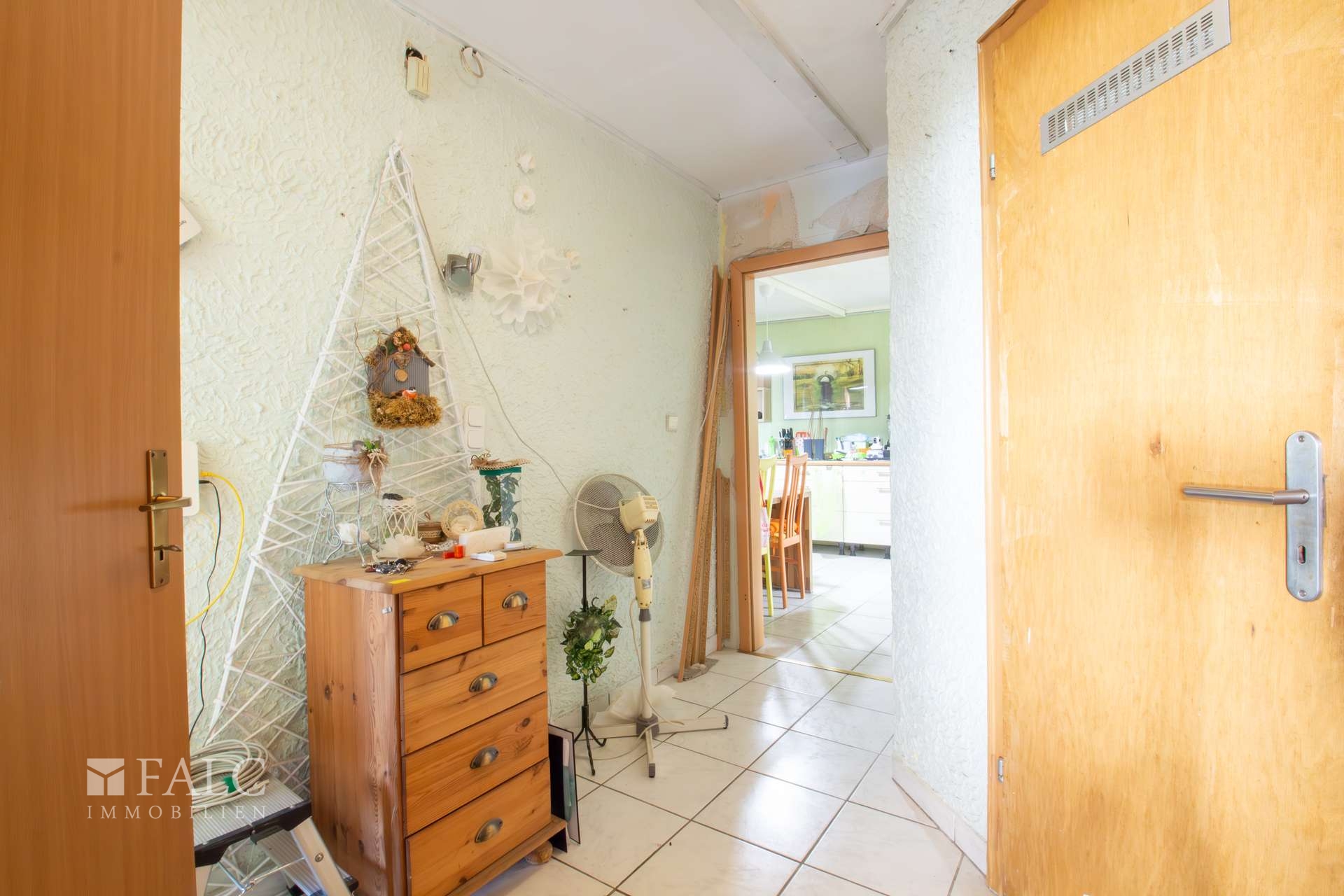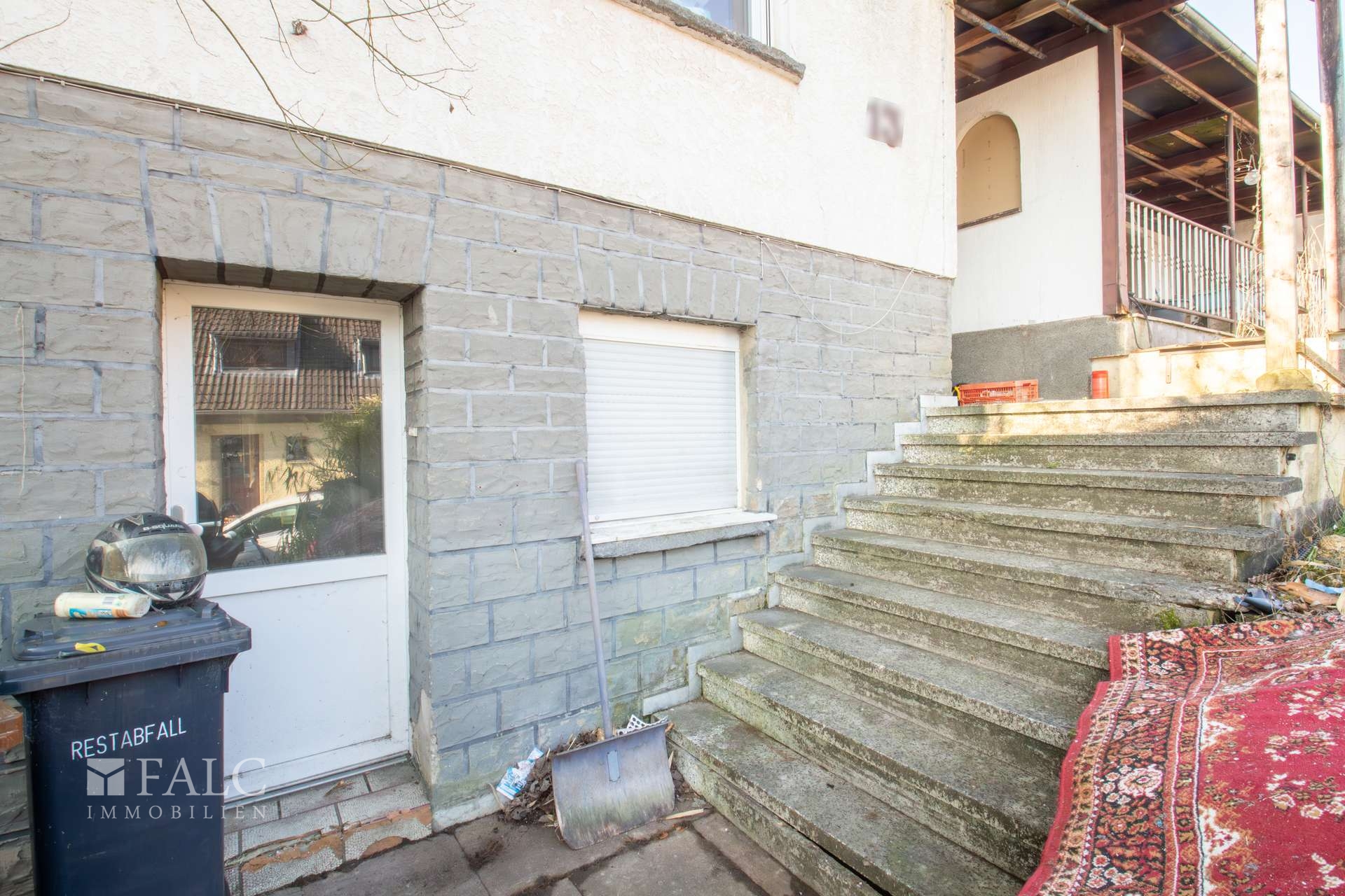 Im folgenden Text wird das linke Wohnhaus näher beschrieben. Es wurde ungefähr im Jahre 1957 errichtet und bietet eine Wohnfläche von ca. 174 m² verteilt auf mehreren Etagen. Es eröffnet damit vielfältige Nutzungsmöglichkeiten für Großfamilien oder auch für die Kombination aus Wohnen und Arbeiten unter einem Dach. Der Haupteingang befindet sich im Erdgeschoss und führt zunächst in eine Diele und anschließend in einen Flur. Von hier aus sind die wichtigsten Räume dieser Etage erreichbar. Dazu zählen eine Küche, eine Abstellkammer sowie ein großzügiges Wohn- und Esszimmer. Vom Flur aus besteht außerdem ein Zugang zum Garten- und Terrassenbereich sowie zur Treppe in das Obergeschoss. Hier befinden sich unter anderem ein Elternschlafzimmer mit einem angrenzenden Raum, der sich ideal als Ankleide nutzen lässt, ein Büro und ein Badezimmer. Vom Flur aus führt eine weitere Treppe in das ausgebaute Dachgeschoss. Hier stehen zwei zusätzliche Kinderzimmer, eine Abstellkammer und ein Spielzimmer mit einem angrenzenden Badezimmer zur Verfügung. Zurück im Flur des Erdgeschosses gelangt man außerdem in das Kellergeschoss des Wohnhauses. Hier befindet sich eine ca. 34 m² große Einliegerwohnung, die auch über einen separaten Außeneingang erreichbar ist. Zur Einliegerwohnung gehört eine Küche, eine Diele, ein Schlafzimmer und ein Badezimmer. Die Wohnung kann zum Beispiel für Gäste, Familienangehörige oder auch zur Vermietung genutzt werden. Das Wohnhaus befindet sich derzeit in einem renovierungs- bzw. sanierungsbedürftigen Zustand. In einigen Bereichen sind bereits vereinzelt Maßnahmen begonnen worden. Für den Käufer eröffnet sich dadurch die Möglichkeit, die Immobilie nach eigenen Vorstellungen zu gestalten und individuell zu modernisieren.