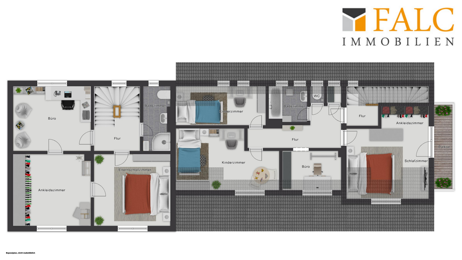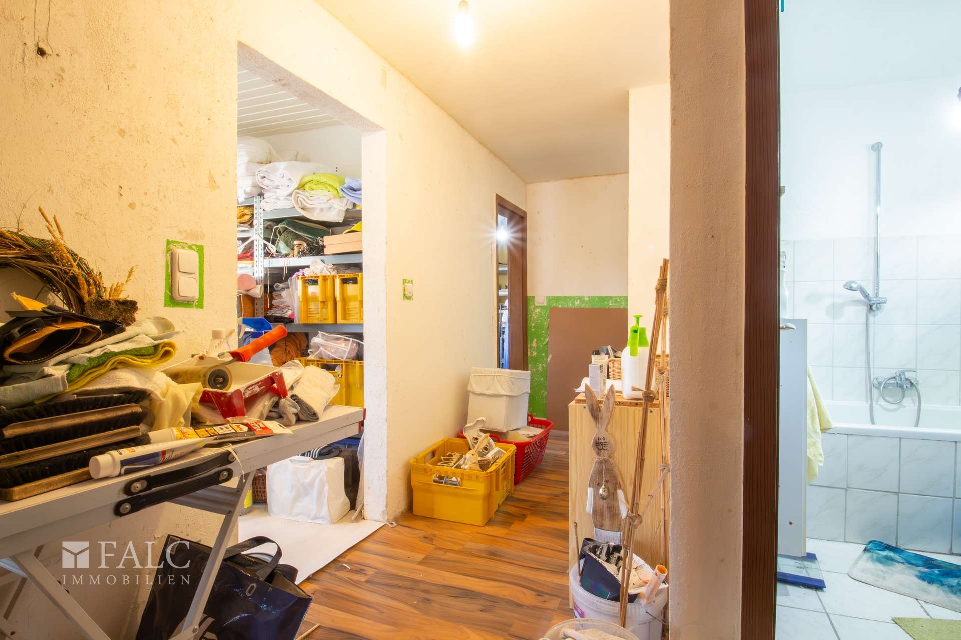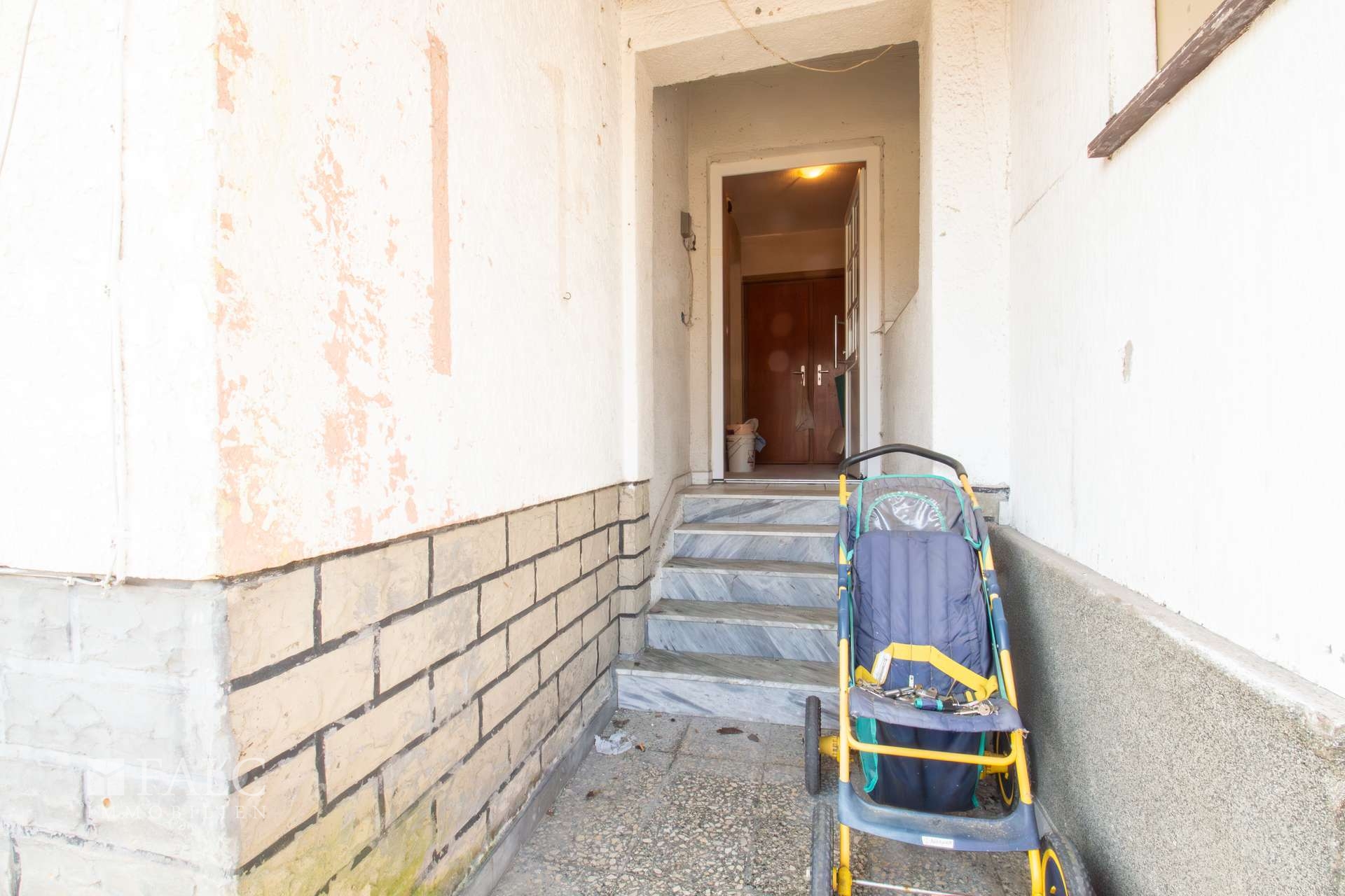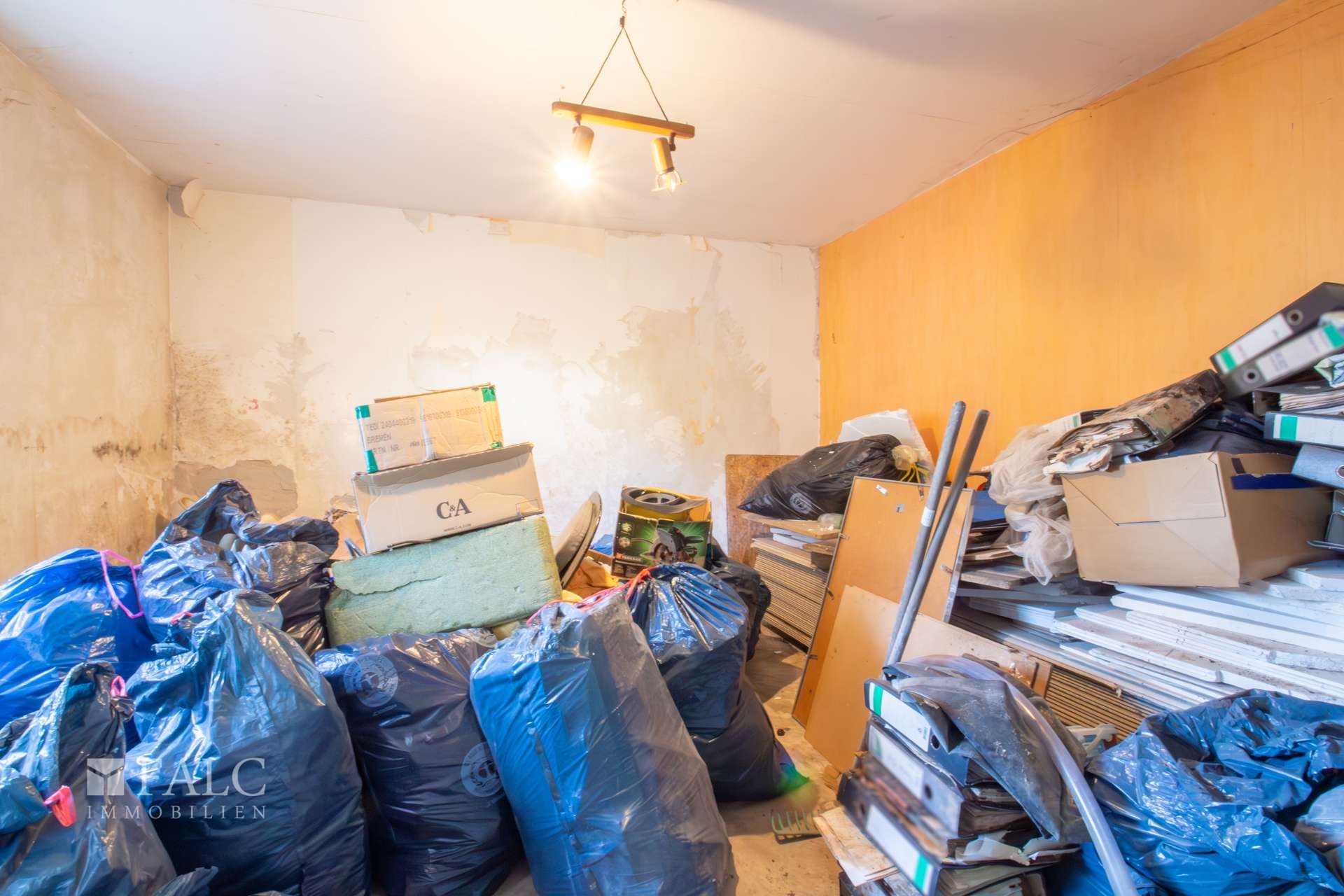 Im folgenden Text wird das linke Wohnhaus näher beschrieben. Es wurde ungefähr im Jahre 1957 errichtet und bietet eine Wohnfläche von ca. 174 m² verteilt auf mehreren Etagen. Es eröffnet damit vielfältige Nutzungsmöglichkeiten für Großfamilien oder auch für die Kombination aus Wohnen und Arbeiten unter einem Dach. Der Haupteingang befindet sich im Erdgeschoss und führt zunächst in eine Diele und anschließend in einen Flur. Von hier aus sind die wichtigsten Räume dieser Etage erreichbar. Dazu zählen eine Küche, eine Abstellkammer sowie ein großzügiges Wohn- und Esszimmer. Vom Flur aus besteht außerdem ein Zugang zum Garten- und Terrassenbereich sowie zur Treppe in das Obergeschoss. Hier befinden sich unter anderem ein Elternschlafzimmer mit einem angrenzenden Raum, der sich ideal als Ankleide nutzen lässt, ein Büro und ein Badezimmer. Vom Flur aus führt eine weitere Treppe in das ausgebaute Dachgeschoss. Hier stehen zwei zusätzliche Kinderzimmer, eine Abstellkammer und ein Spielzimmer mit einem angrenzenden Badezimmer zur Verfügung. Zurück im Flur des Erdgeschosses gelangt man außerdem in das Kellergeschoss des Wohnhauses. Hier befindet sich eine ca. 34 m² große Einliegerwohnung, die auch über einen separaten Außeneingang erreichbar ist. Zur Einliegerwohnung gehört eine Küche, eine Diele, ein Schlafzimmer und ein Badezimmer. Die Wohnung kann zum Beispiel für Gäste, Familienangehörige oder auch zur Vermietung genutzt werden. Das Wohnhaus befindet sich derzeit in einem renovierungs- bzw. sanierungsbedürftigen Zustand. In einigen Bereichen sind bereits vereinzelt Maßnahmen begonnen worden. Für den Käufer eröffnet sich dadurch die Möglichkeit, die Immobilie nach eigenen Vorstellungen zu gestalten und individuell zu modernisieren.