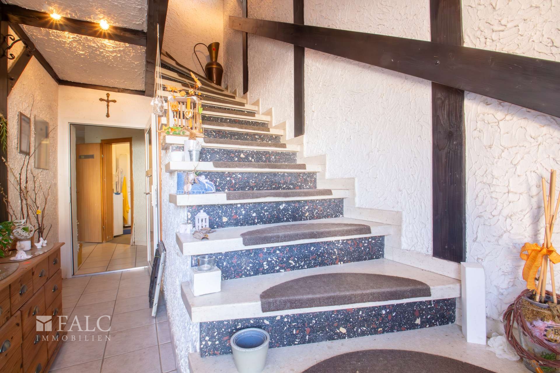 Im folgenden Text wird die Ausstattung des rechten Wohnhauses näher beschrieben. In den Wohnräumen des Wohnhauses sind die Böden im Erd- und Dachgeschoss mit Laminat und Fliesen ausgestattet. Die zweifachverglasten Aluminiumfenster mit Kunststoffbeschichtung von Schüco sind aus dem Jahre 2008. Alle Fenster sind mit Rollläden ausgestattet. Die Terrassen- und Ausgangstüren sind ebenfalls aus Aluminium mit Kunststoffbeschichtung von Schüco. Als Innentüren wurden braune Holztüren verwendet. Die Verbindung vom Erd- ins Dachgeschoss erfolgt über eine massive Treppe. Das Haus wird zusammen mit der anderen Haushälfte über ein gasbetriebenes Blockheizkraftwerk aus dem Jahre 2016 beheizt. In allen Wohnräumen sind Heizkörper vorhanden. Die Warmwassererzeugung erfolgt ebenfalls über das Blockheizkraftwerk. Das Badezimmer im Erdgeschoss ist halbhoch mit hellen Fliesen gefliest und mit zeitgemäßen Sanitärobjekten ausgestattet. Es verfügt über eine bodengleiche Dusche. Das Badezimmer im Obergeschoss ist halbhoch mit hellen Fliesen gefliest und mit zeitgemäßen Sanitärobjekten ausgestattet. Es verfügt über eine Badewanne. Die Toilette ist vom Badezimmer separiert angeordnet. Ein Glasfaseranschluss ist bereits vorhanden. Das Dach des Wohnhauses ist mit Dachpfannen eingedeckt.