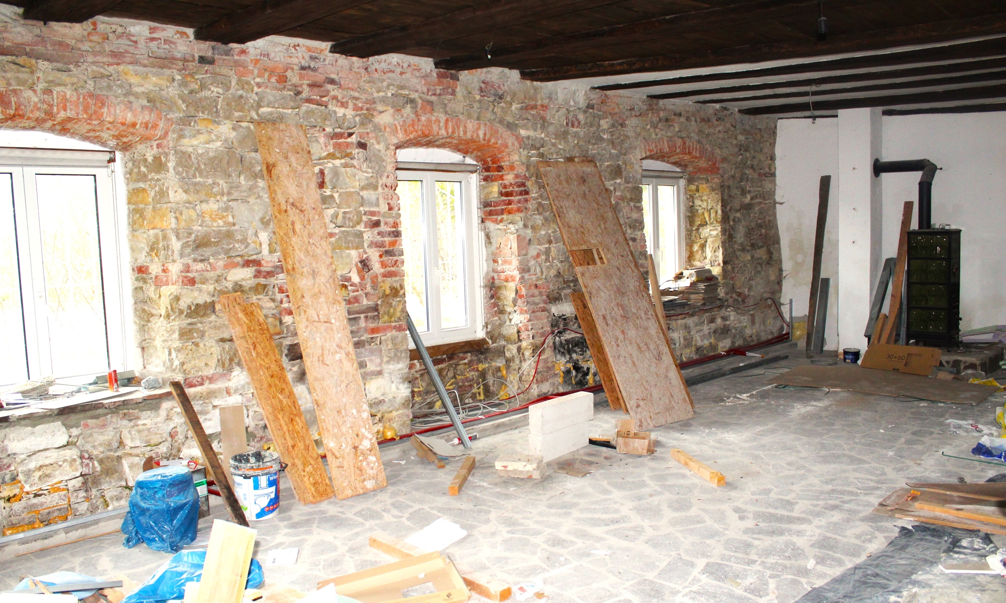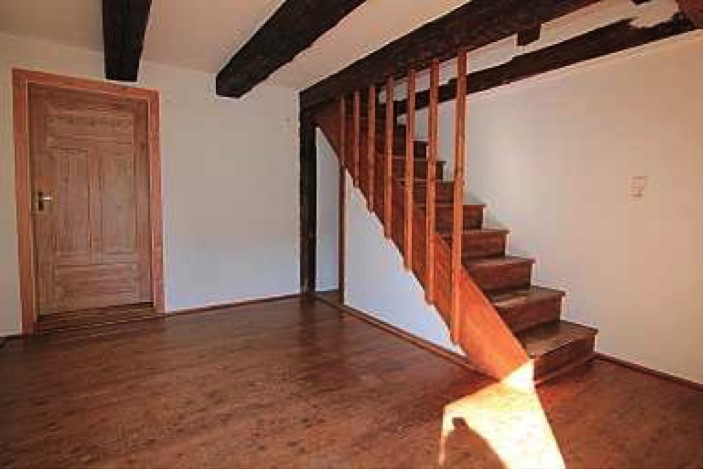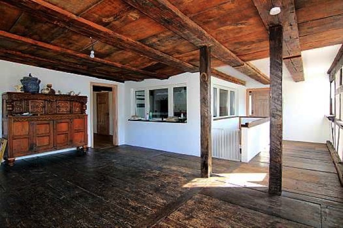 Kräftige Holzbalken und der ursprüngliche Steinboden sorgen für ein ganz besonderes Ambiente im Erdgeschoss. Der antike Kachelofen unterstreicht den historischen Charme.