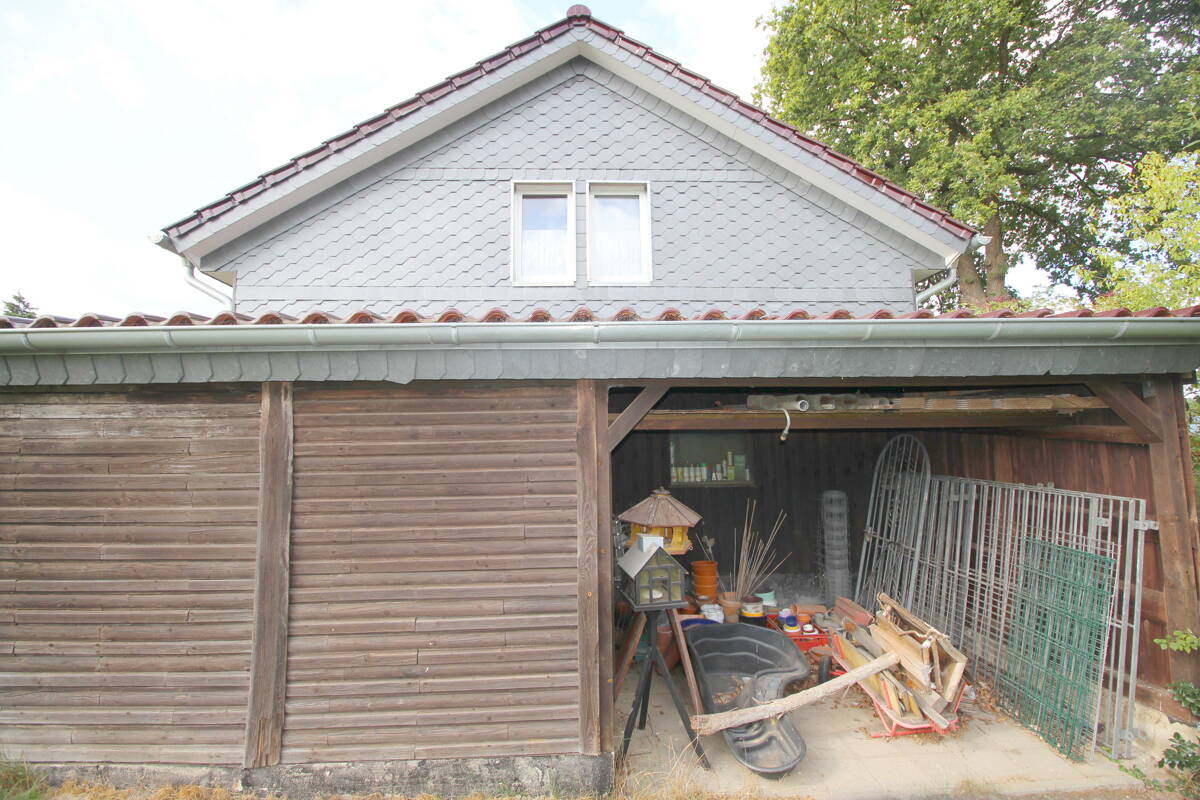 II. NEBENHAUS (BJ 1973 & umfangreiche Renovierungen bis 2019/2022) + insg. ca. 68 m² Wohnfläche, davon 18,5 m² EG u. 48,9 DG + Nutzfläche ca. 54 m² mit Remise, Diele, Heizraum u. Schuppen + komplette Dachsanierung analog Haupthaus mit Tonziegeln (Ende 2019) + Überdachungen mit Endmontage Ende 2022 + Küchenzeile im EG mit Spüle, Geschirrspüler, Herd u. Kühlkombi + 1 Duschbad (DG) u. 1 Gäste-WC (EG) + Kaminanschluss im Wohnzimmer vorhanden (DG) + eigene Einfahrt mit PKW-Stellplätzen und 2 Hauseingängen + Gas-Zentralheizung v. Viessmann: BJ 1998 mit 120 l Trinkwasserspeicher + Energie-Verbrauchsausweis mit 152,03 kWh/(m²*a) u. EEK "E"