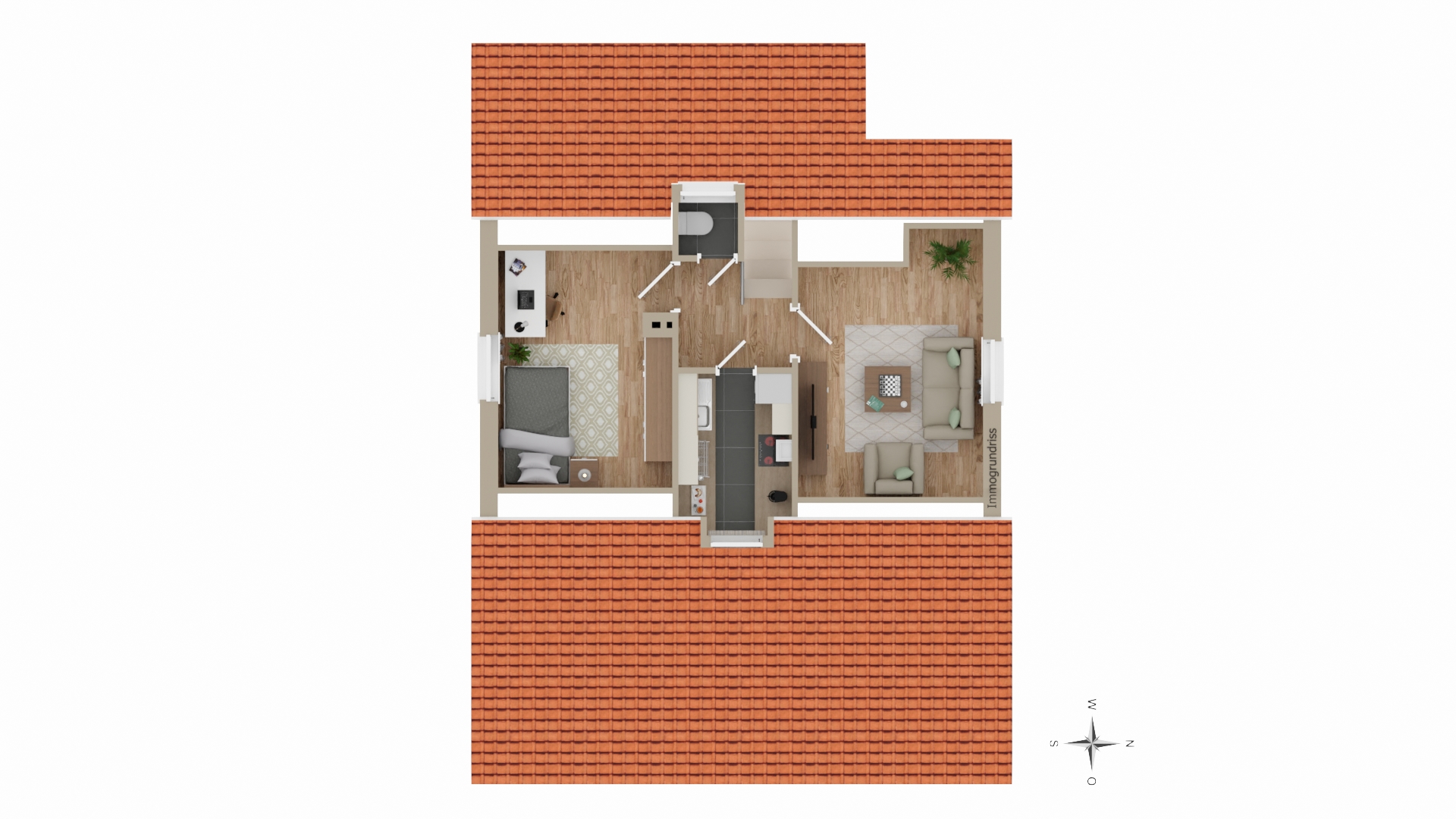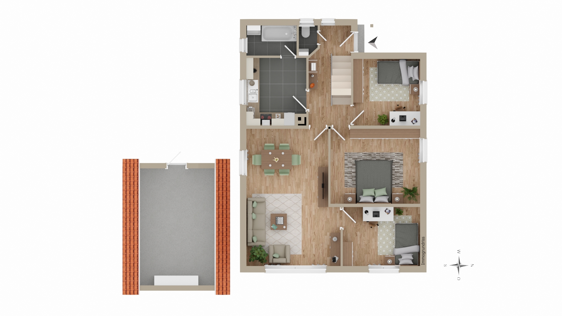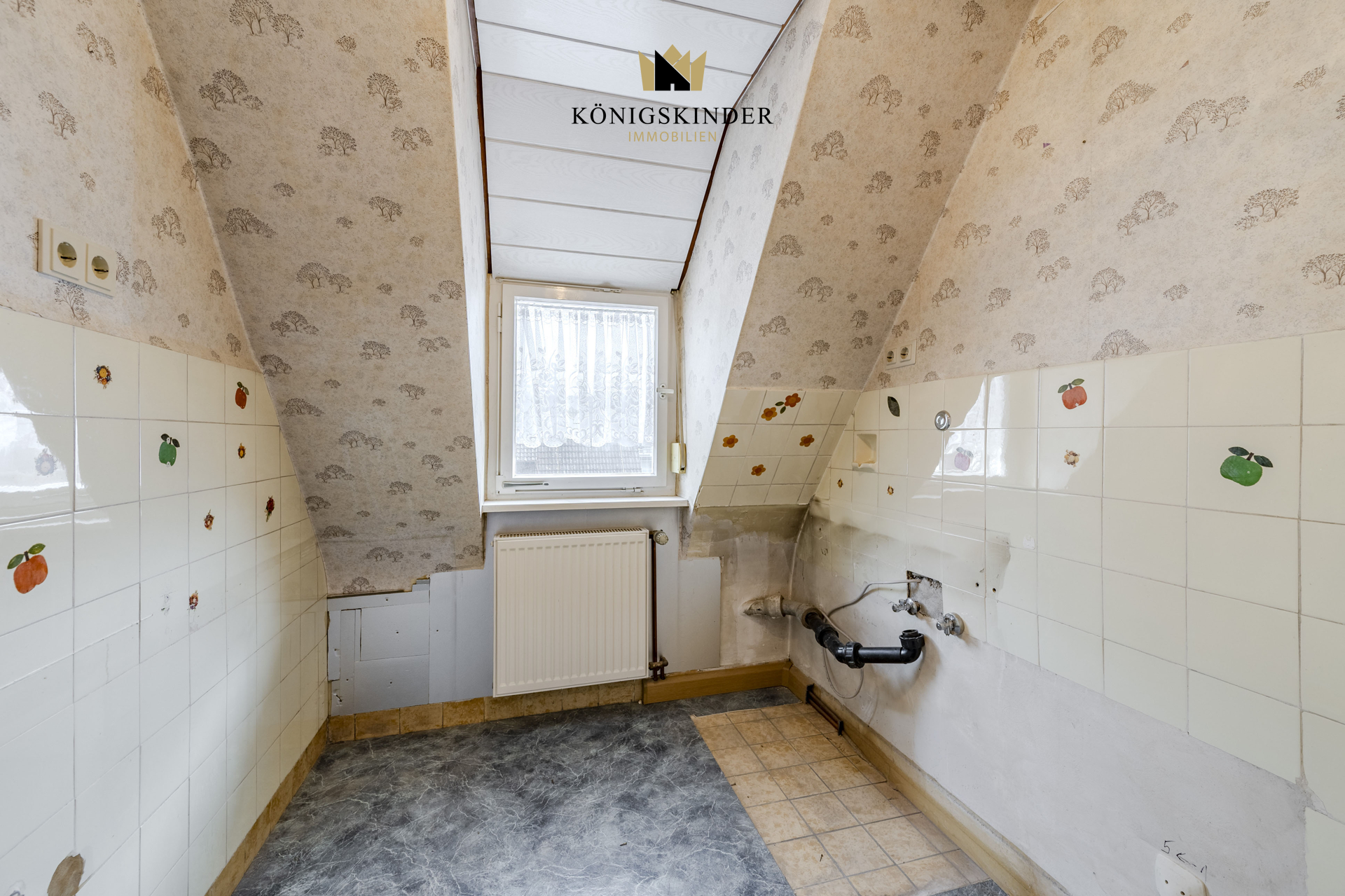 Dachgeschoss: - zwei Schlafräume - Küche - separates WC - Stauraum in Dachschräge