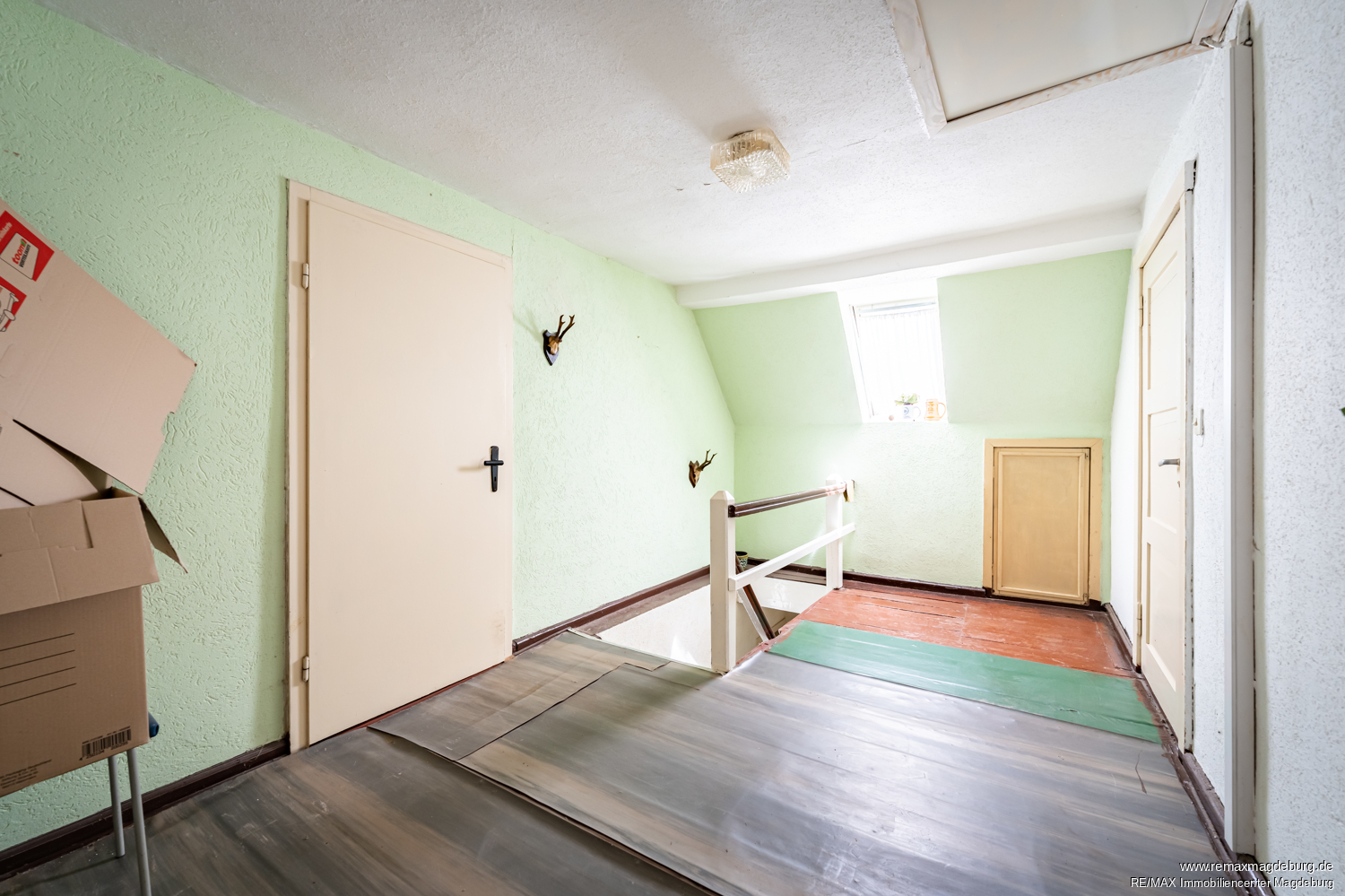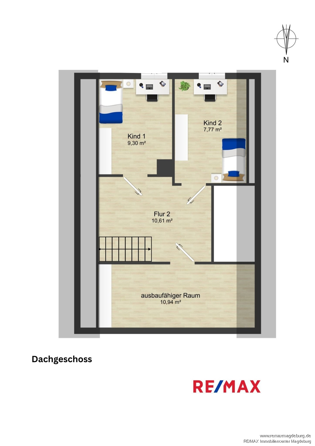 Über eine Treppe im Flur gelangen Sie ins Dachgeschoss, das zusätzlichen Wohnraum bereithält. Der dortige Flur führt in zwei separate Zimmer, die sich ideal als Kinder-, Arbeits- oder Gästezimmer nutzen lassen. Zudem gibt es einen weiteren Raum, der derzeit noch nicht vollständig ausgebaut ist – eine perfekte Gelegenheit, Ihren individuellen Vorstellungen freien Lauf zu lassen, sei es als zusätzliches Schlafzimmer, Atelier oder Hobbyraum.